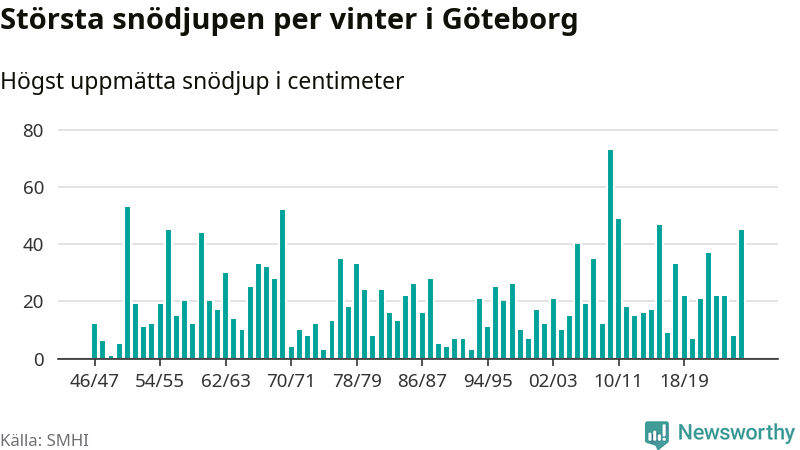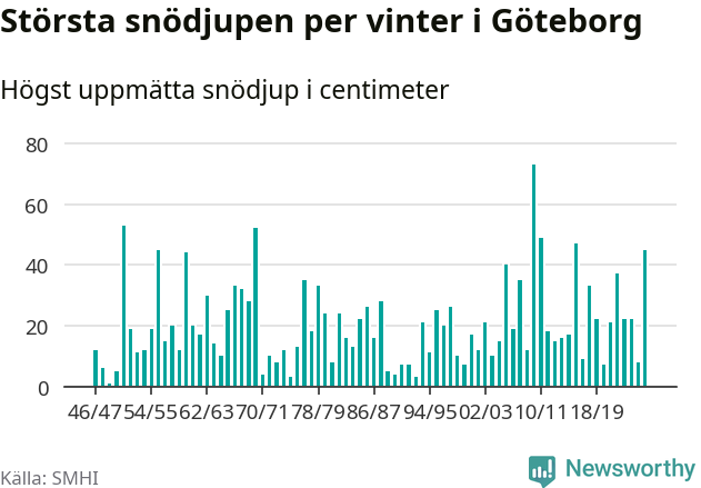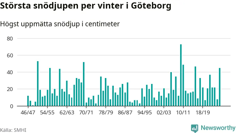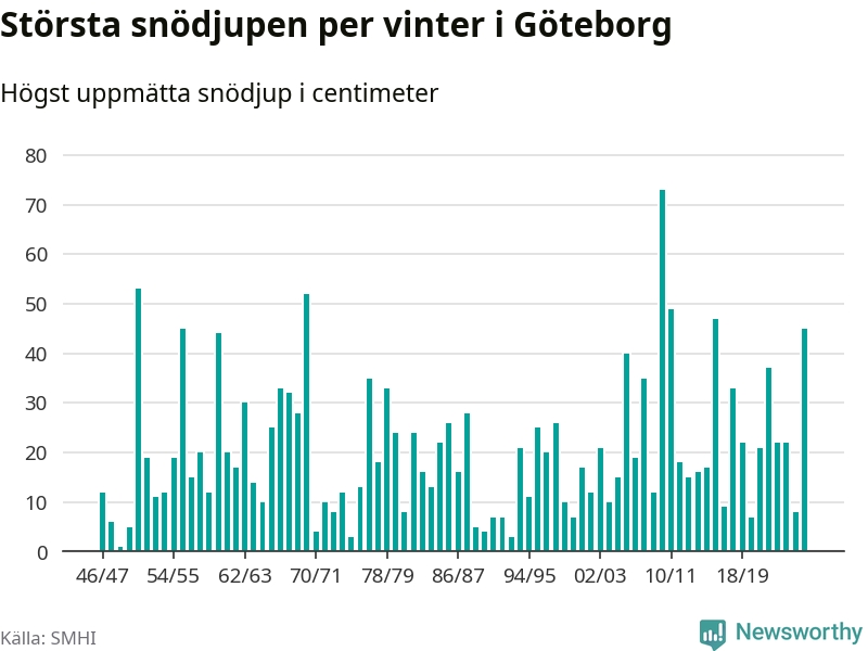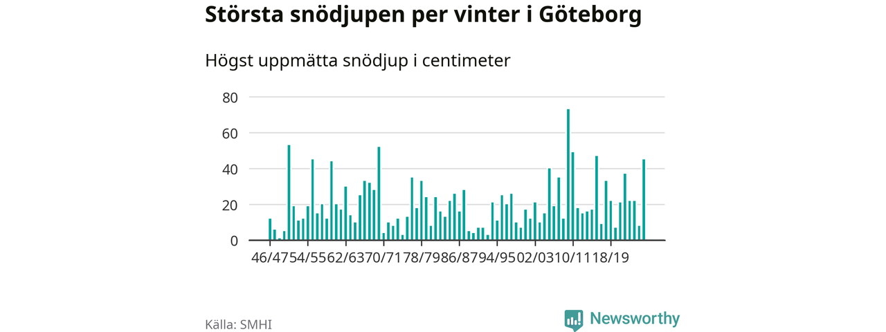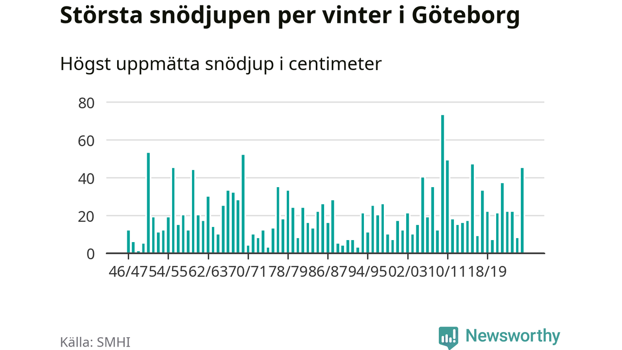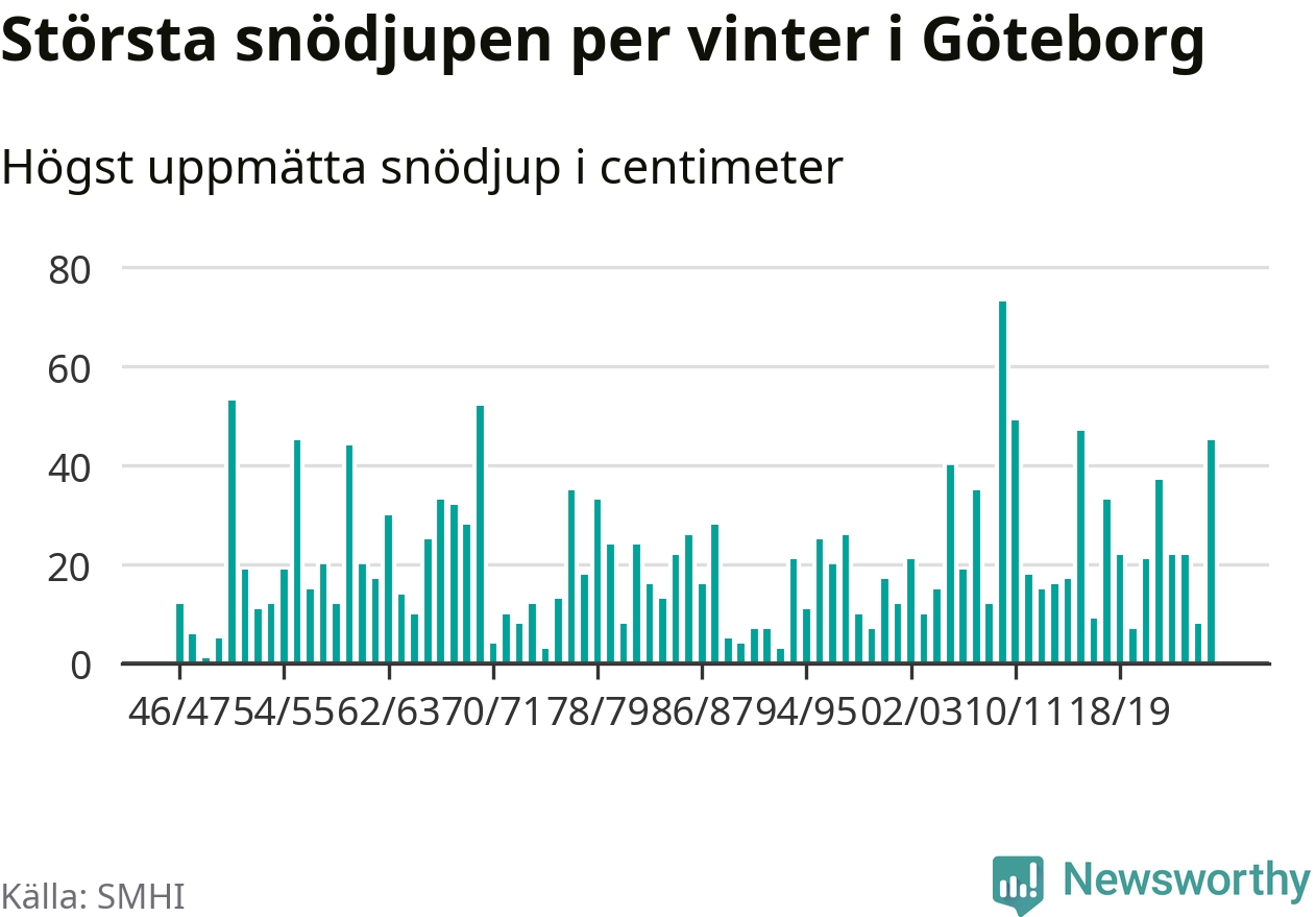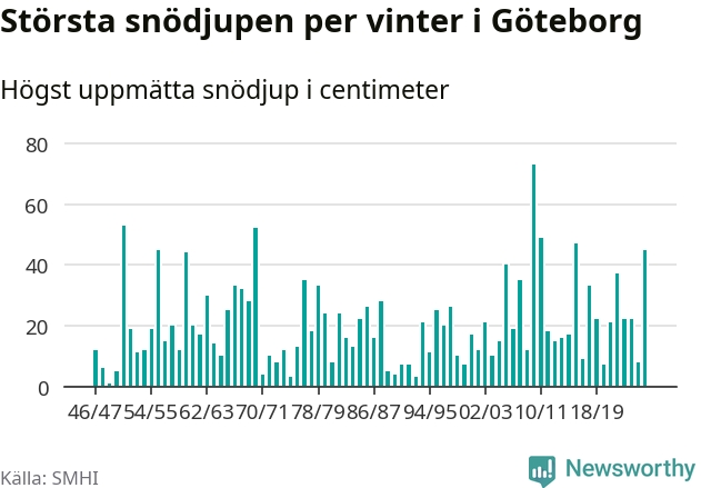 Men hur står sig det snödjupet historiskt sett? Newsworthy har tittat på det största snödjup som SMHI har uppmätt i Göteborgs kommun varje år sedan vintern 1946/47. Fem vintrar har det uppmätts större snödjup.
