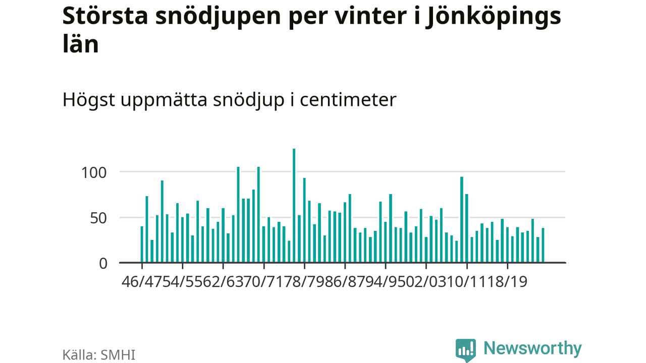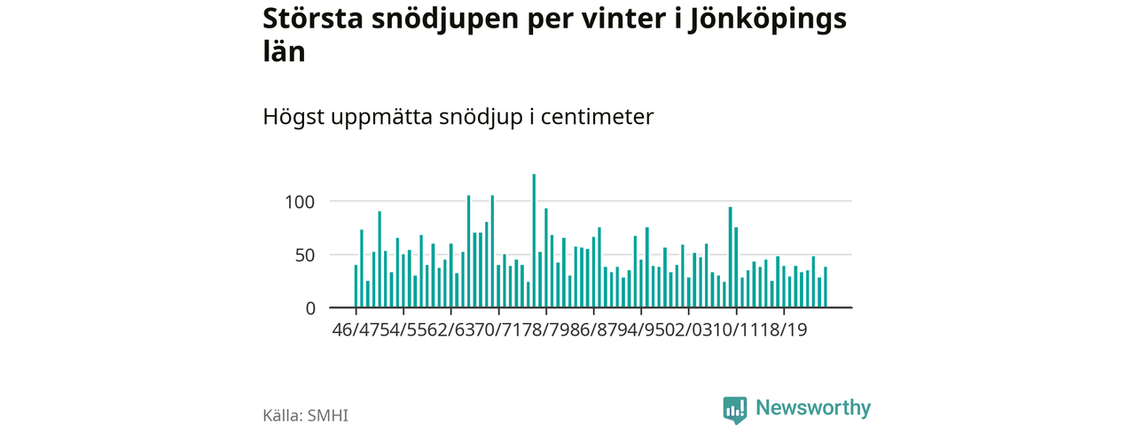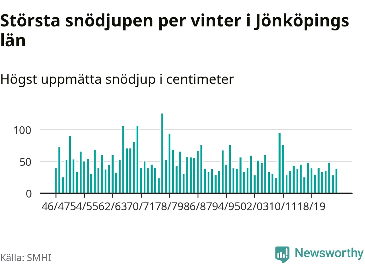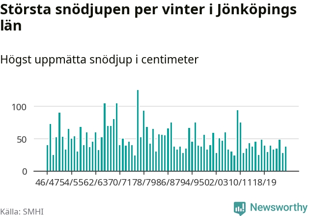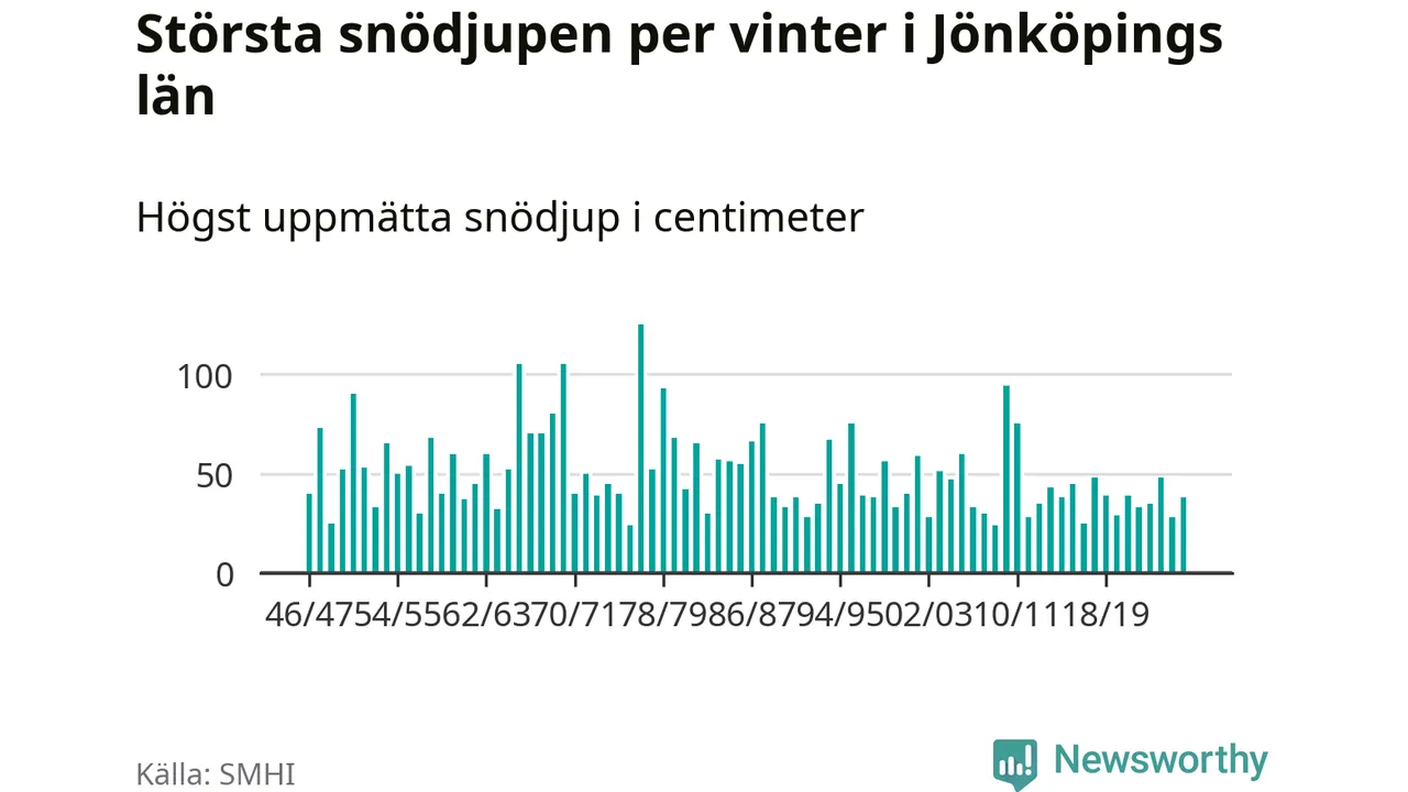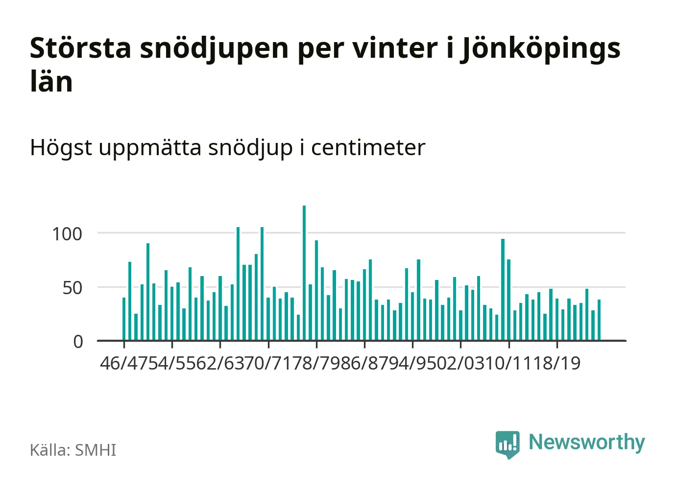 Men hur står sig det snödjupet historiskt sett? Newsworthy har tittat på det största snödjup som SMHI har uppmätt i Jönköpings län varje år sedan vintern 1946/47 – och hittills tar sig årets vinter inte in bland de 25 vintrarna med störst uppmätt snödjup i länet.