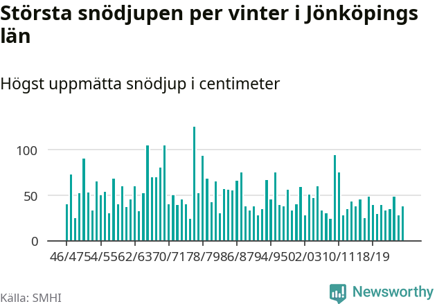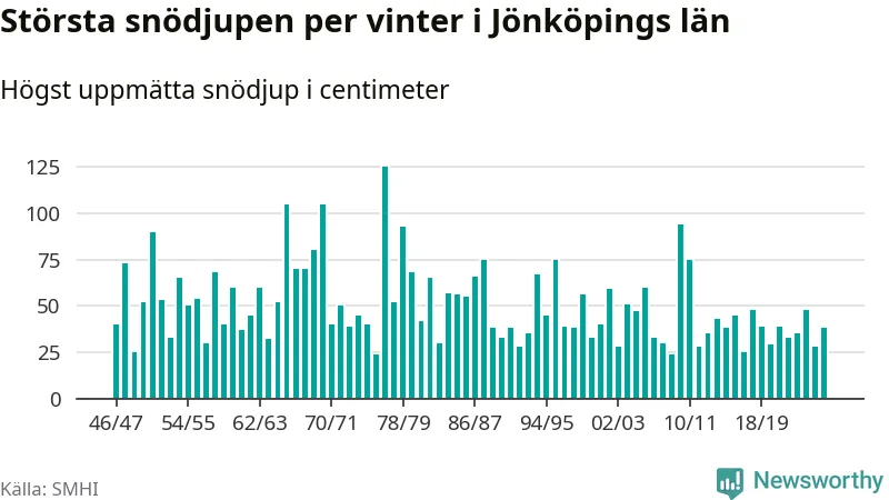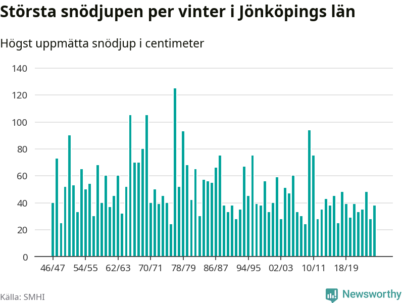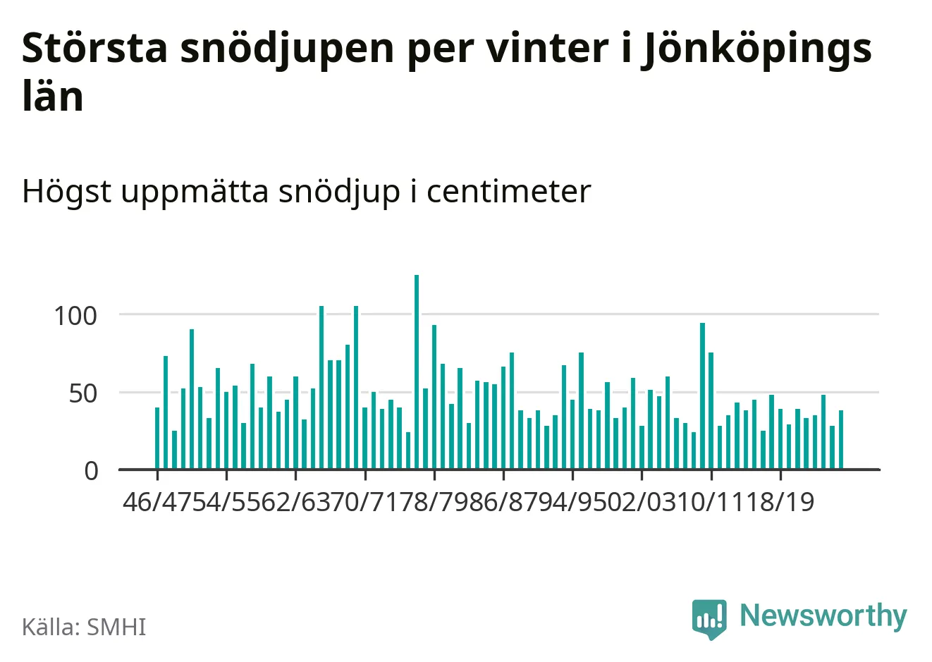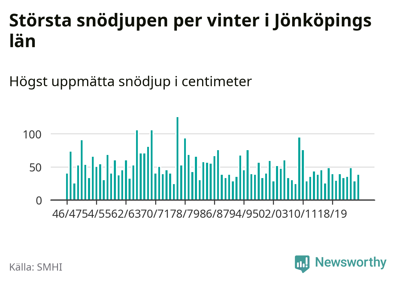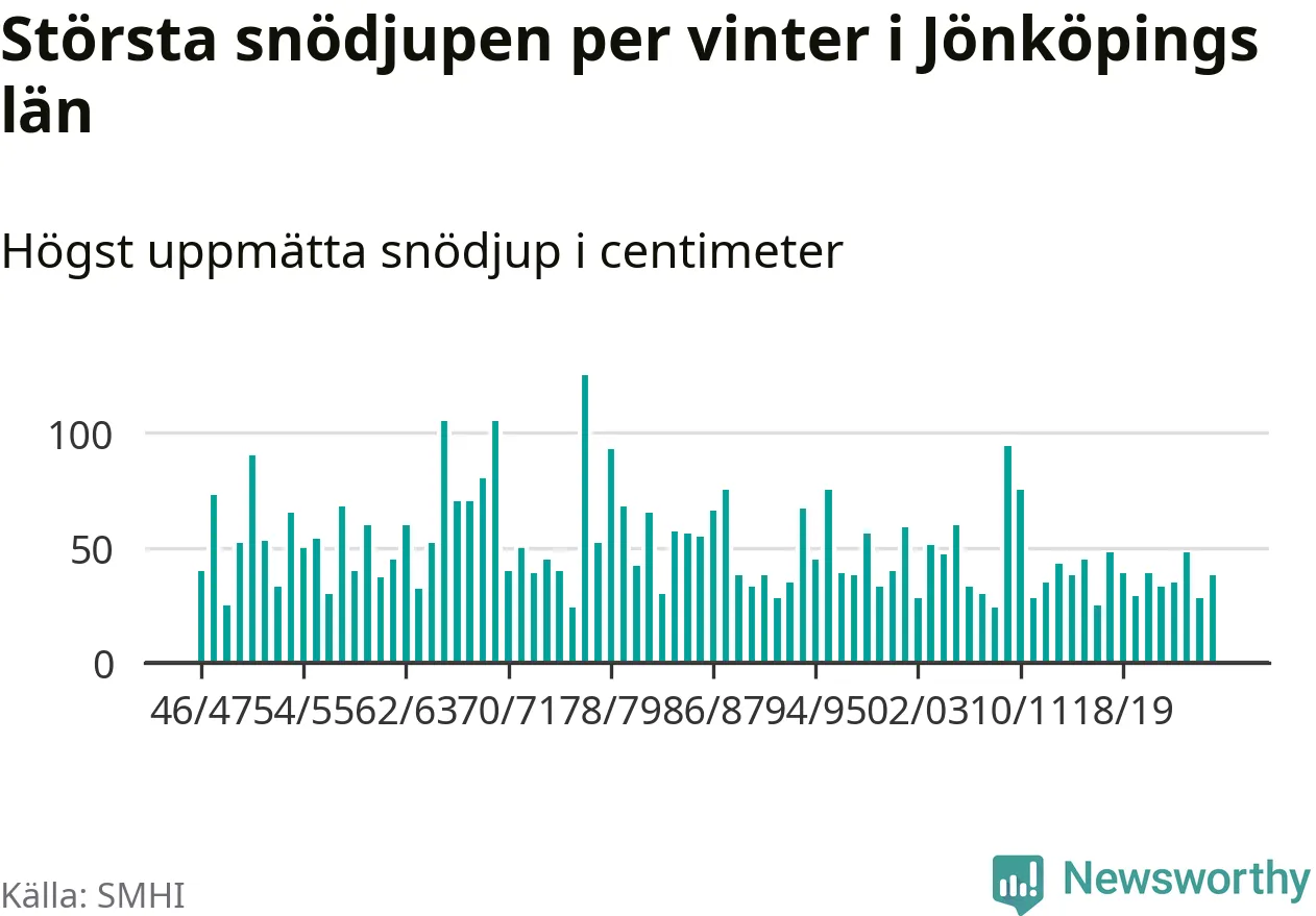 Men hur står sig det snödjupet historiskt sett? Newsworthy har tittat på det största snödjup som SMHI har uppmätt i Jönköpings län varje år sedan vintern 1946/47 – och hittills tar sig årets vinter inte in bland de 25 vintrarna med störst uppmätt snödjup i länet.