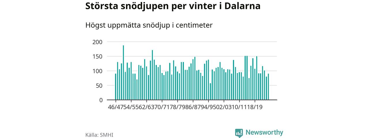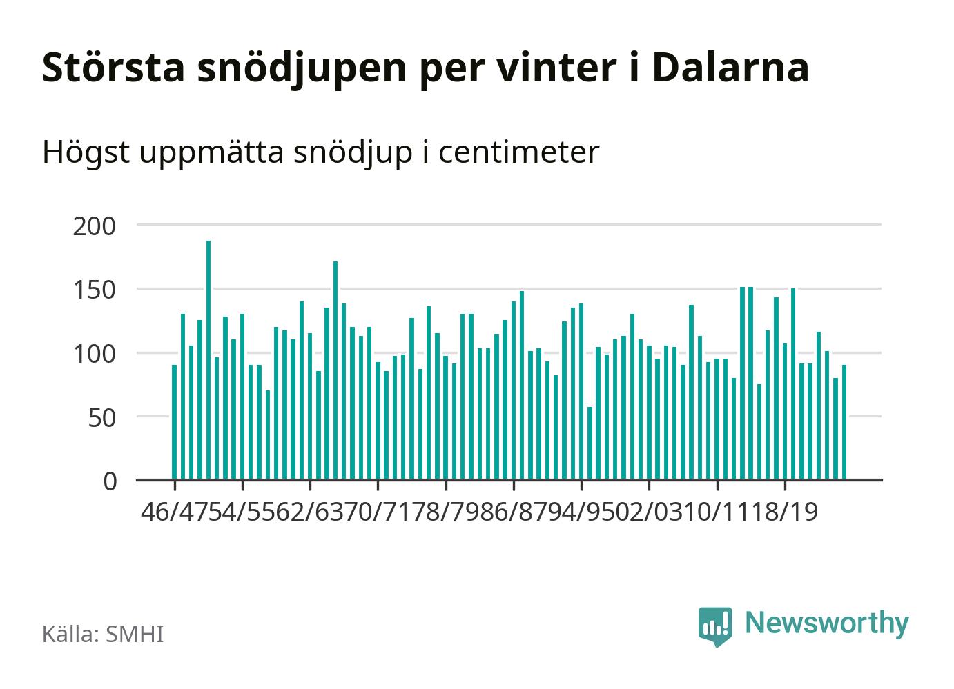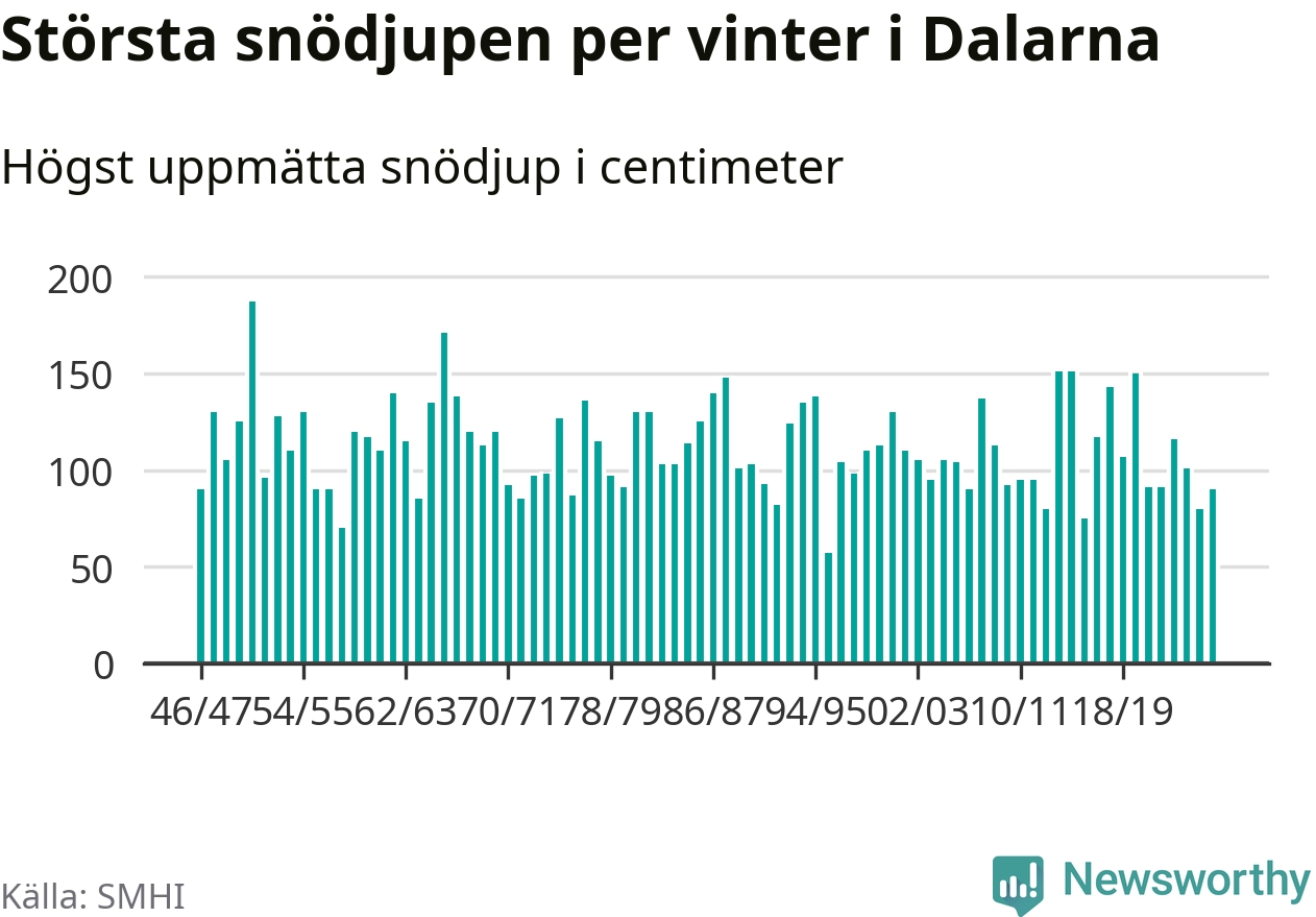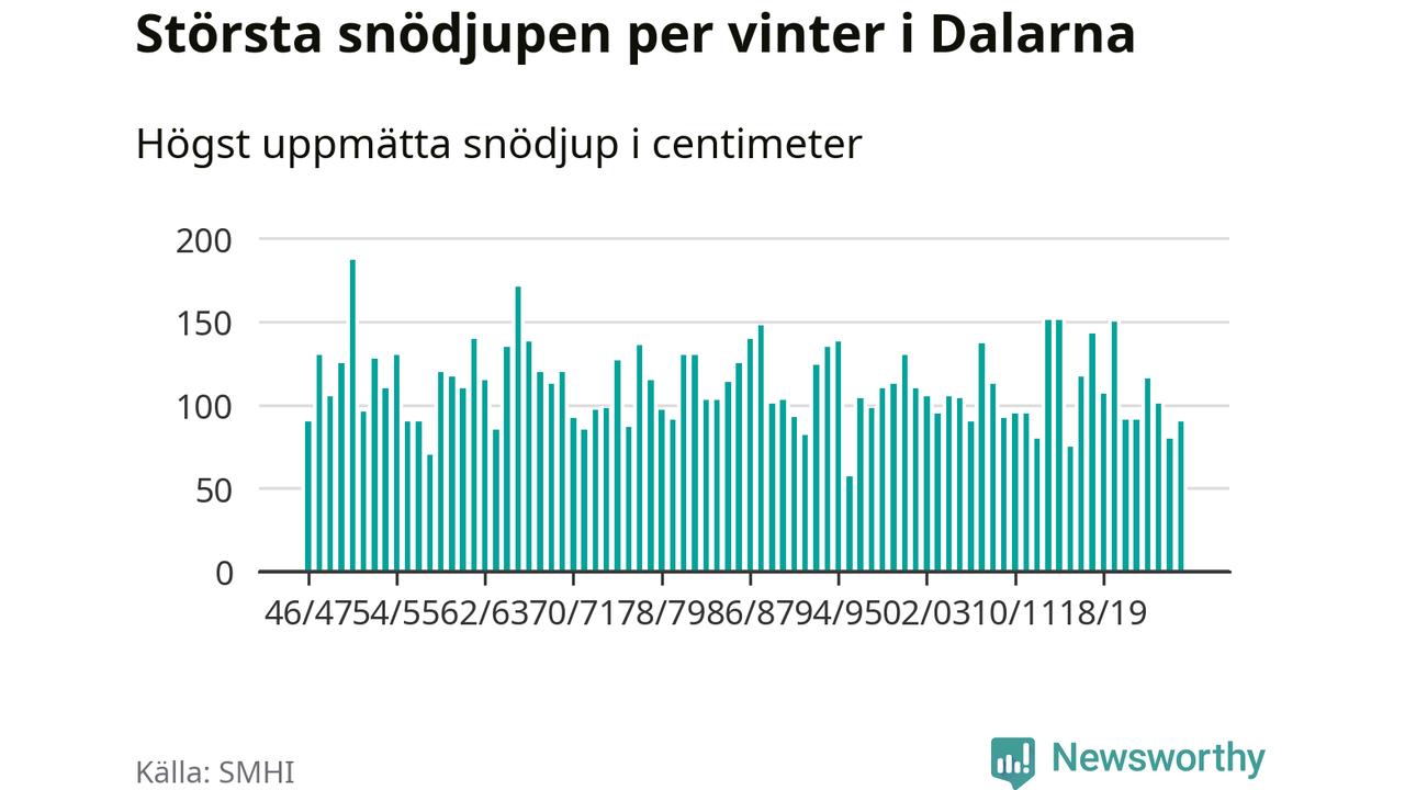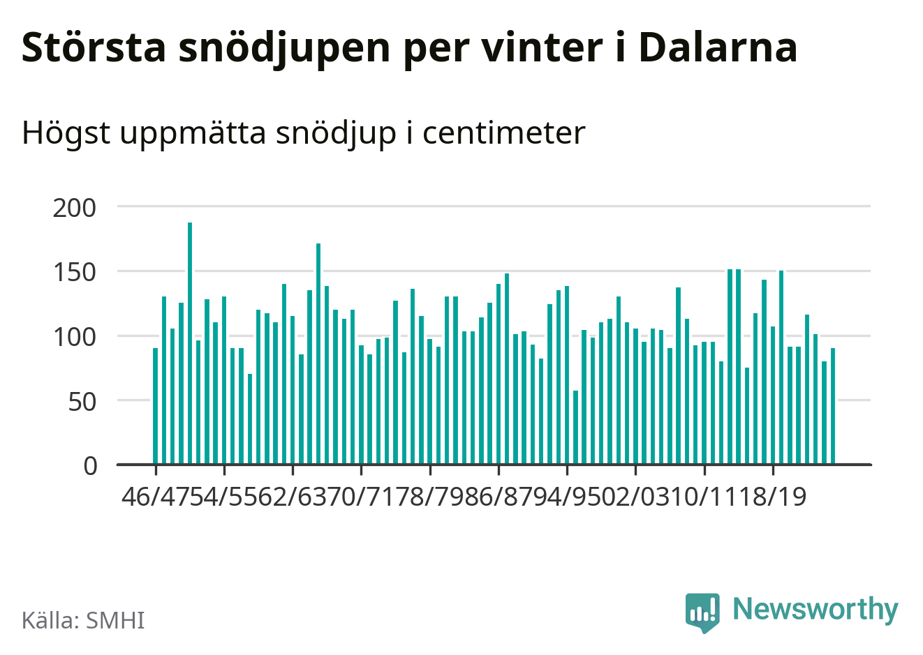 Men hur står sig det snödjupet historiskt sett? Newsworthy har tittat på det största snödjup som SMHI har uppmätt i Dalarnas län varje år sedan vintern 1946/47 – och hittills tar sig årets vinter inte in bland de 25 vintrarna med störst uppmätt snödjup i länet.
