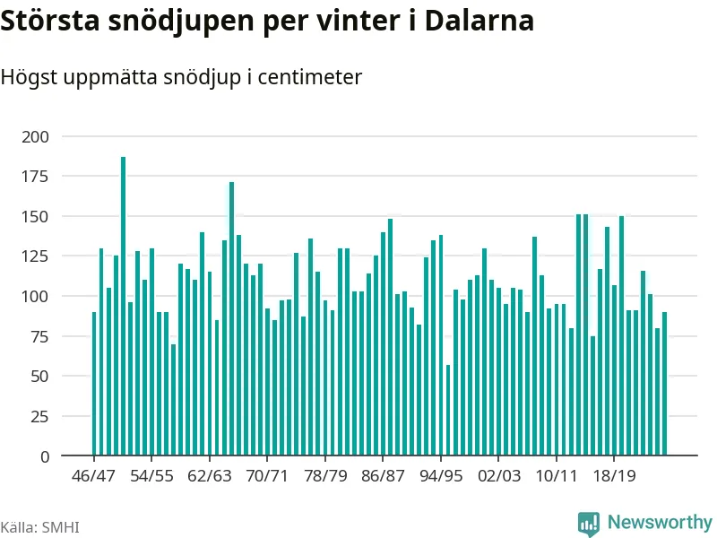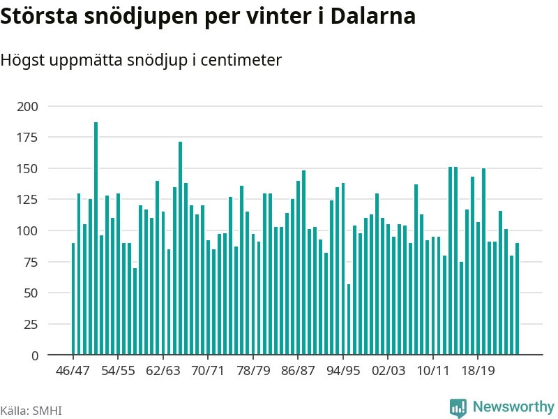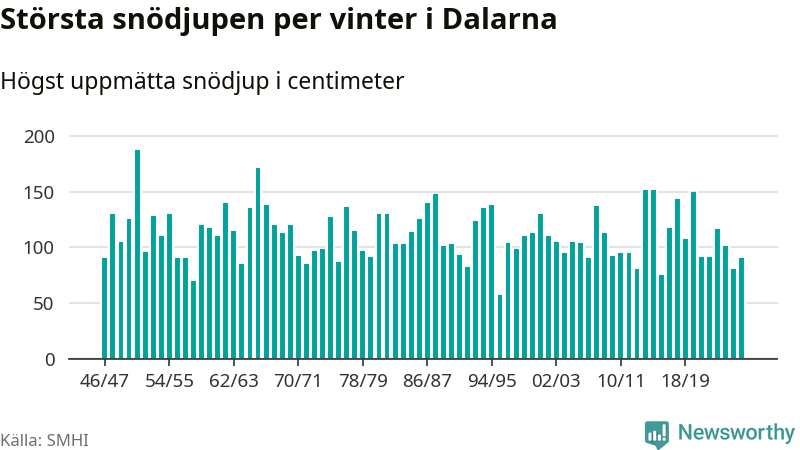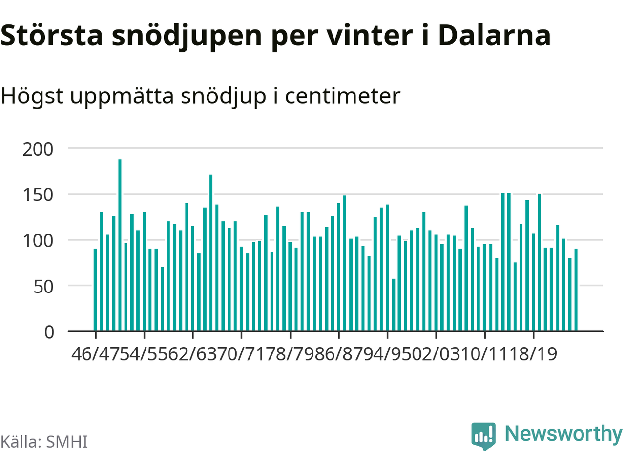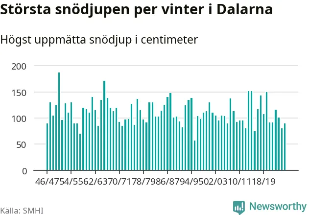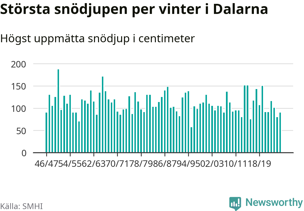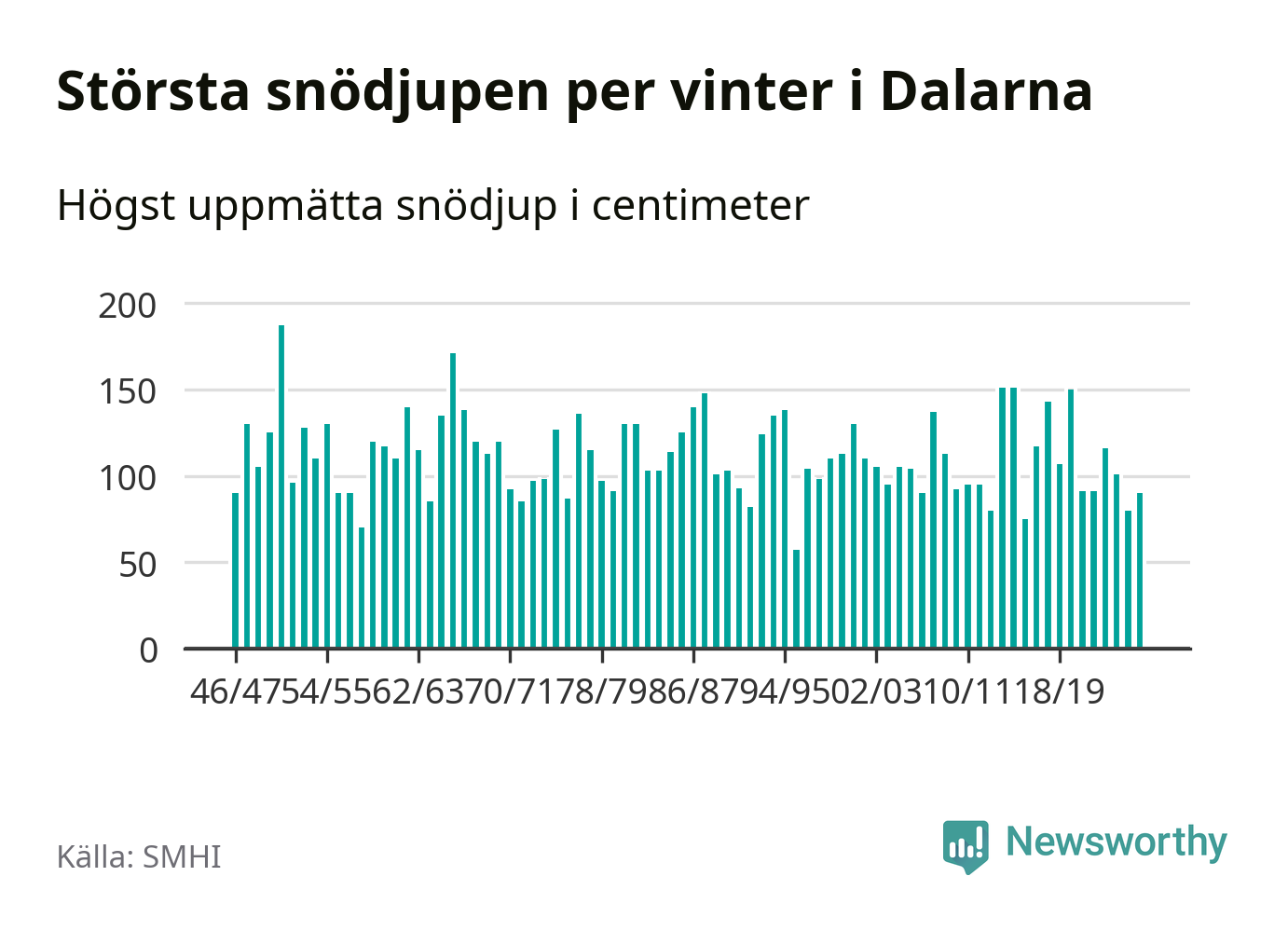 Men hur står sig det snödjupet historiskt sett? Newsworthy har tittat på det största snödjup som SMHI har uppmätt i Dalarnas län varje år sedan vintern 1946/47 – och hittills tar sig årets vinter inte in bland de 25 vintrarna med störst uppmätt snödjup i länet.