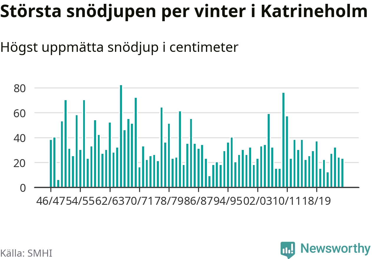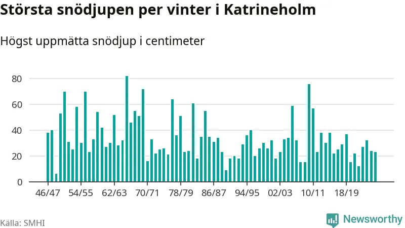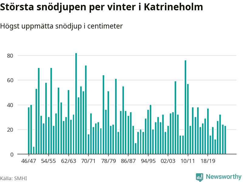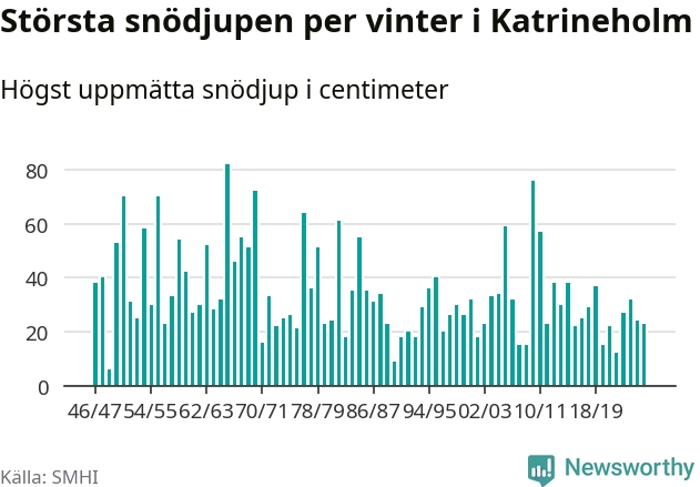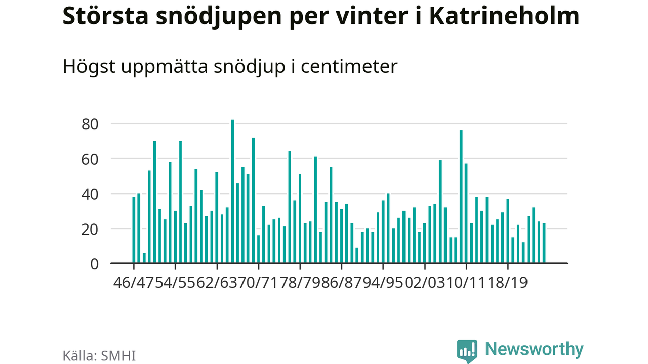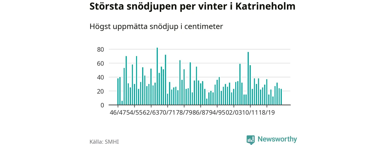 Men hur står sig det snödjupet historiskt sett? Newsworthy har tittat på det största snödjup som SMHI har uppmätt i Katrineholms kommun varje år sedan vintern 1946/47 – och hittills tar sig årets vinter inte in bland de 25 vintrarna med störst uppmätt snödjup i kommunen.