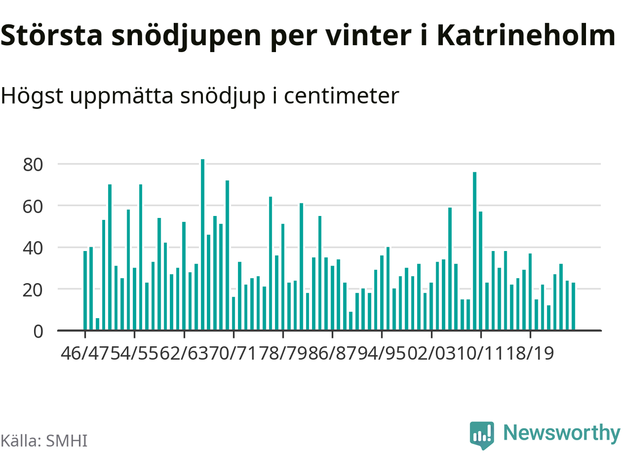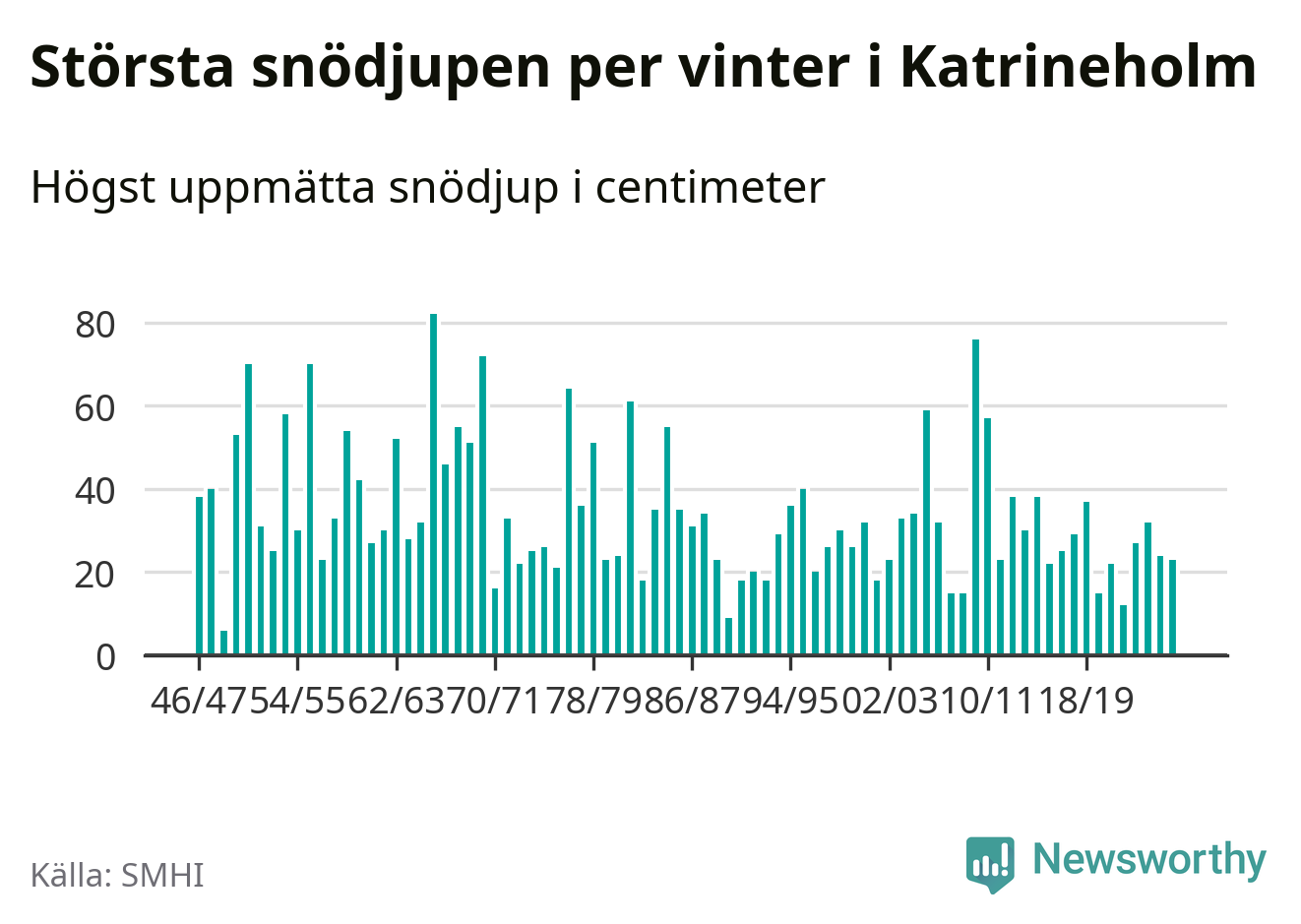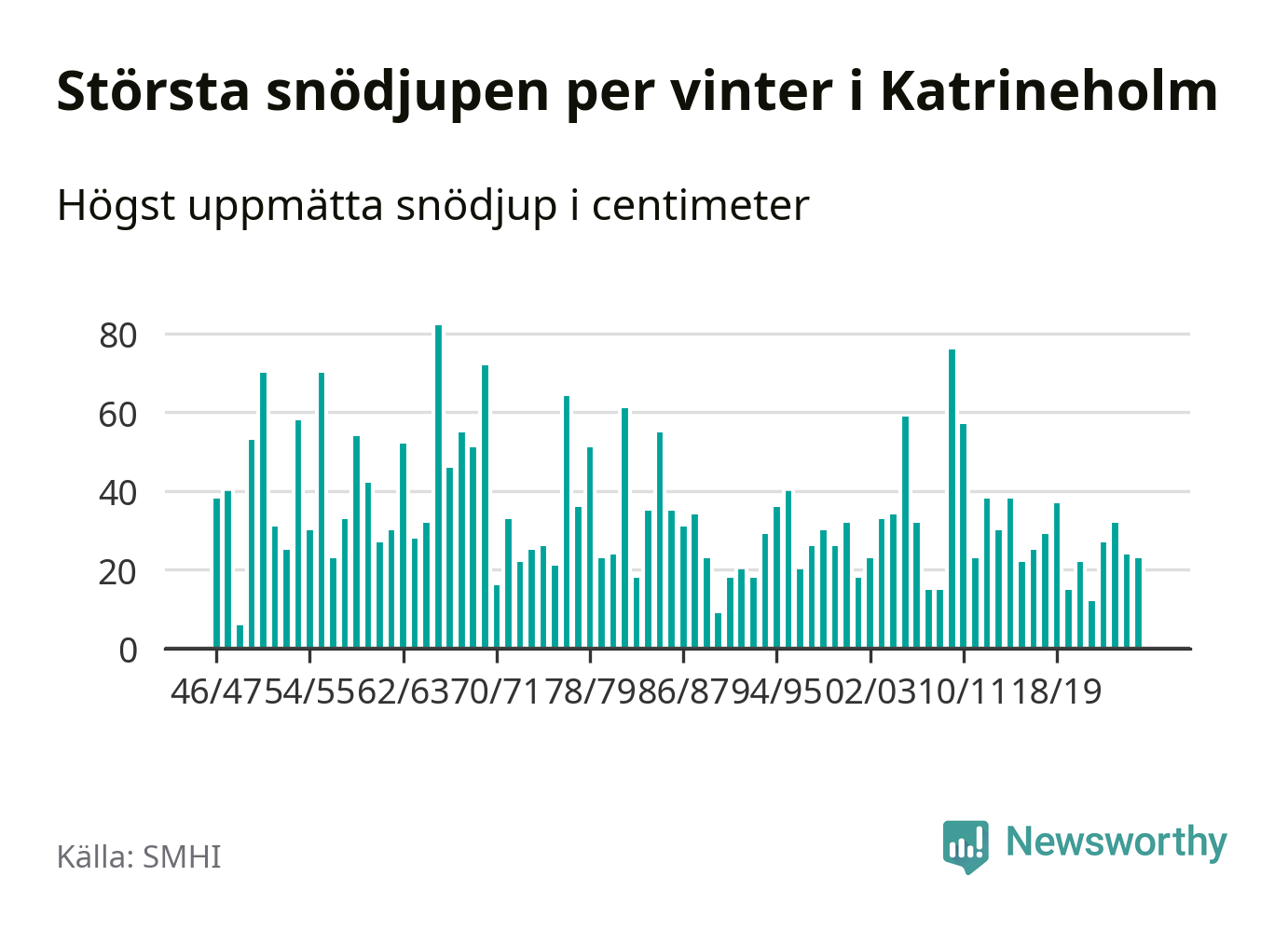 Men hur står sig det snödjupet historiskt sett? Newsworthy har tittat på det största snödjup som SMHI har uppmätt i Katrineholms kommun varje år sedan vintern 1946/47 – och hittills tar sig årets vinter inte in bland de 25 vintrarna med störst uppmätt snödjup i kommunen.