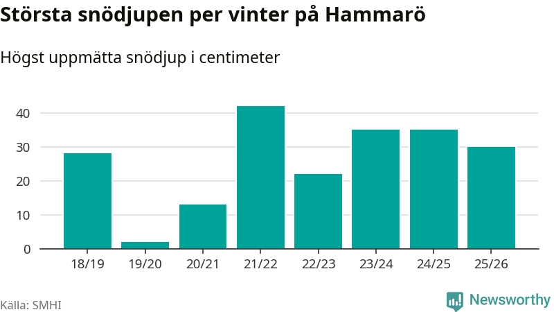 Det största snödjupet i kommunen uppmättes i februari 2022, 42 centimeter. Årets hittills högsta notering är alltså tolv centimeter lägre.