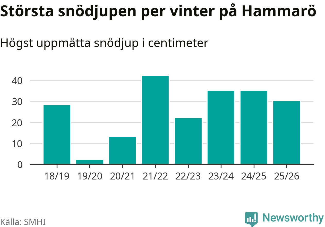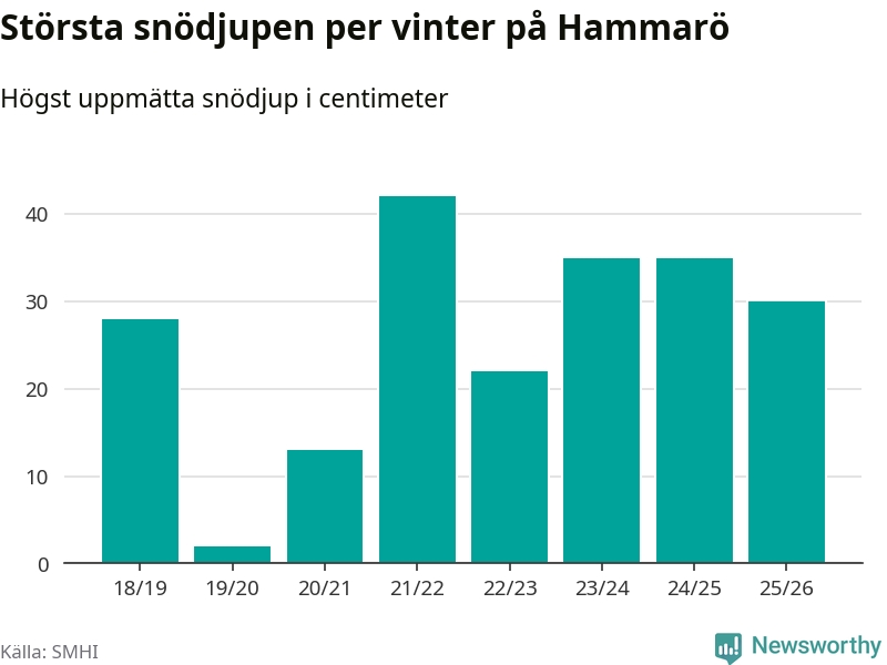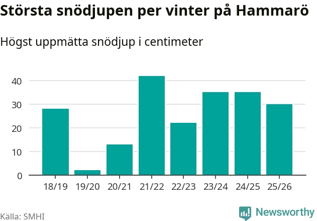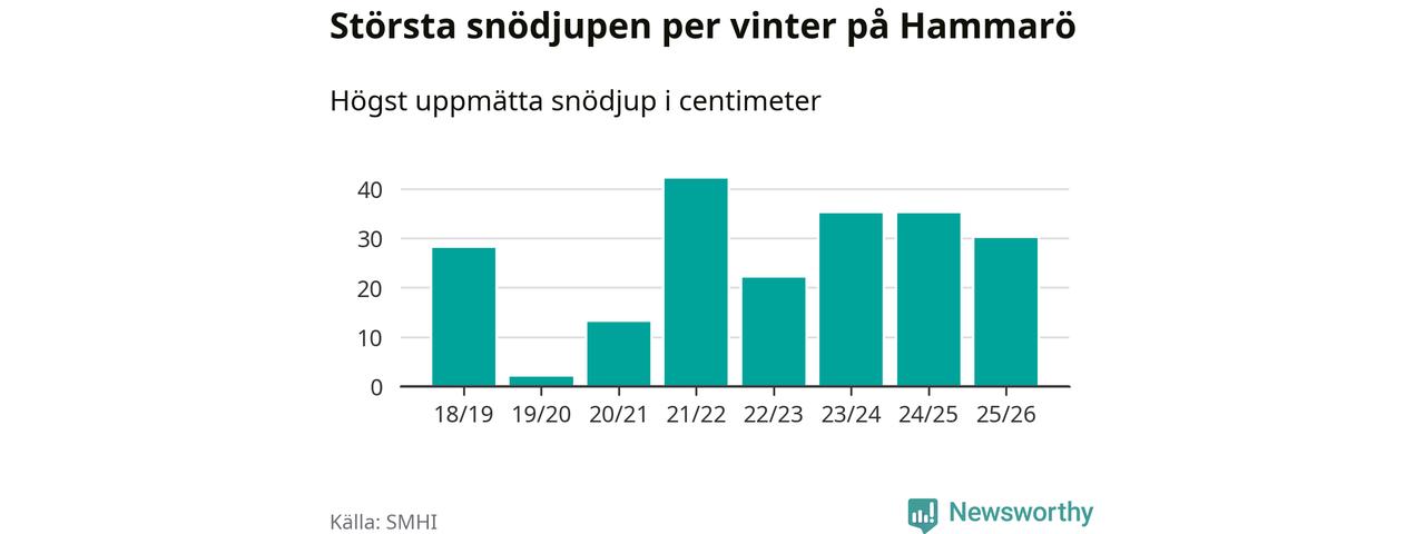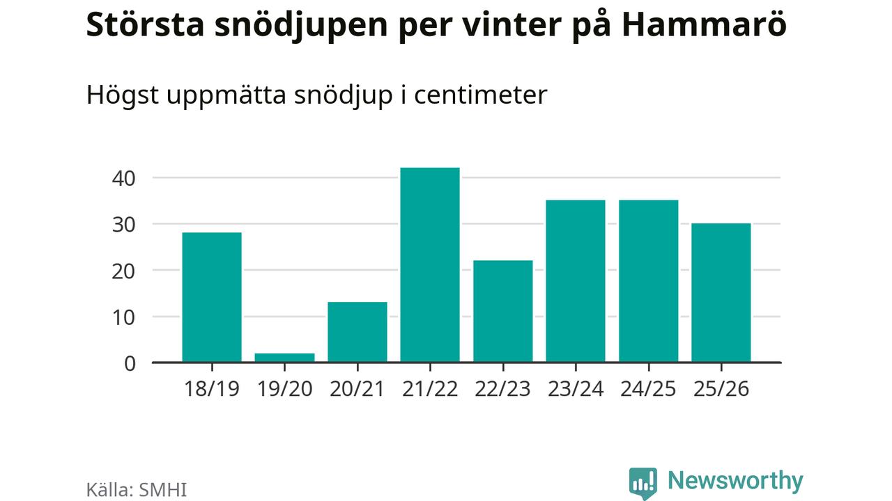 Men hur står sig det snödjupet historiskt sett? Newsworthy har tittat på det största snödjup som SMHI har uppmätt i Hammarö kommun varje år sedan vintern 2018/19, som är den första vi har data för – och hittills är årets vinter den med fjärde största uppmätta snödjup i kommunen.