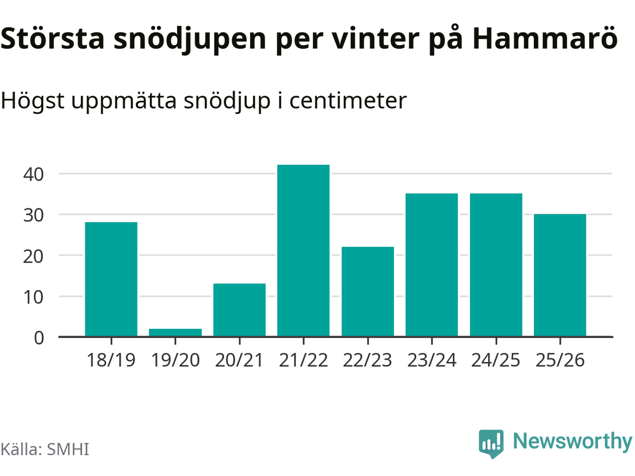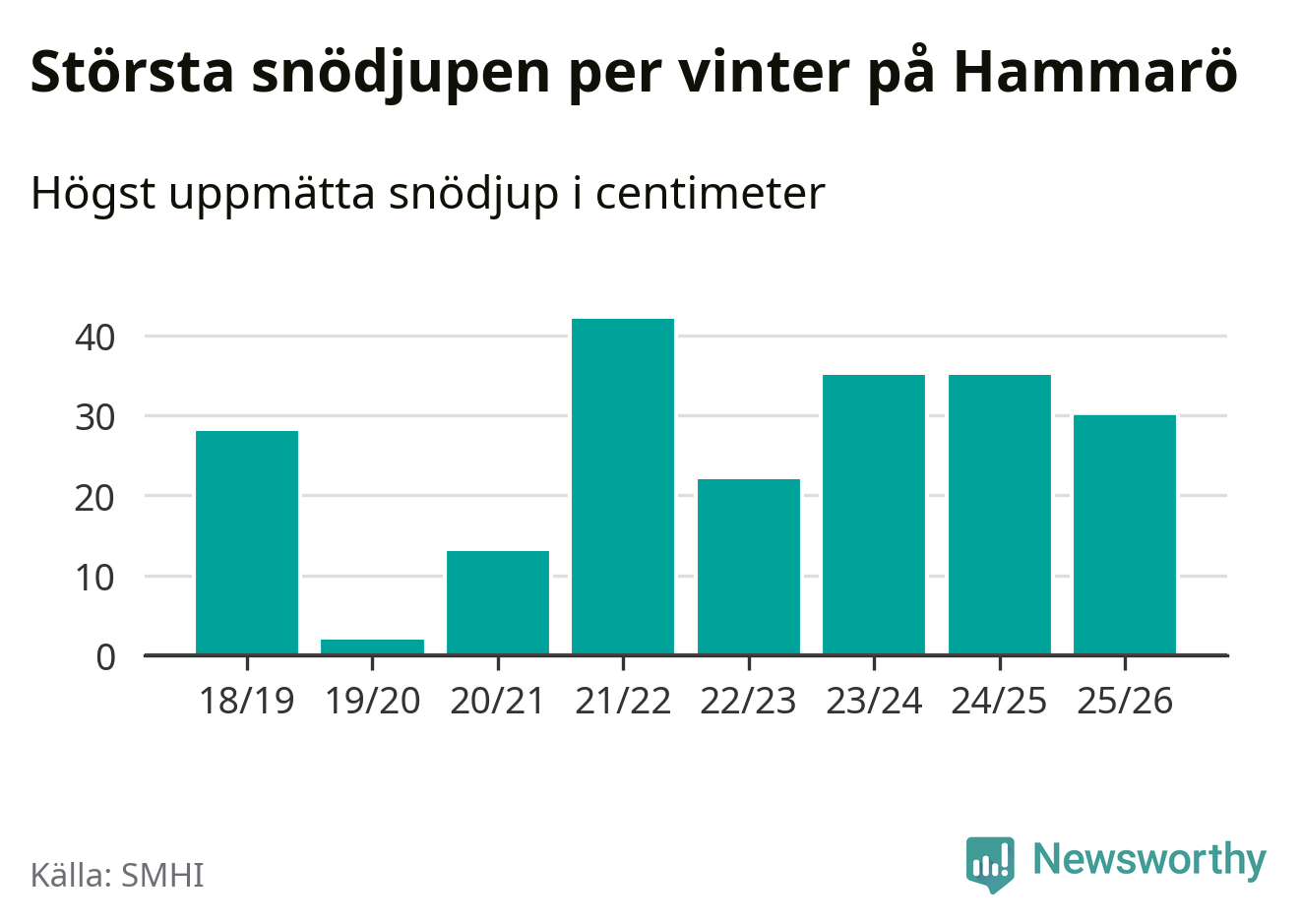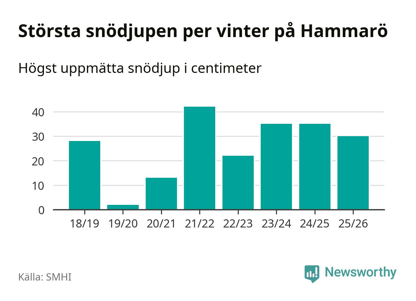 Men hur står sig det snödjupet historiskt sett? Newsworthy har tittat på det största snödjup som SMHI har uppmätt i Hammarö kommun varje år sedan vintern 2018/19, som är den första vi har data för – och hittills är årets vinter den med fjärde största uppmätta snödjup i kommunen.