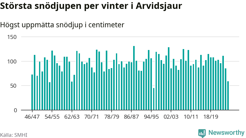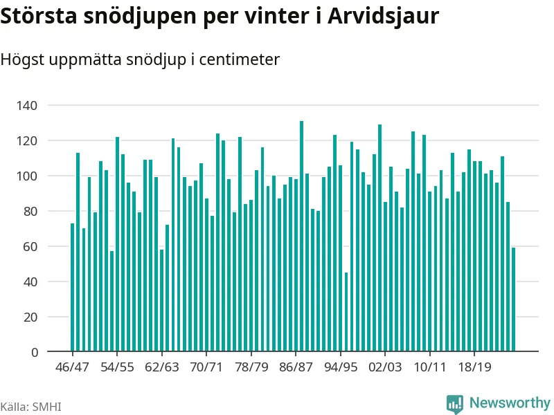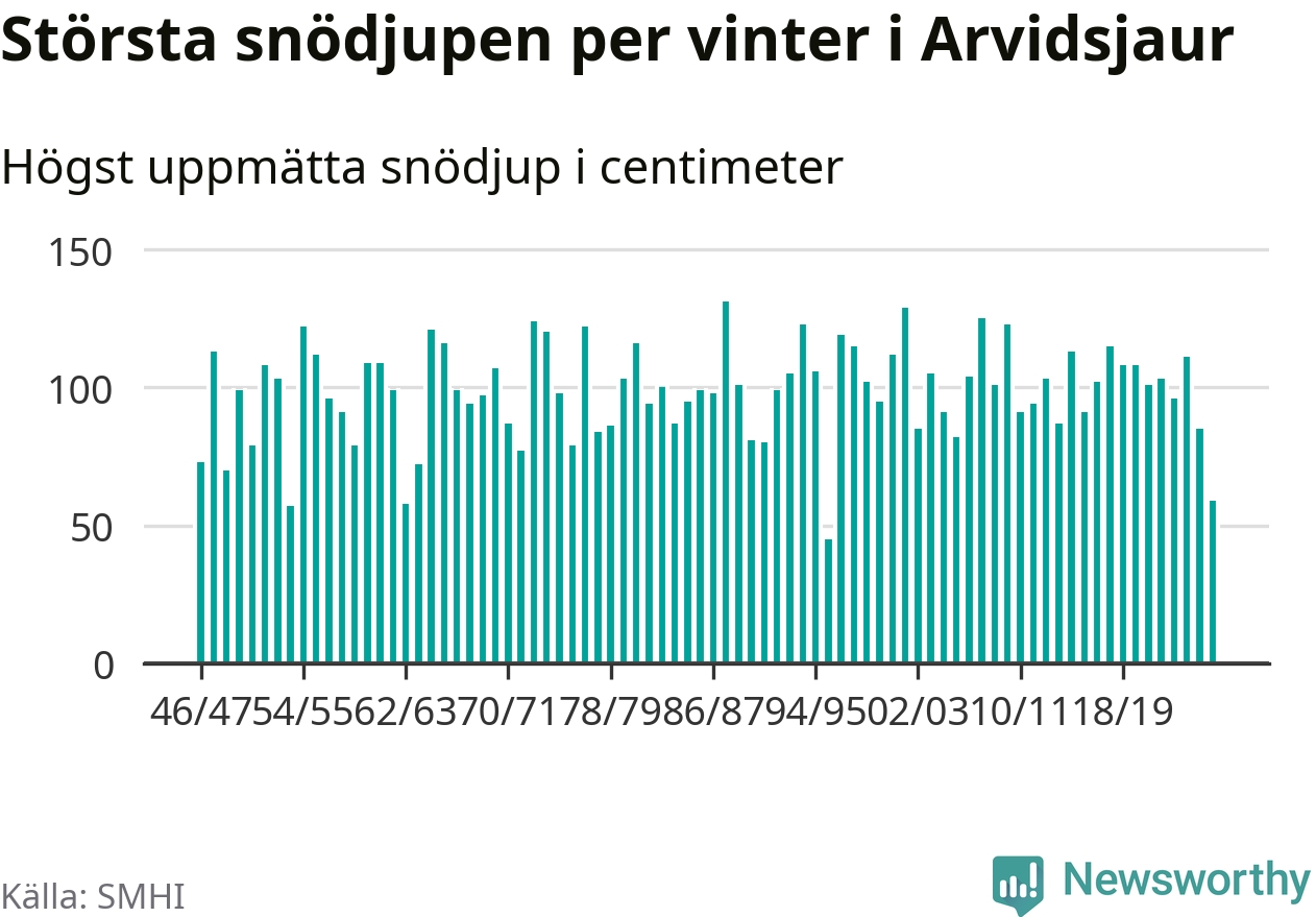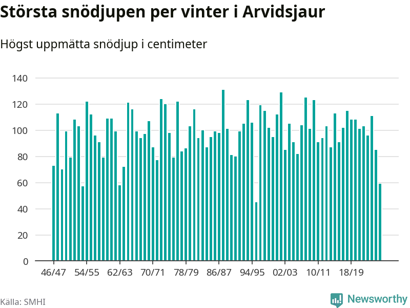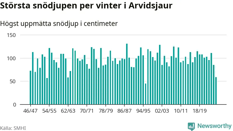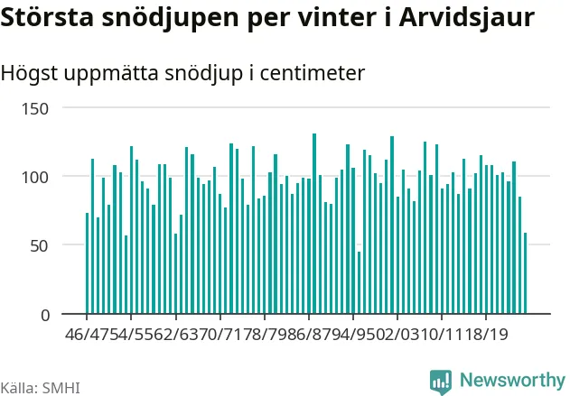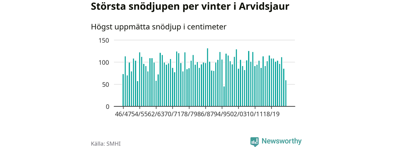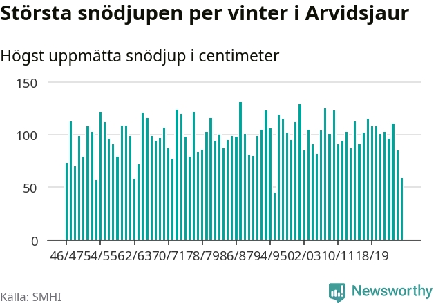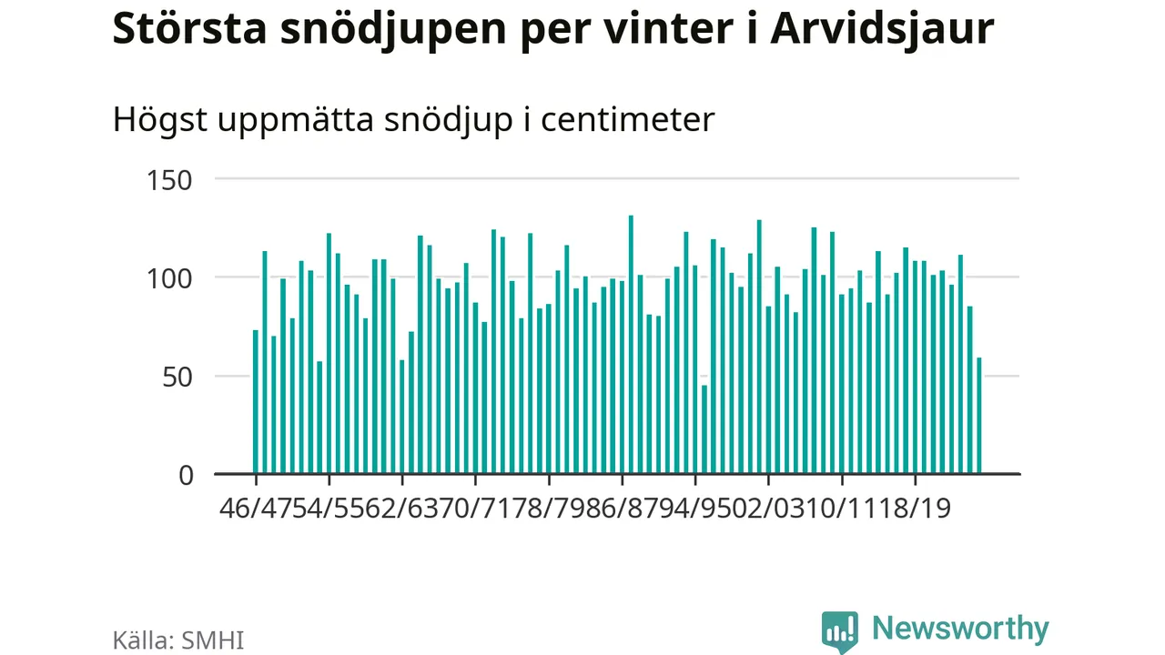 Men hur står sig det snödjupet historiskt sett? Newsworthy har tittat på det största snödjup som SMHI har uppmätt i Arvidsjaurs kommun varje år sedan vintern 1946/47 – och hittills tar sig årets vinter inte in bland de 25 vintrarna med störst uppmätt snödjup i kommunen.
