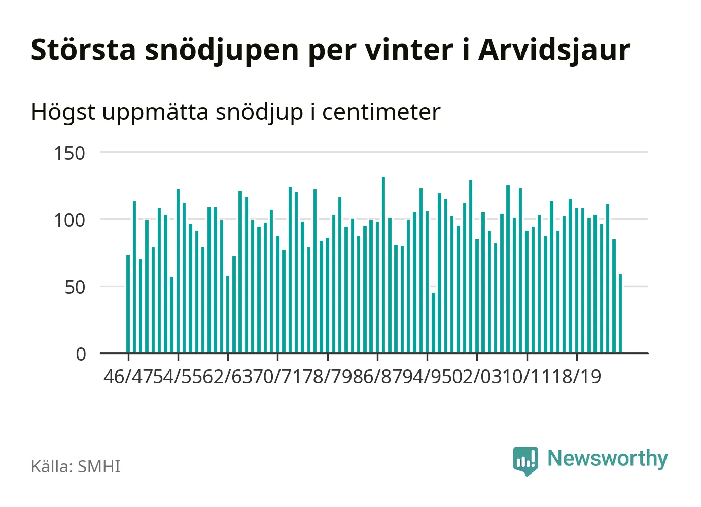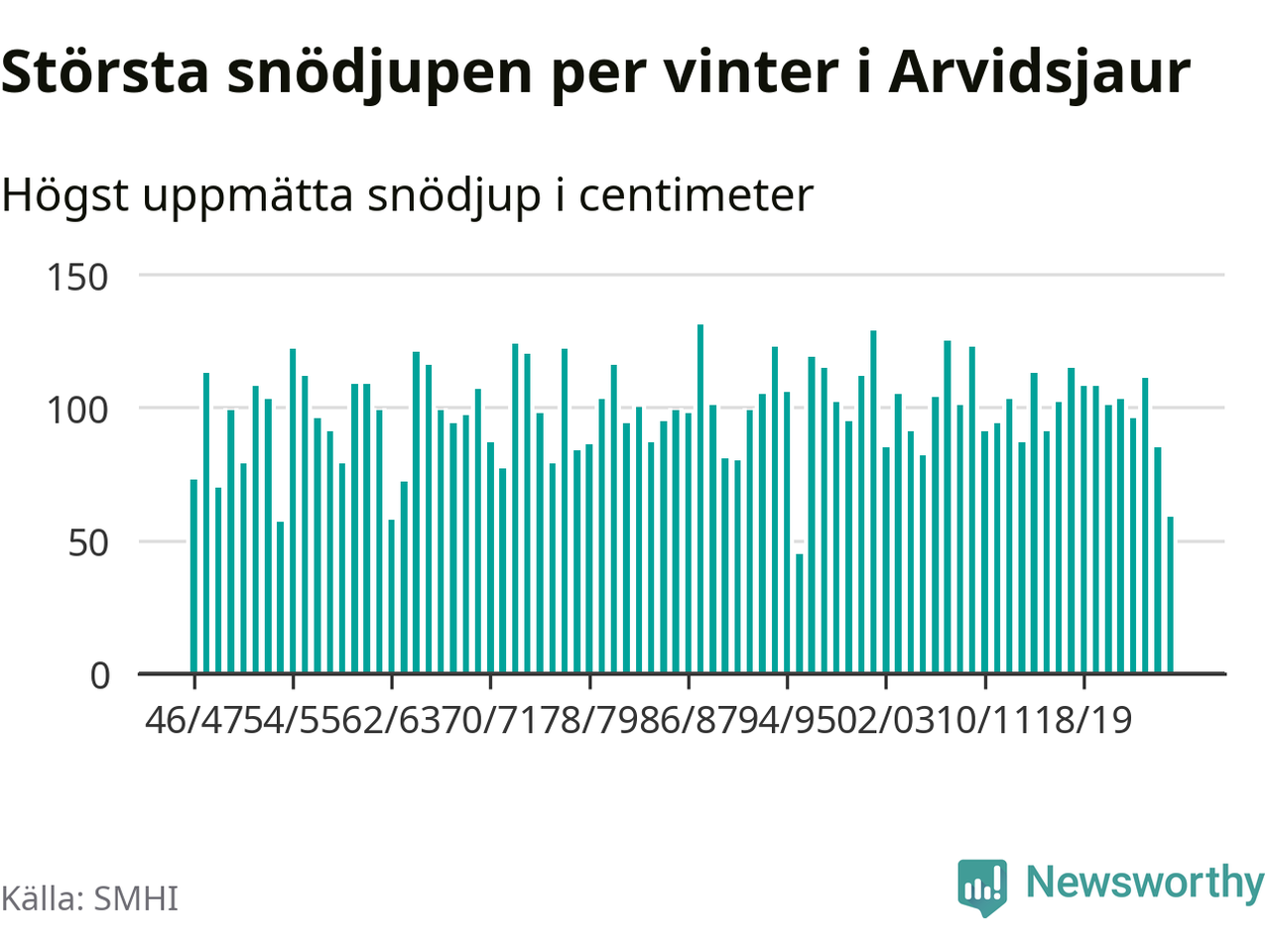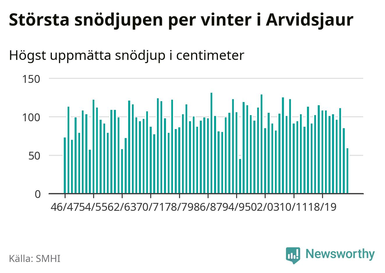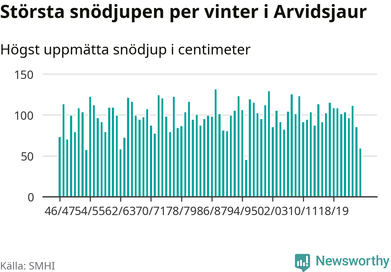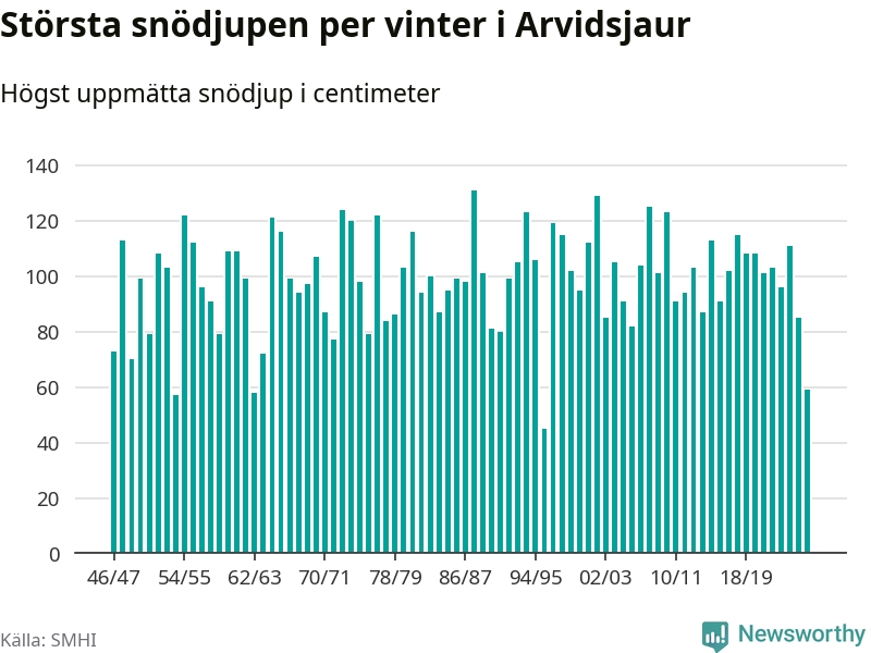 Men hur står sig det snödjupet historiskt sett? Newsworthy har tittat på det största snödjup som SMHI har uppmätt i Arvidsjaurs kommun varje år sedan vintern 1946/47 – och hittills tar sig årets vinter inte in bland de 25 vintrarna med störst uppmätt snödjup i kommunen.