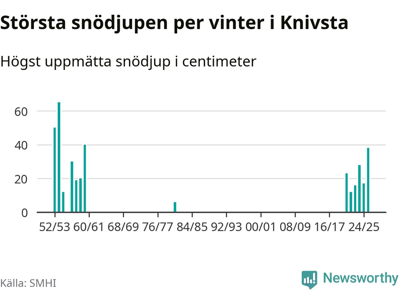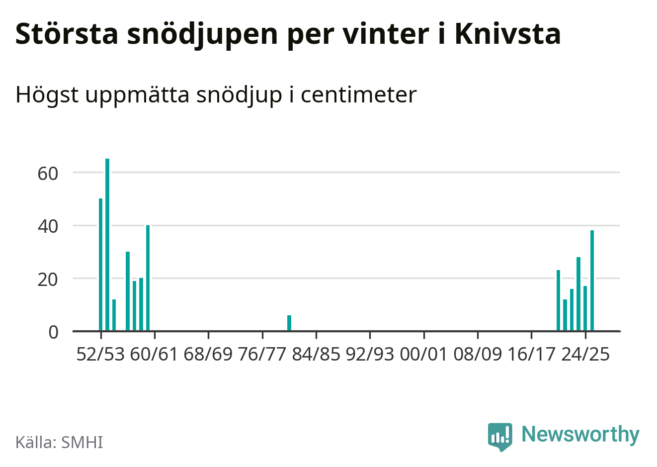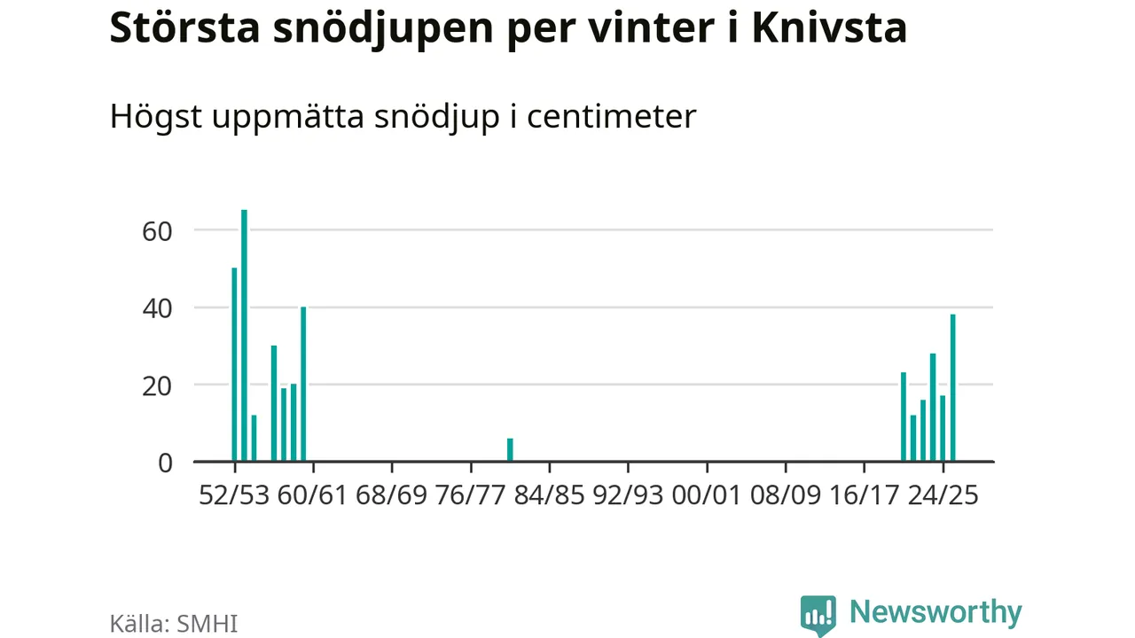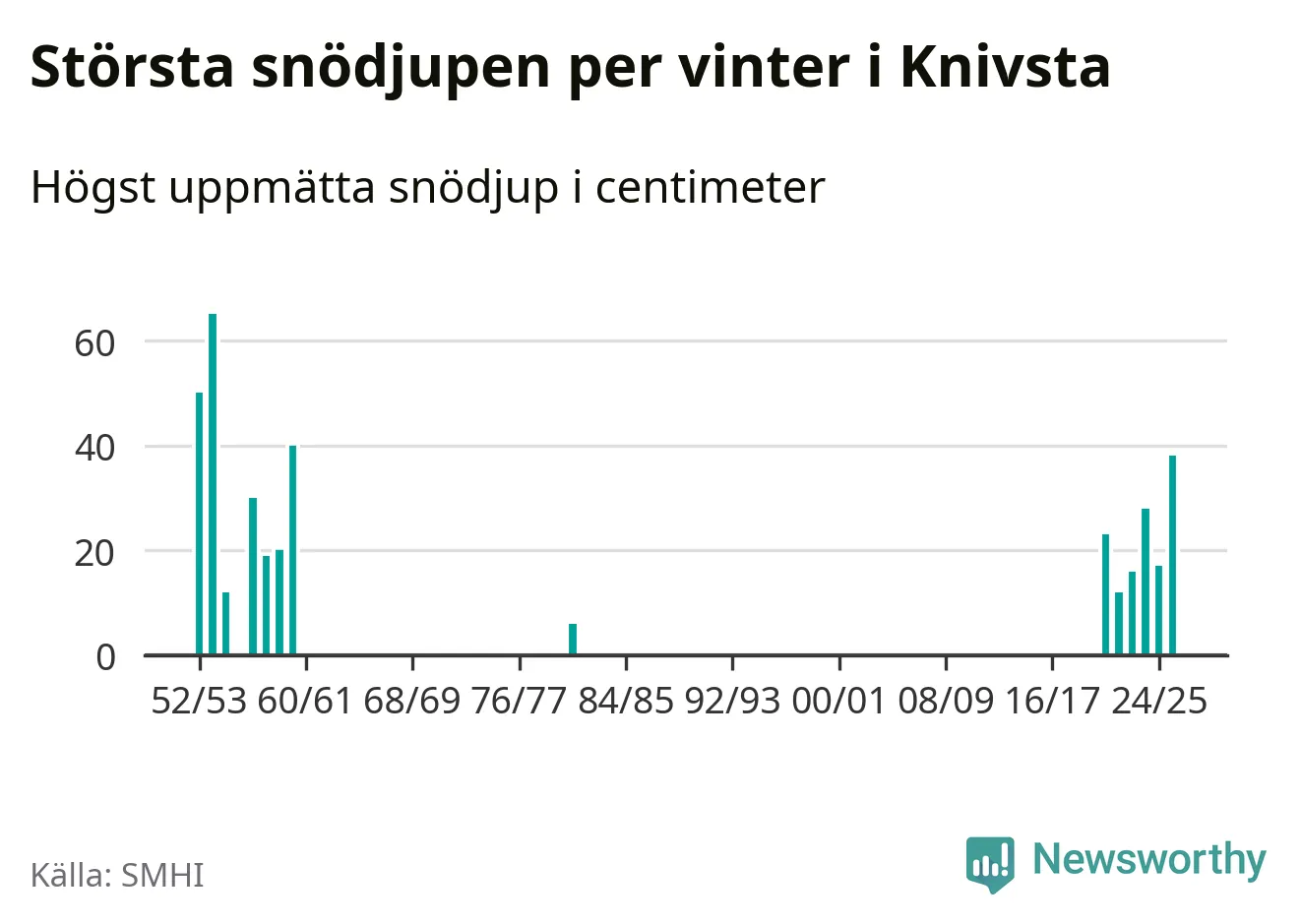 Men hur står sig det snödjupet historiskt sett? Newsworthy har tittat på det största snödjup som SMHI har uppmätt i Knivsta kommun varje år sedan vintern 1952/53 – och hittills är årets vinter den med fjärde största uppmätta snödjup i kommunen. Det ska sägas att det fattas uppgifter för de flesta av de här vintrarna