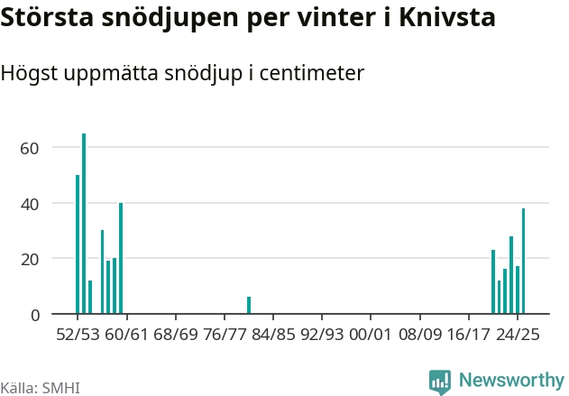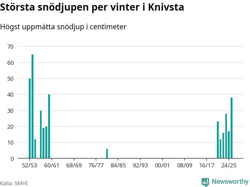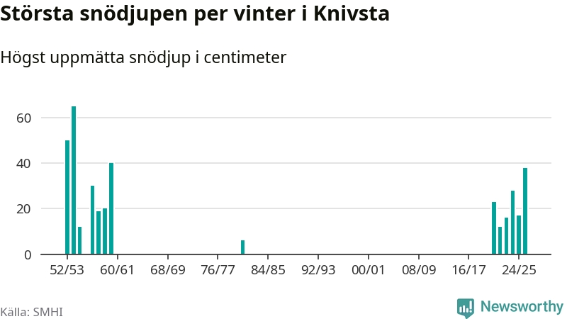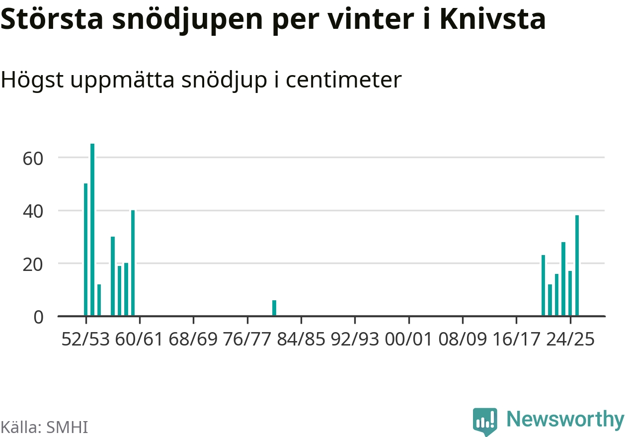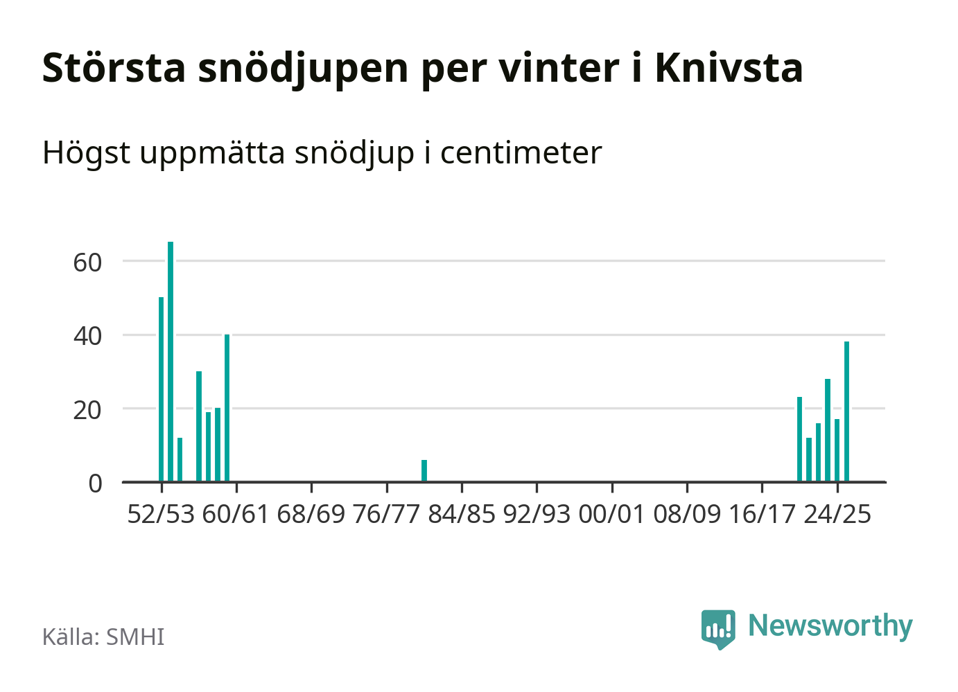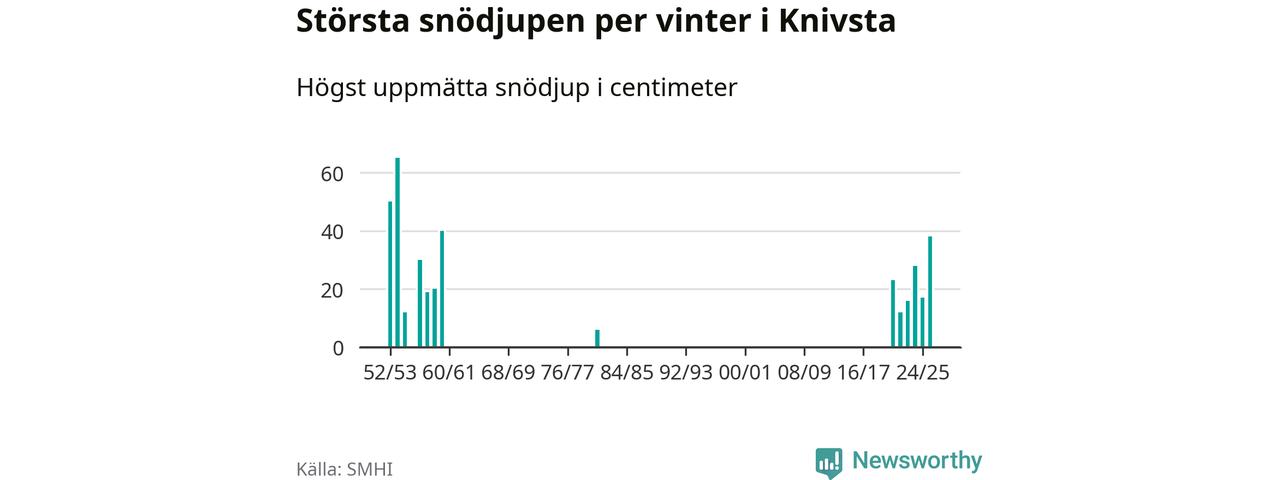 Men hur står sig det snödjupet historiskt sett? Newsworthy har tittat på det största snödjup som SMHI har uppmätt i Knivsta kommun varje år sedan vintern 1952/53 – och hittills är årets vinter den med fjärde största uppmätta snödjup i kommunen. Det ska sägas att det fattas uppgifter för de flesta av de här vintrarna