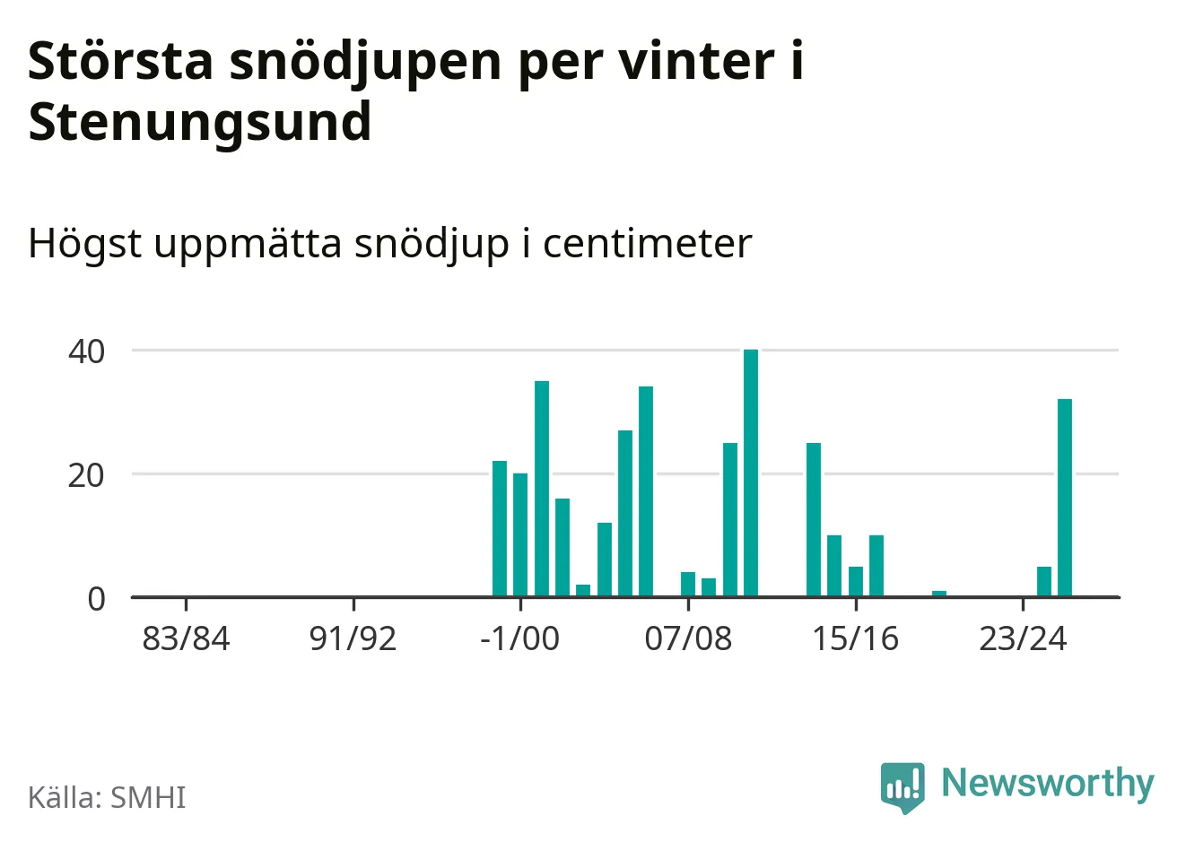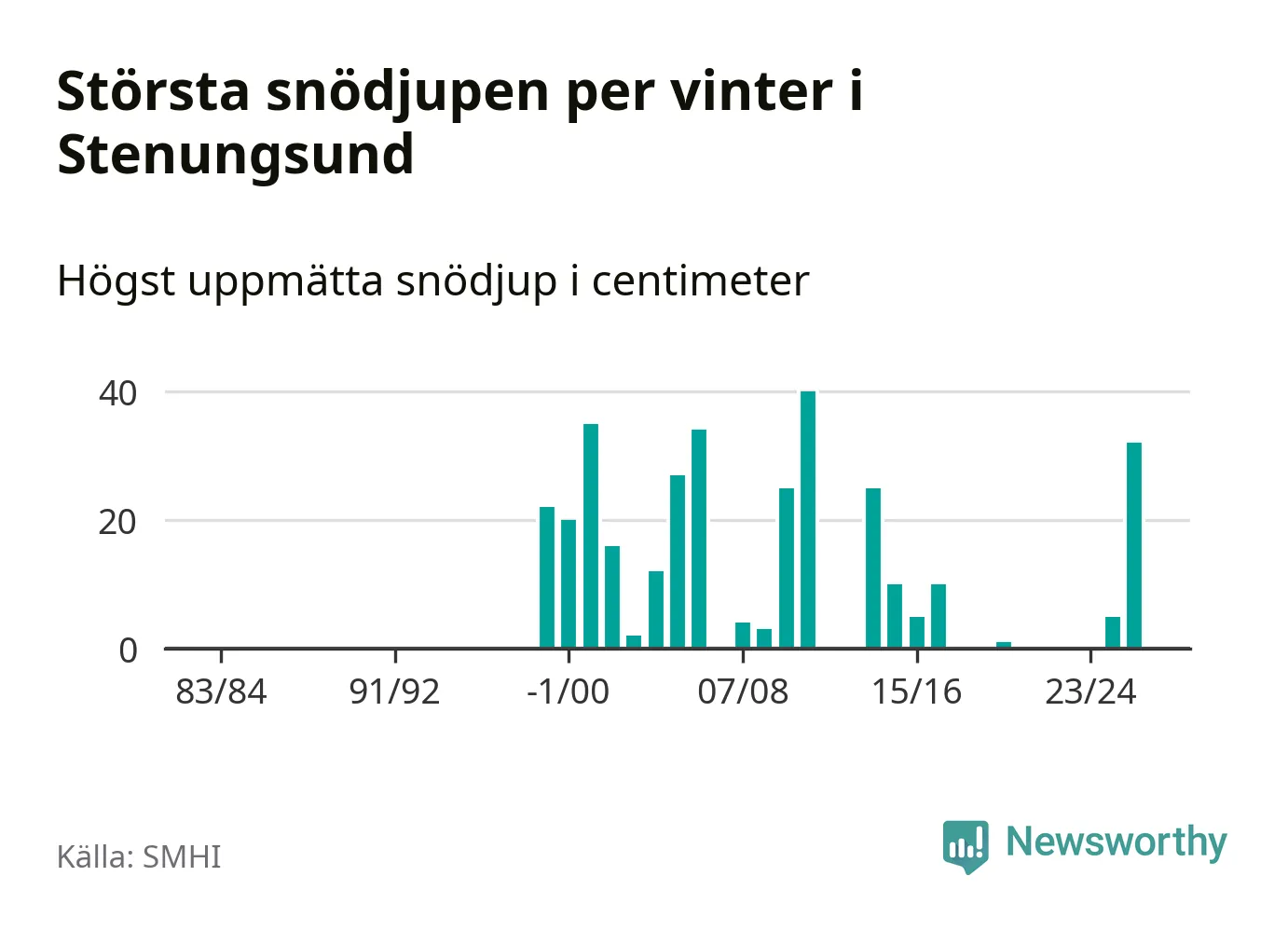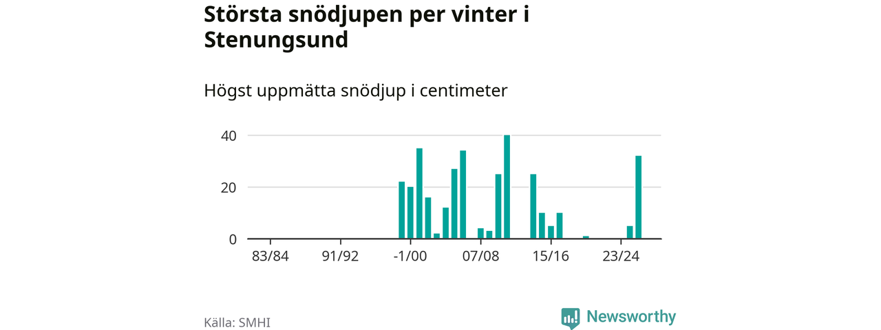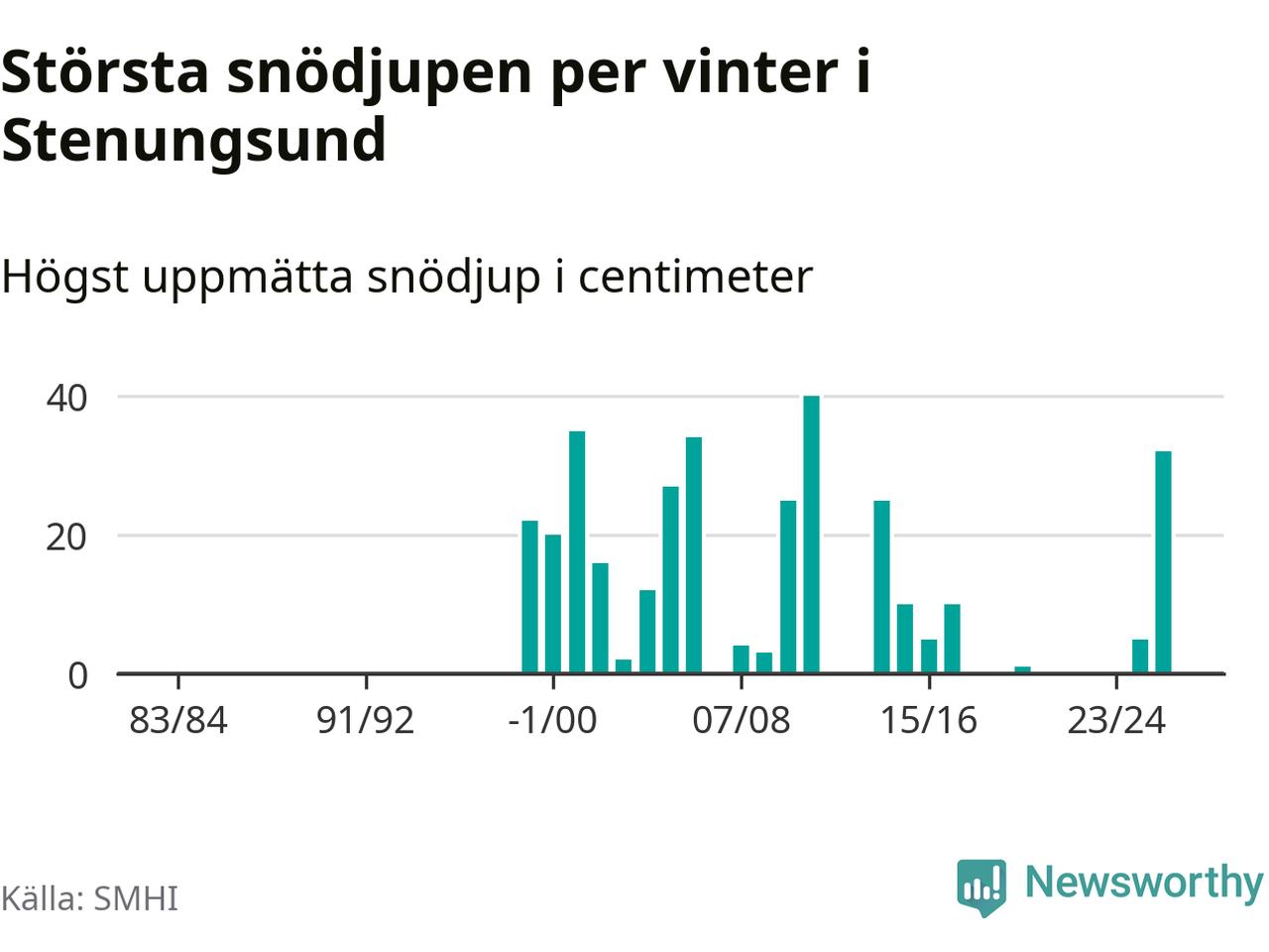 Men hur står sig det snödjupet historiskt sett? Newsworthy har tittat på det största snödjup som SMHI har uppmätt i Stenungsunds kommun varje år sedan vintern 1983/84 – och hittills är årets vinter den med fjärde största uppmätta snödjup i kommunen. Det ska sägas att det inte finns några noteringar för åren 1985–1998, 2007, 2019 och 2021–2024.