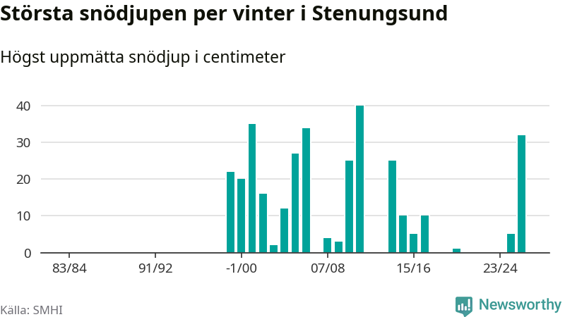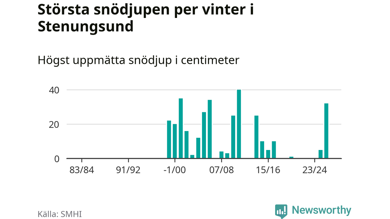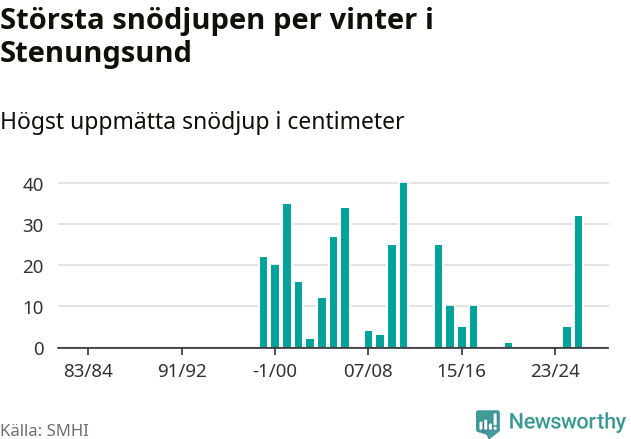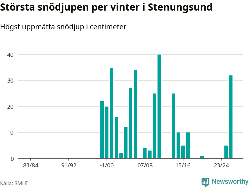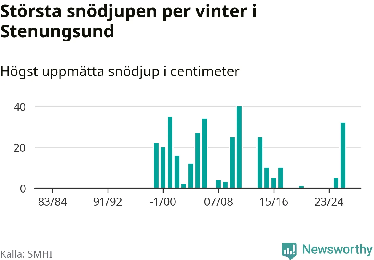 Men hur står sig det snödjupet historiskt sett? Newsworthy har tittat på det största snödjup som SMHI har uppmätt i Stenungsunds kommun varje år sedan vintern 1983/84 – och hittills är årets vinter den med fjärde största uppmätta snödjup i kommunen. Det ska sägas att det inte finns några noteringar för åren 1985–1998, 2007, 2019 och 2021–2024.