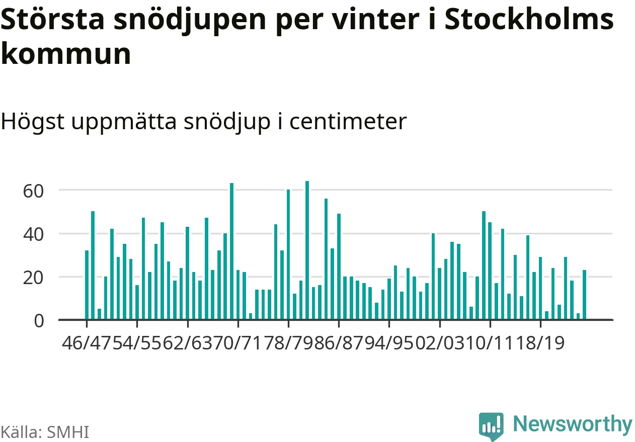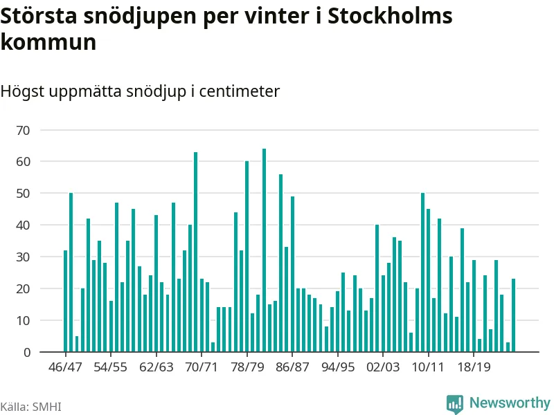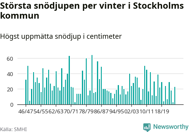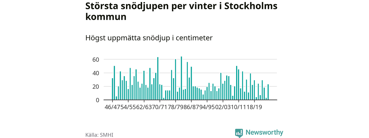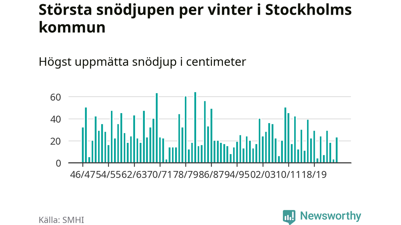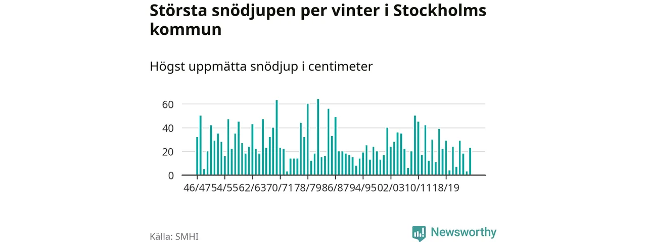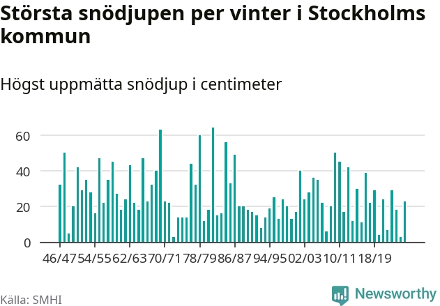 Men hur står sig det snödjupet historiskt sett? Newsworthy har tittat på det största snödjup som SMHI har uppmätt i Stockholms kommun varje år sedan vintern 1946/47 – och hittills tar sig årets vinter inte in bland de 25 vintrarna med störst uppmätt snödjup i kommunen.