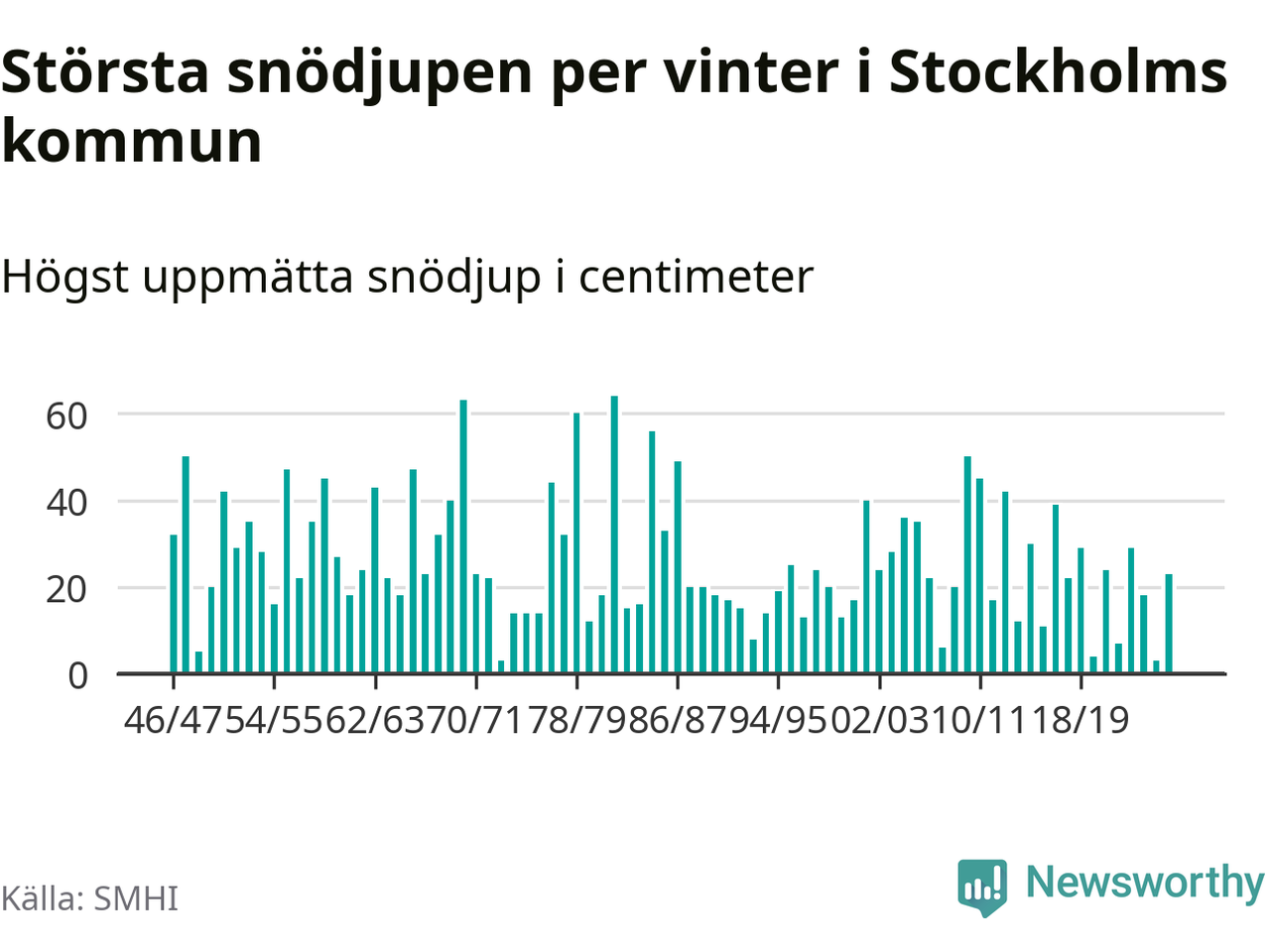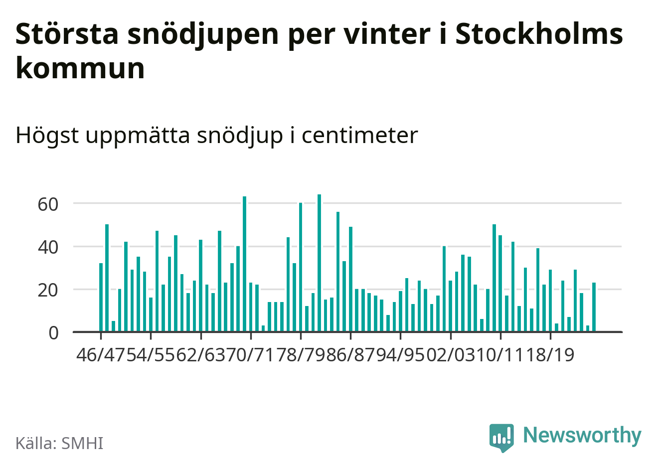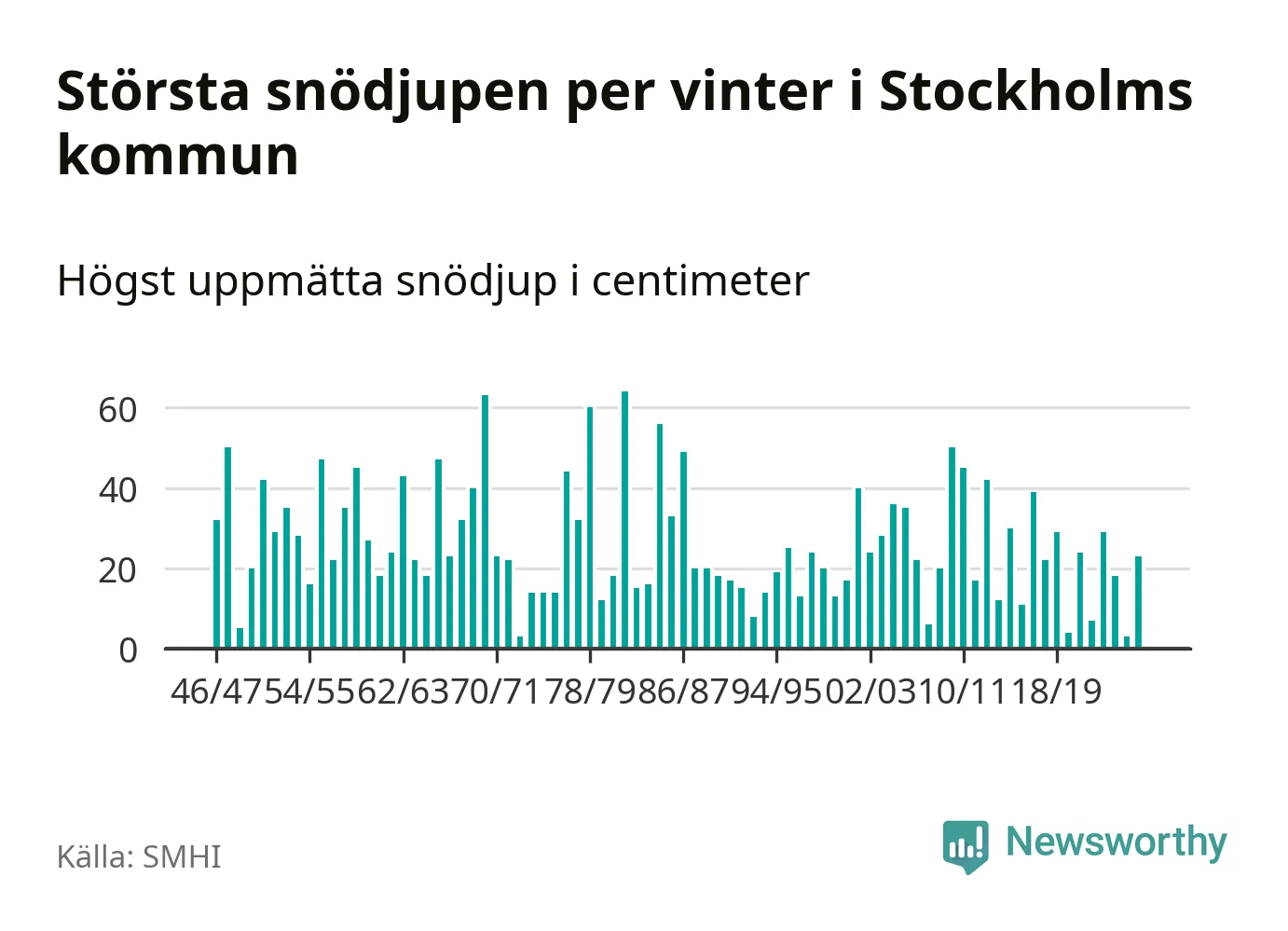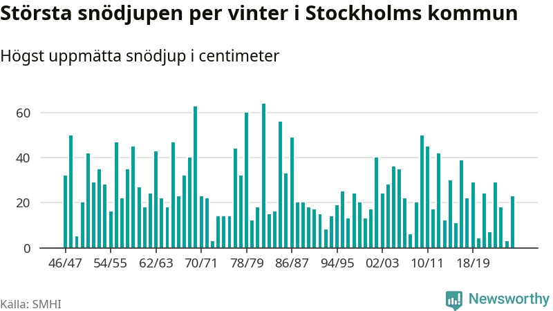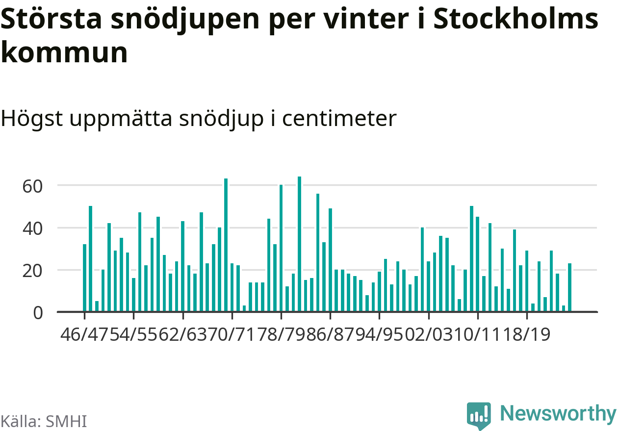 Men hur står sig det snödjupet historiskt sett? Newsworthy har tittat på det största snödjup som SMHI har uppmätt i Stockholms kommun varje år sedan vintern 1946/47 – och hittills tar sig årets vinter inte in bland de 25 vintrarna med störst uppmätt snödjup i kommunen.