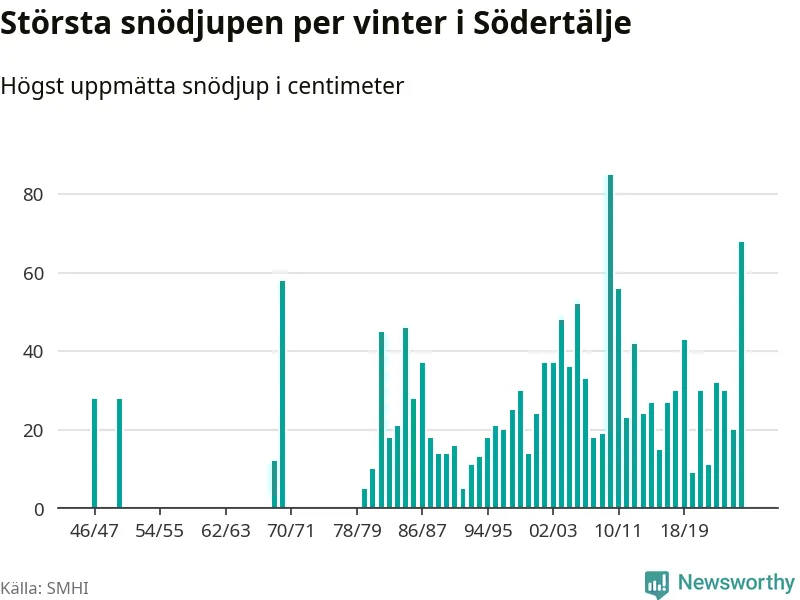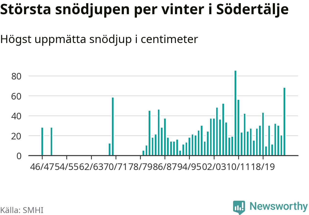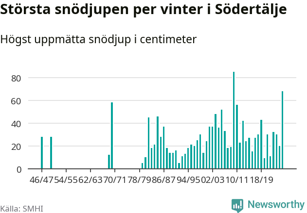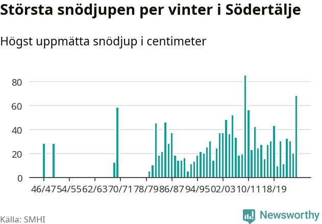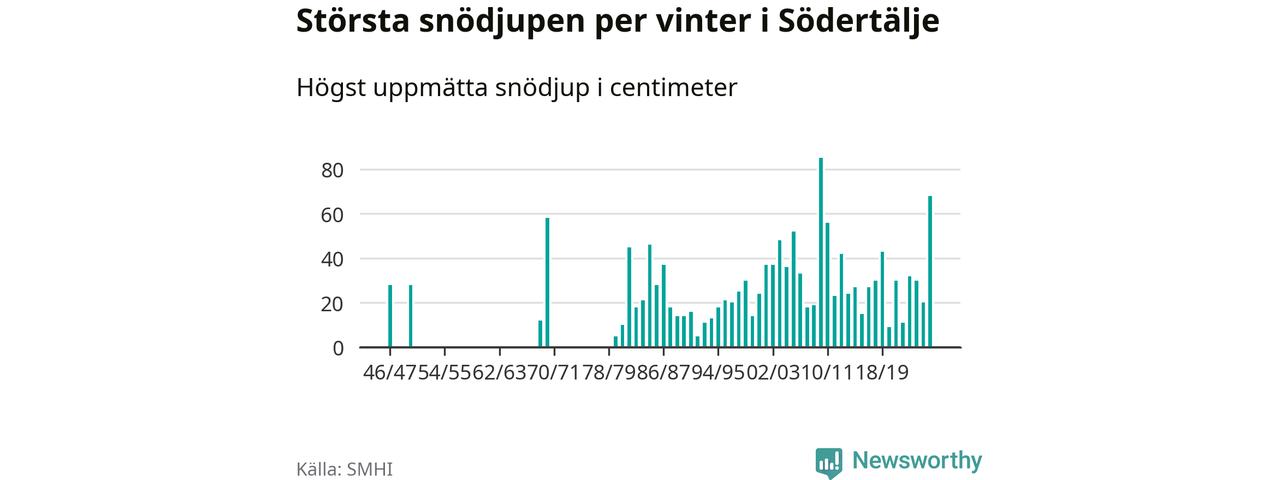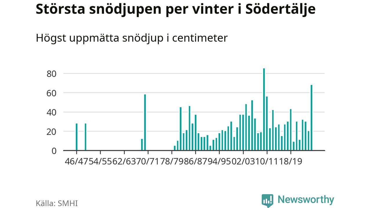Men hur står sig det snödjupet historiskt sett? Newsworthy har tittat på det största snödjup som SMHI har uppmätt i Södertälje kommun varje år sedan vintern 1946/47 – och hittills är årets vinter den med näst största uppmätta snödjup i kommunen. Det ska sägas att det inte finns några noteringar för åren 1948, 1949, 1951–1968 och 1971–1979.