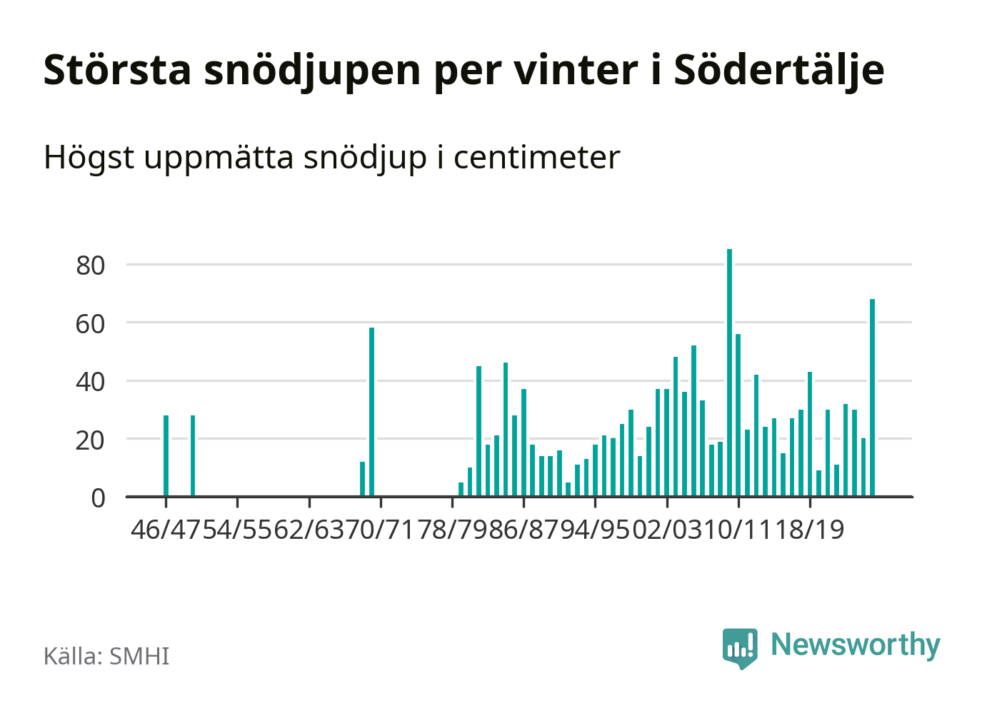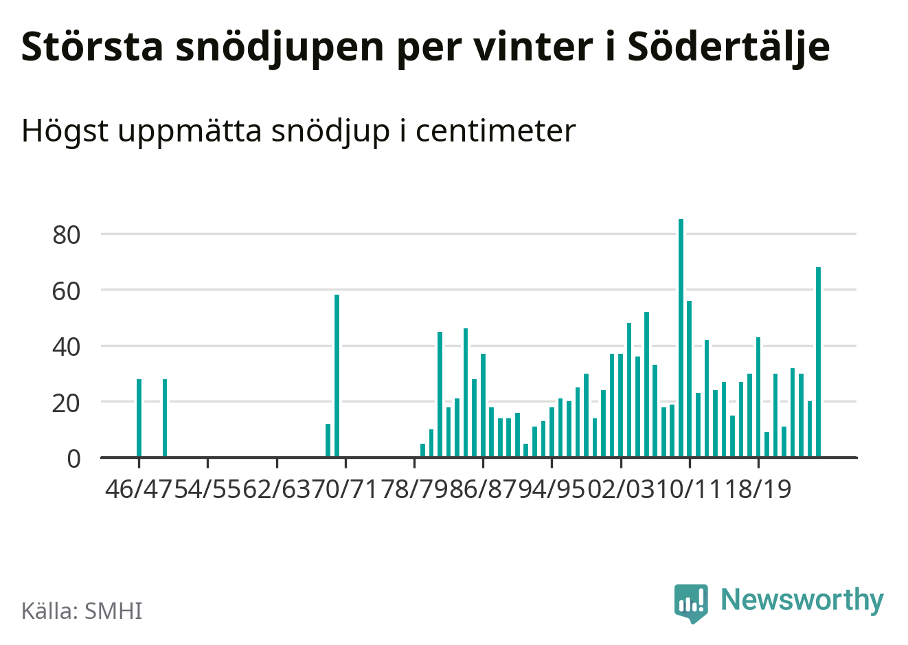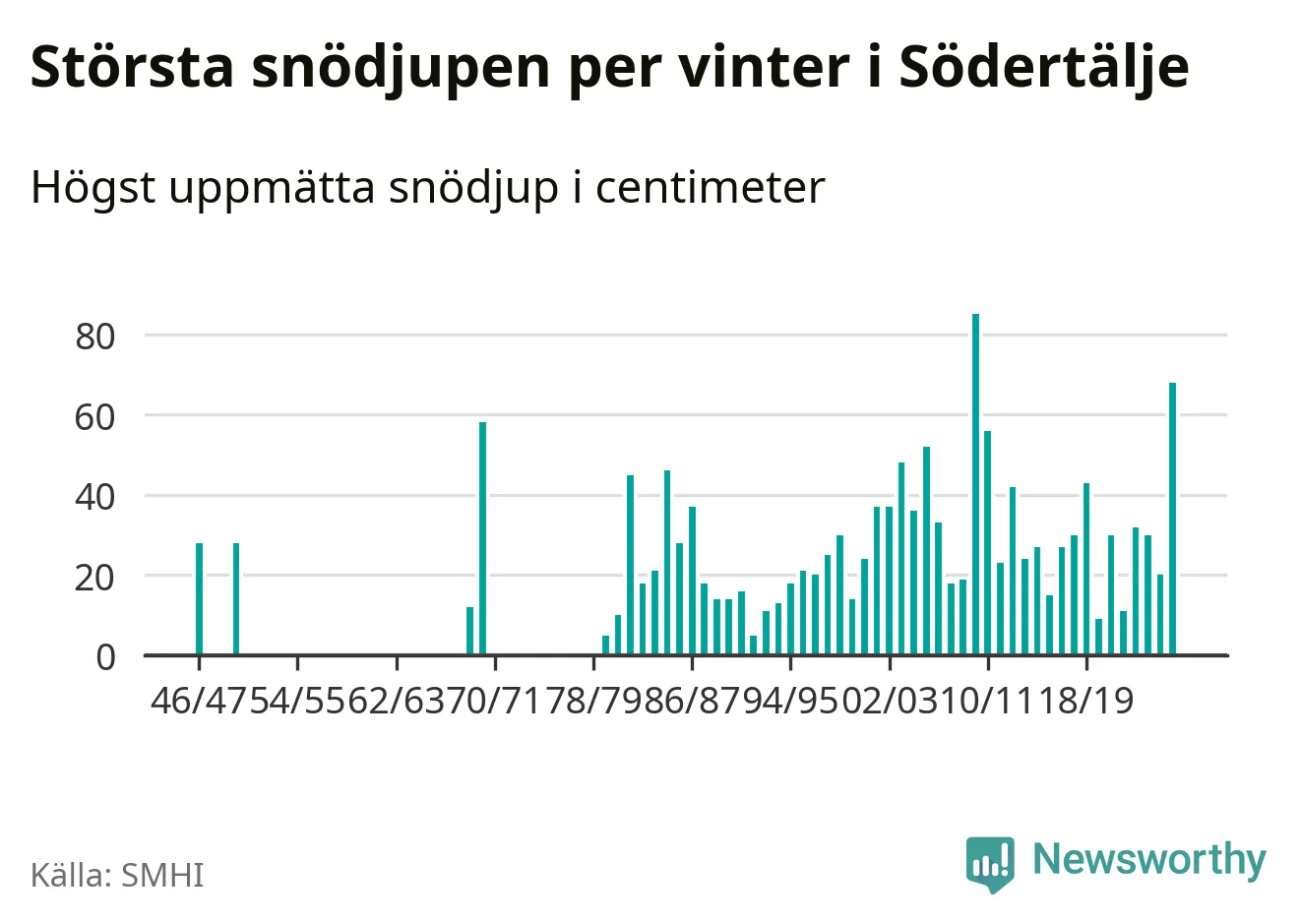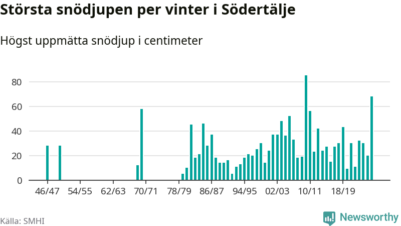 Men hur står sig det snödjupet historiskt sett? Newsworthy har tittat på det största snödjup som SMHI har uppmätt i Södertälje kommun varje år sedan vintern 1946/47 – och hittills är årets vinter den med näst största uppmätta snödjup i kommunen. Det ska sägas att det inte finns några noteringar för åren 1948, 1949, 1951–1968 och 1971–1979.