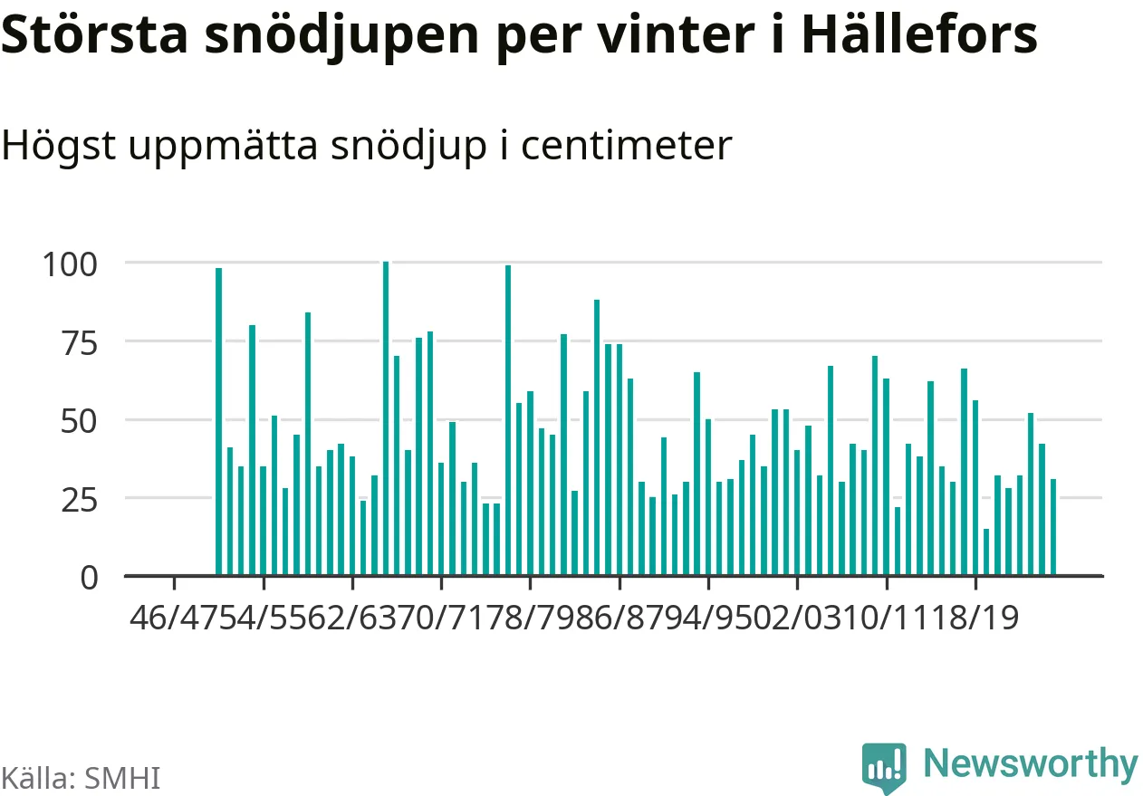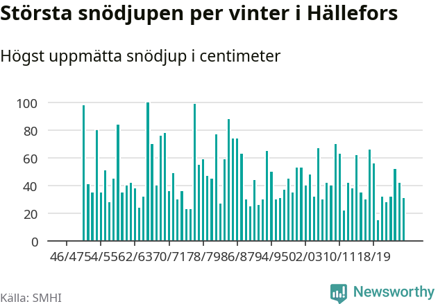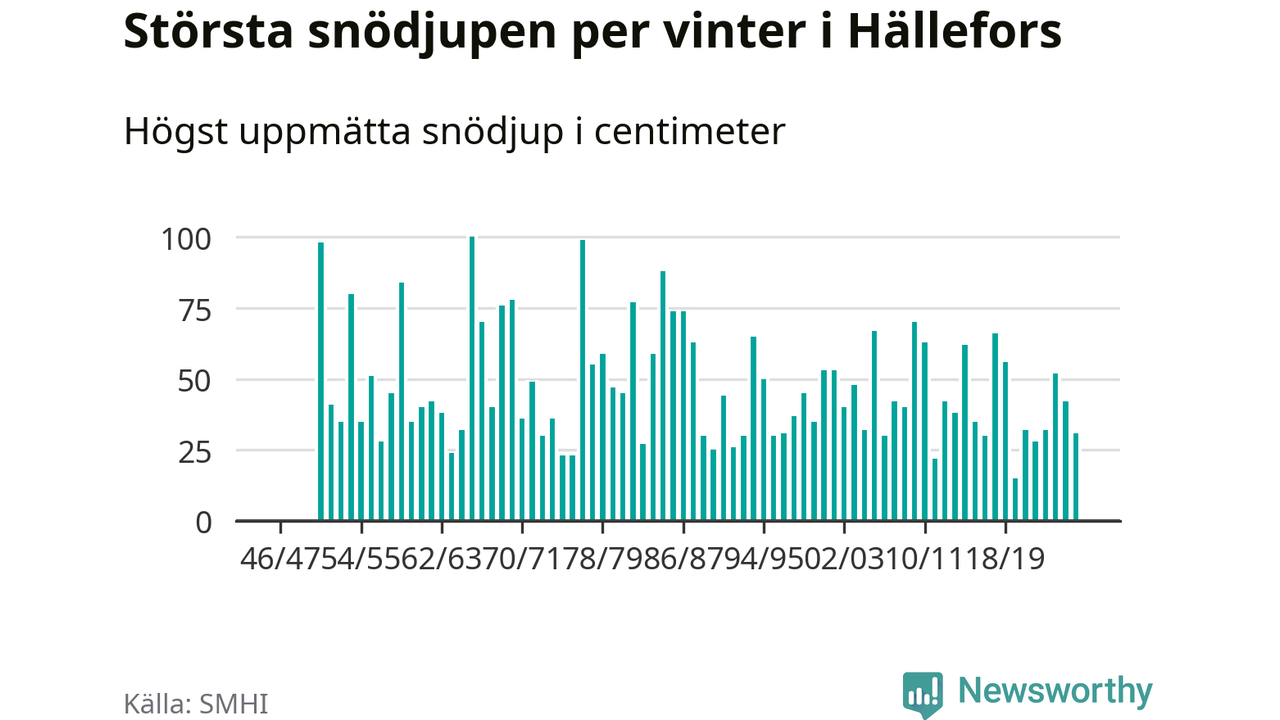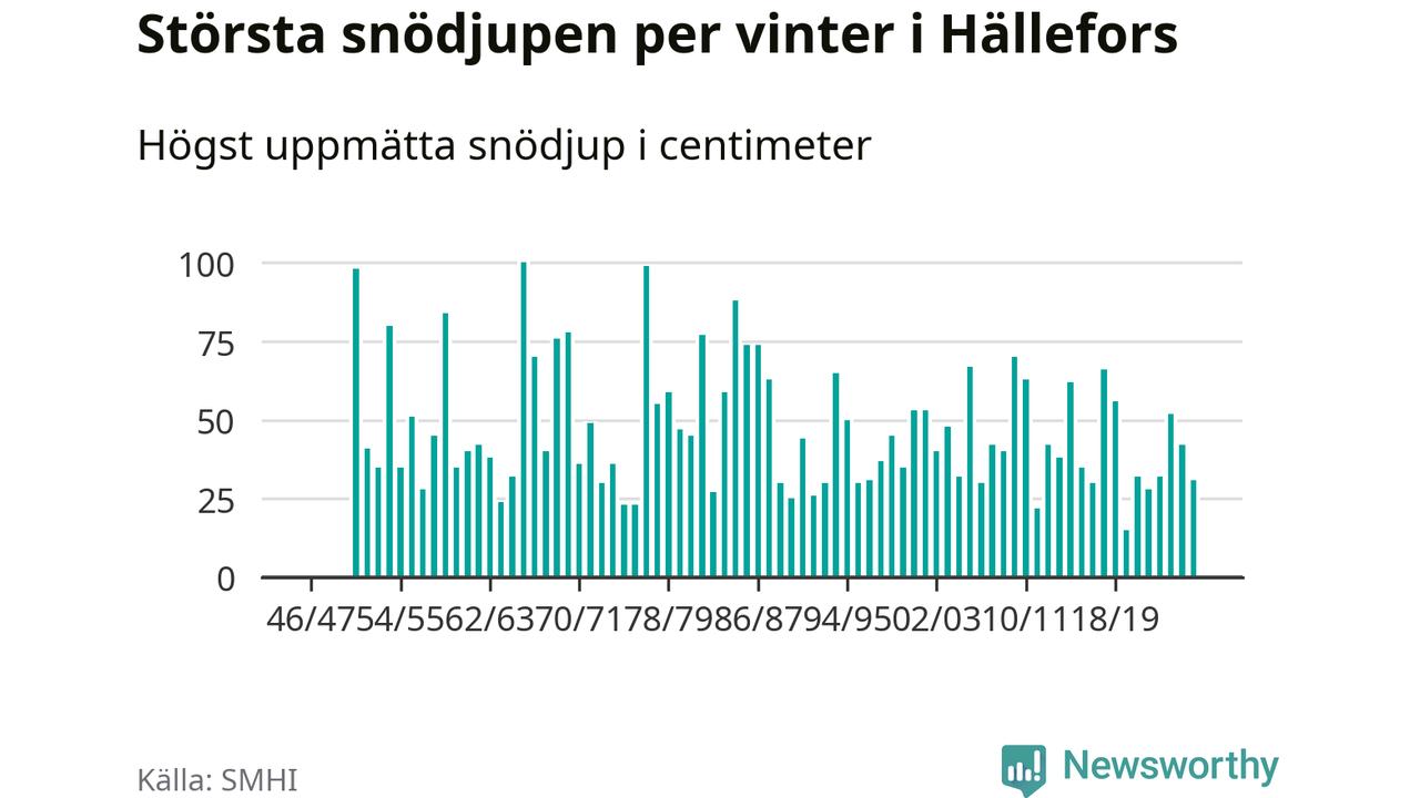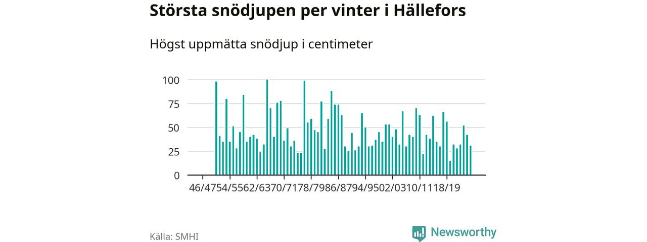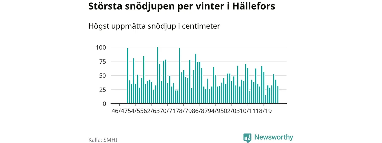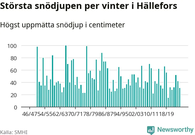Men hur står sig det snödjupet historiskt sett? Newsworthy har tittat på det största snödjup som SMHI har uppmätt i Hällefors kommun varje år sedan vintern 1946/47 – och hittills tar sig årets vinter inte in bland de 25 vintrarna med störst uppmätt snödjup i kommunen.