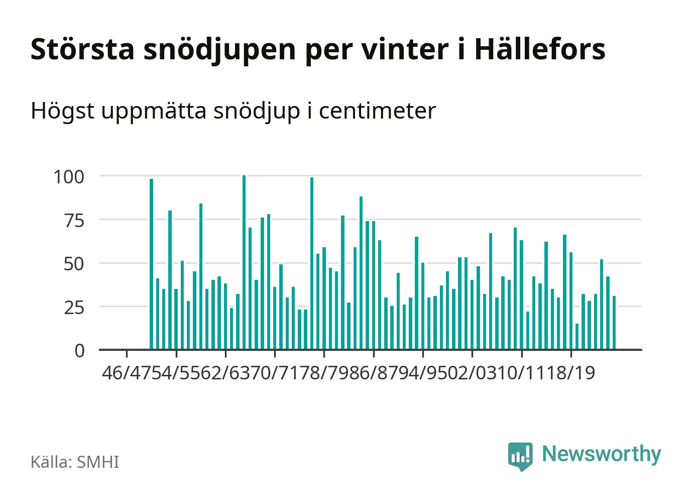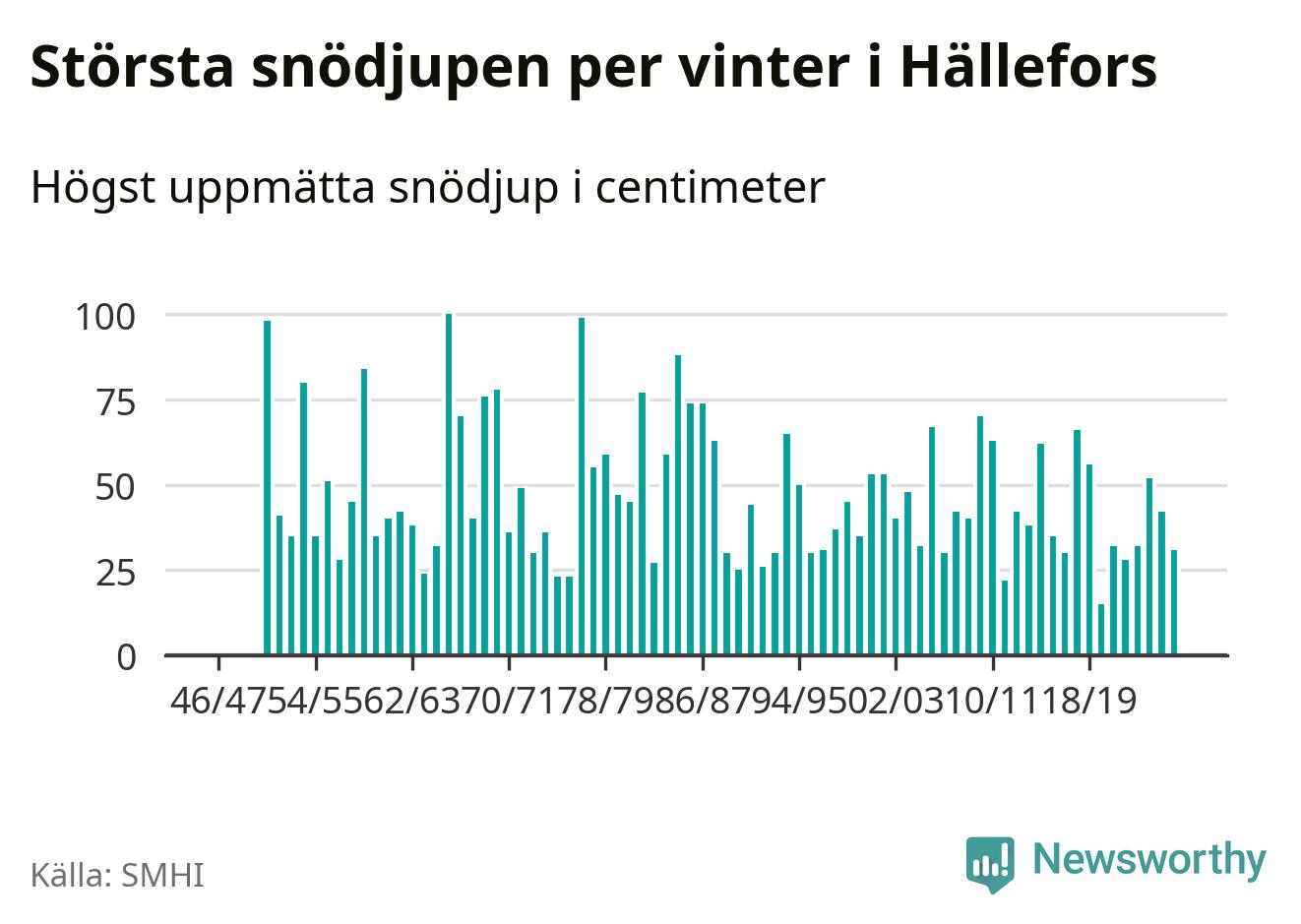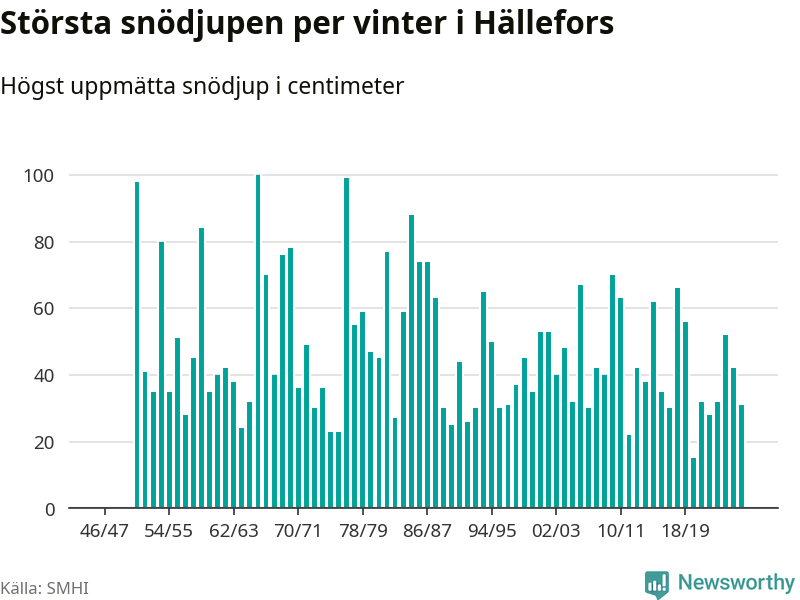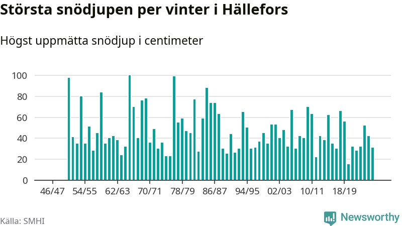 Men hur står sig det snödjupet historiskt sett? Newsworthy har tittat på det största snödjup som SMHI har uppmätt i Hällefors kommun varje år sedan vintern 1946/47 – och hittills tar sig årets vinter inte in bland de 25 vintrarna med störst uppmätt snödjup i kommunen.