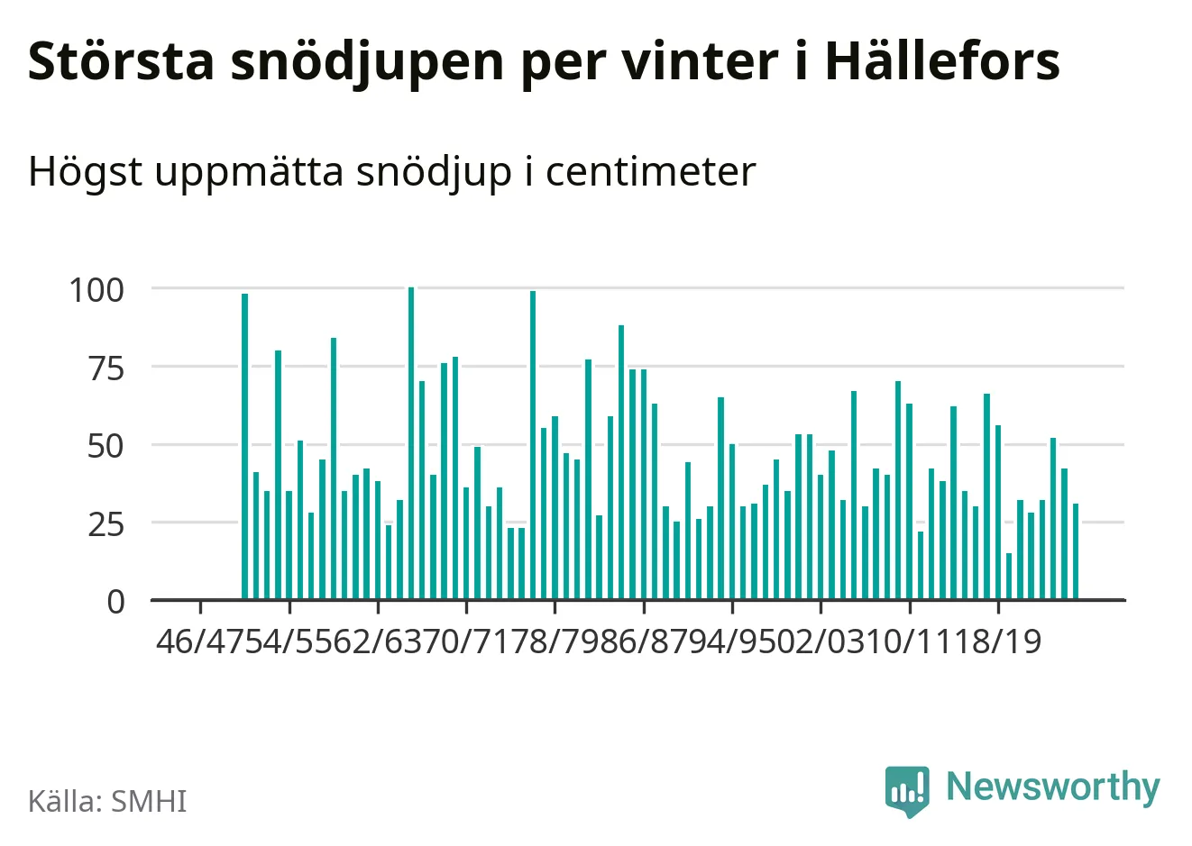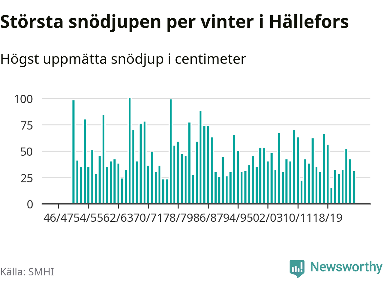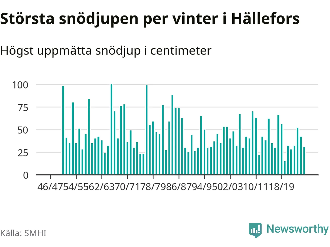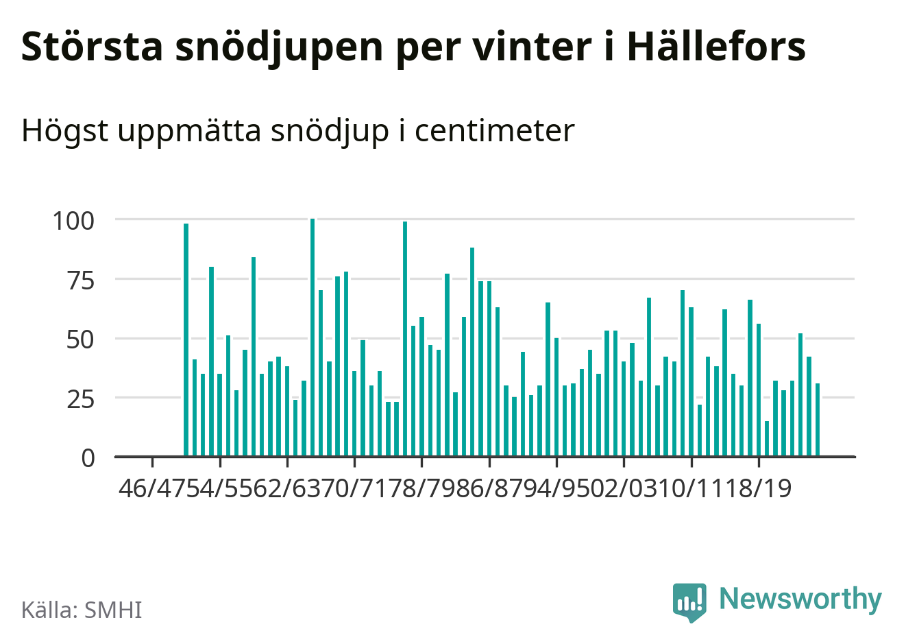 Men hur står sig det snödjupet historiskt sett? Newsworthy har tittat på det största snödjup som SMHI har uppmätt i Hällefors kommun varje år sedan vintern 1946/47 – och hittills tar sig årets vinter inte in bland de 25 vintrarna med störst uppmätt snödjup i kommunen.