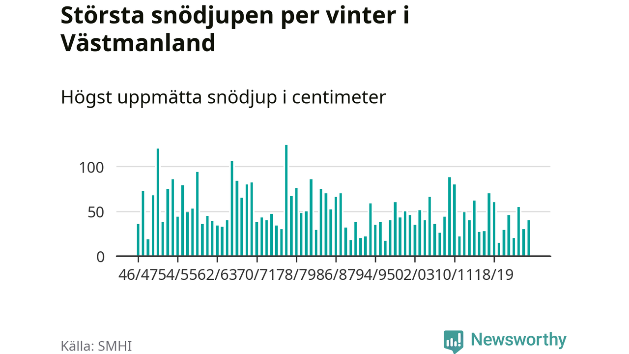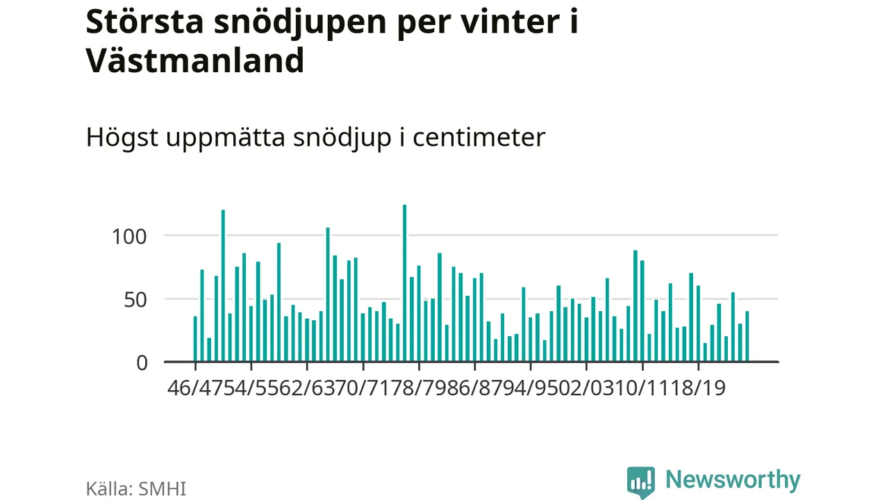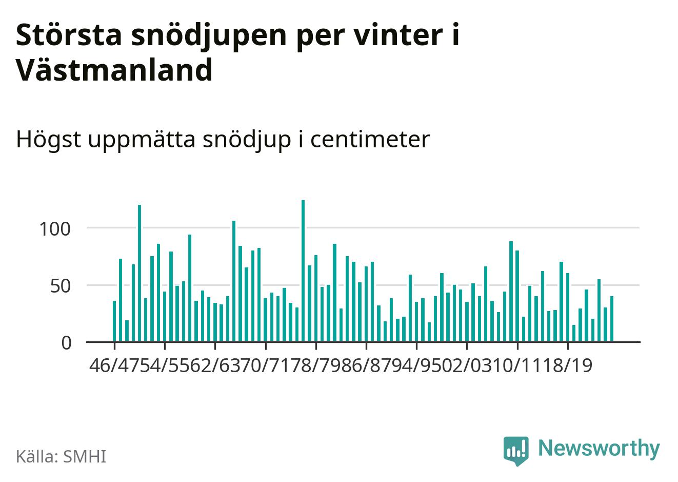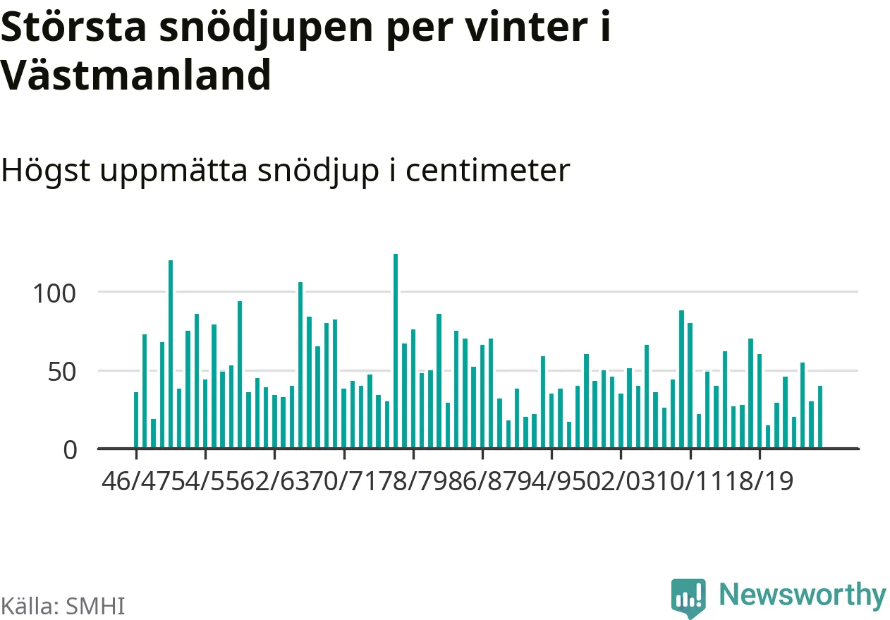 Men hur står sig det snödjupet historiskt sett? Newsworthy har tittat på det största snödjup som SMHI har uppmätt i Västmanlands län varje år sedan vintern 1946/47 – och hittills tar sig årets vinter inte in bland de 25 vintrarna med störst uppmätt snödjup i länet.