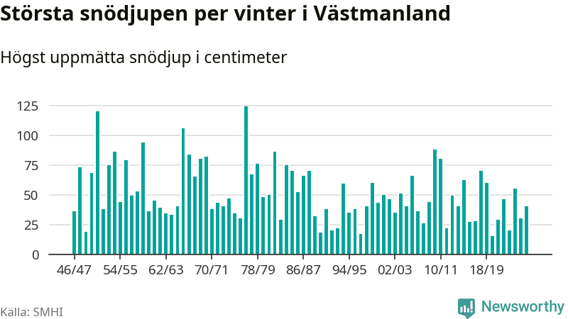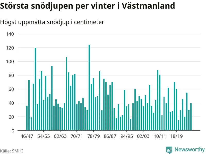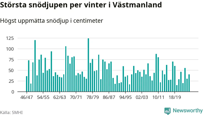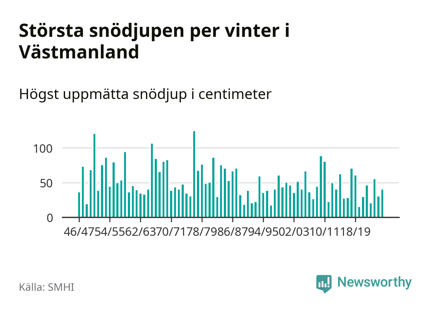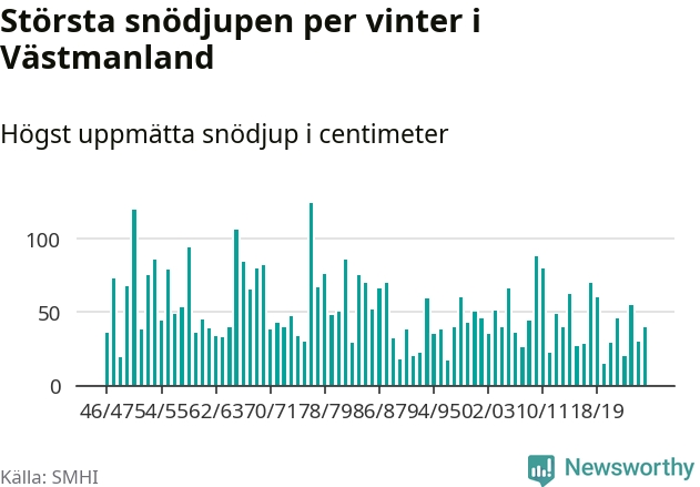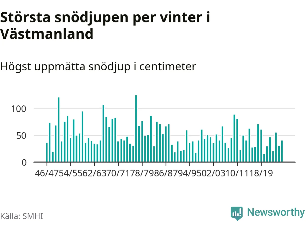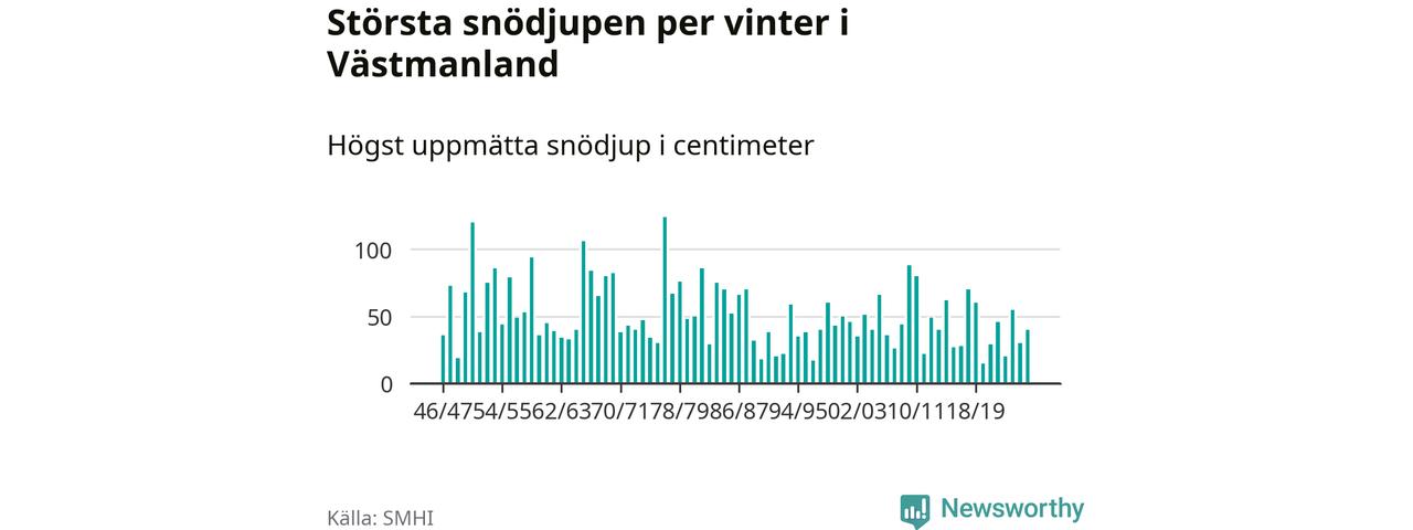 Men hur står sig det snödjupet historiskt sett? Newsworthy har tittat på det största snödjup som SMHI har uppmätt i Västmanlands län varje år sedan vintern 1946/47 – och hittills tar sig årets vinter inte in bland de 25 vintrarna med störst uppmätt snödjup i länet.