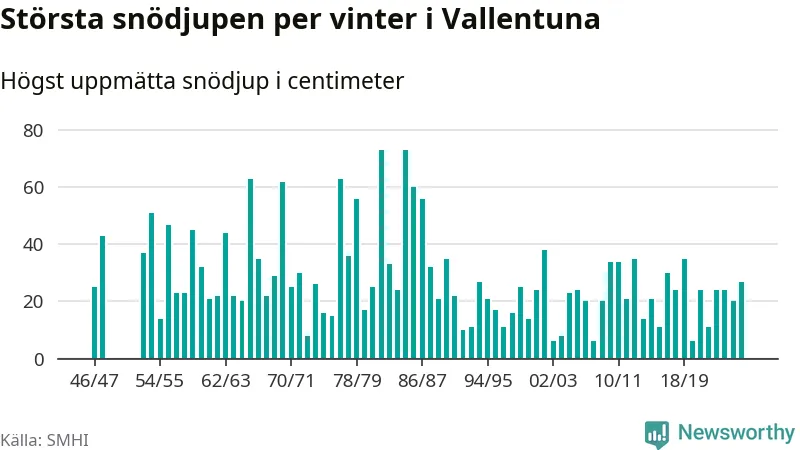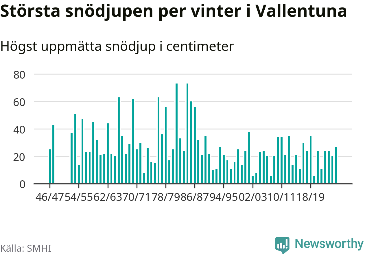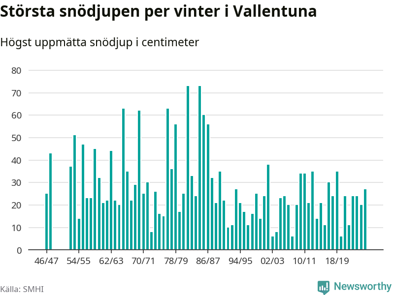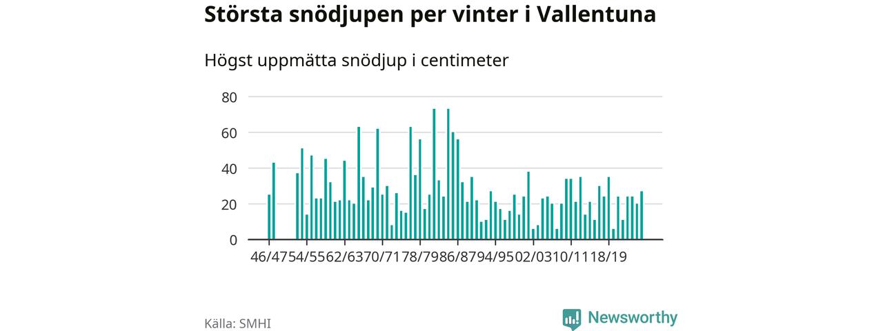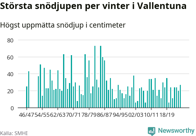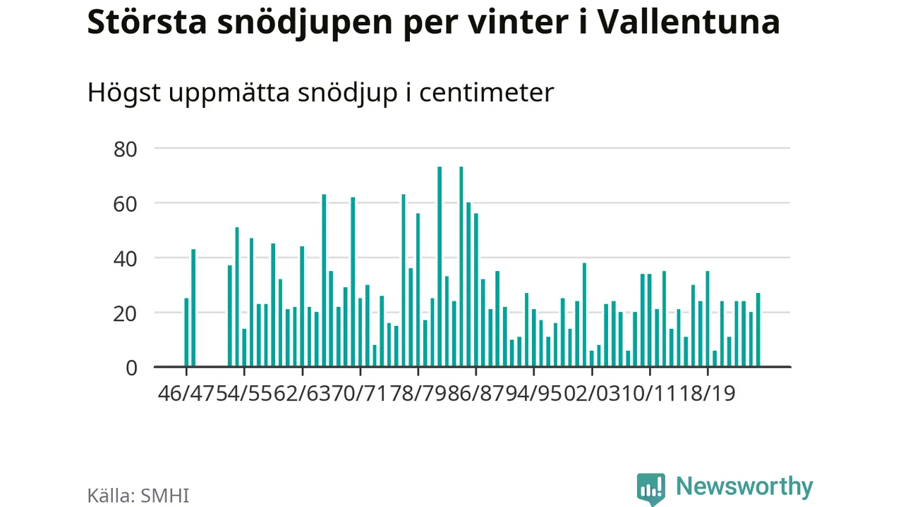 Men hur står sig det snödjupet historiskt sett? Newsworthy har tittat på det största snödjup som SMHI har uppmätt i Vallentuna kommun varje år sedan vintern 1946/47 – och hittills tar sig årets vinter inte in bland de 25 vintrarna med störst uppmätt snödjup i kommunen. Det ska sägas att det inte finns några noteringar för åren 1949–1952.