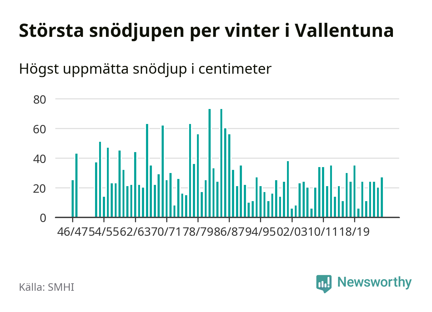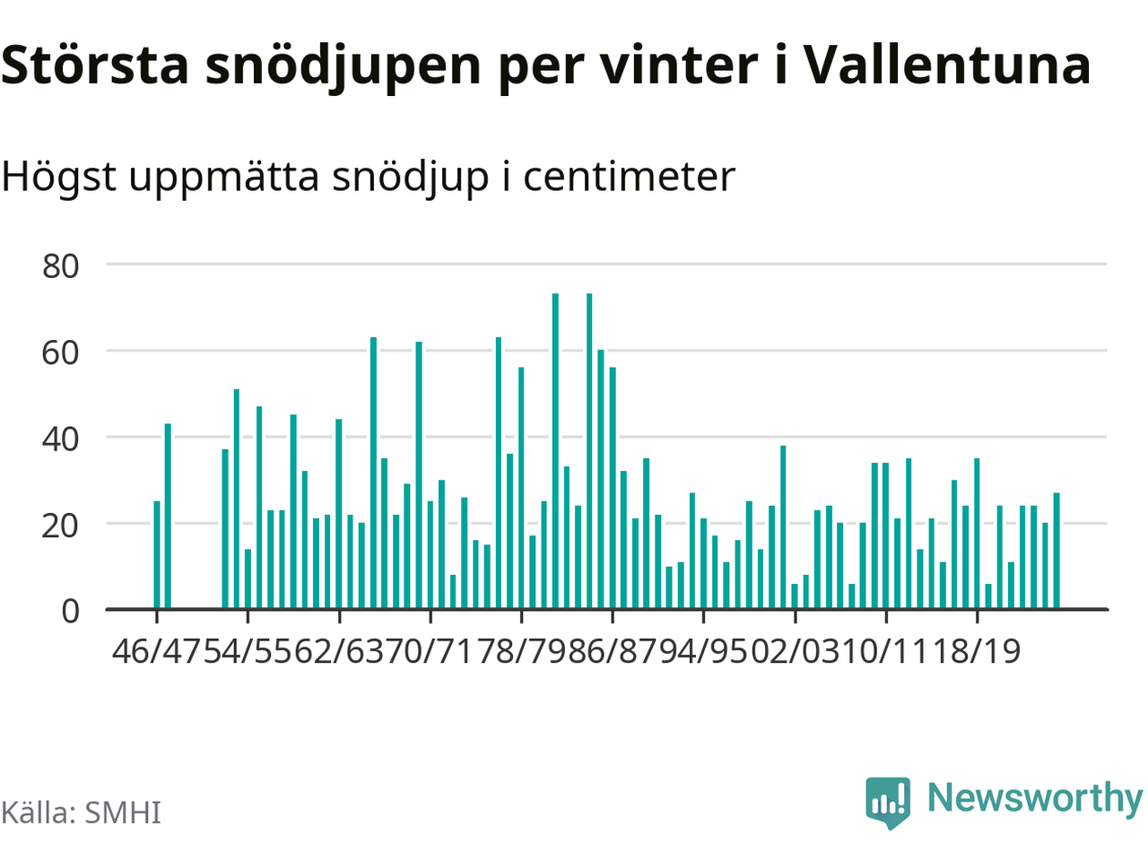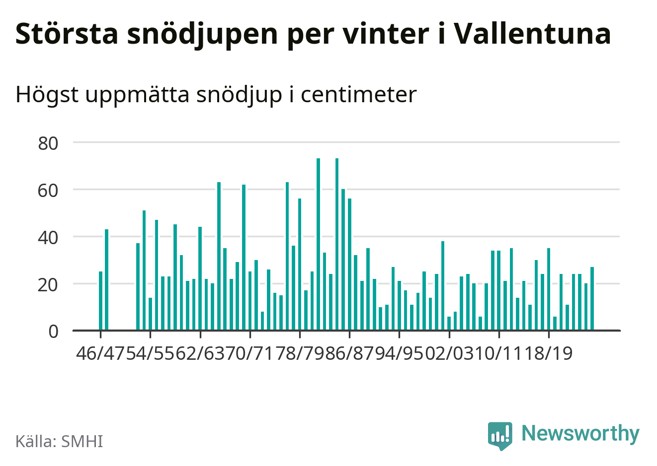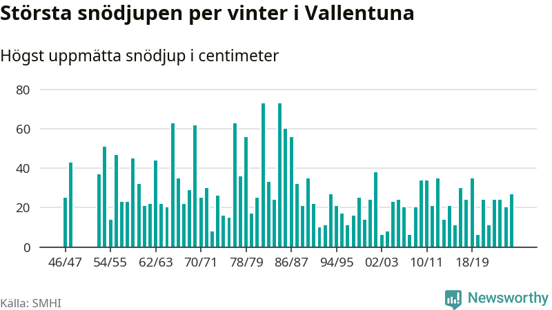 Men hur står sig det snödjupet historiskt sett? Newsworthy har tittat på det största snödjup som SMHI har uppmätt i Vallentuna kommun varje år sedan vintern 1946/47 – och hittills tar sig årets vinter inte in bland de 25 vintrarna med störst uppmätt snödjup i kommunen. Det ska sägas att det inte finns några noteringar för åren 1949–1952.