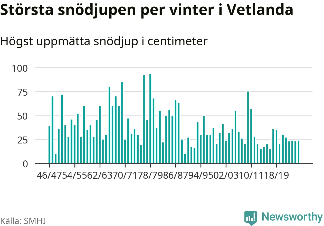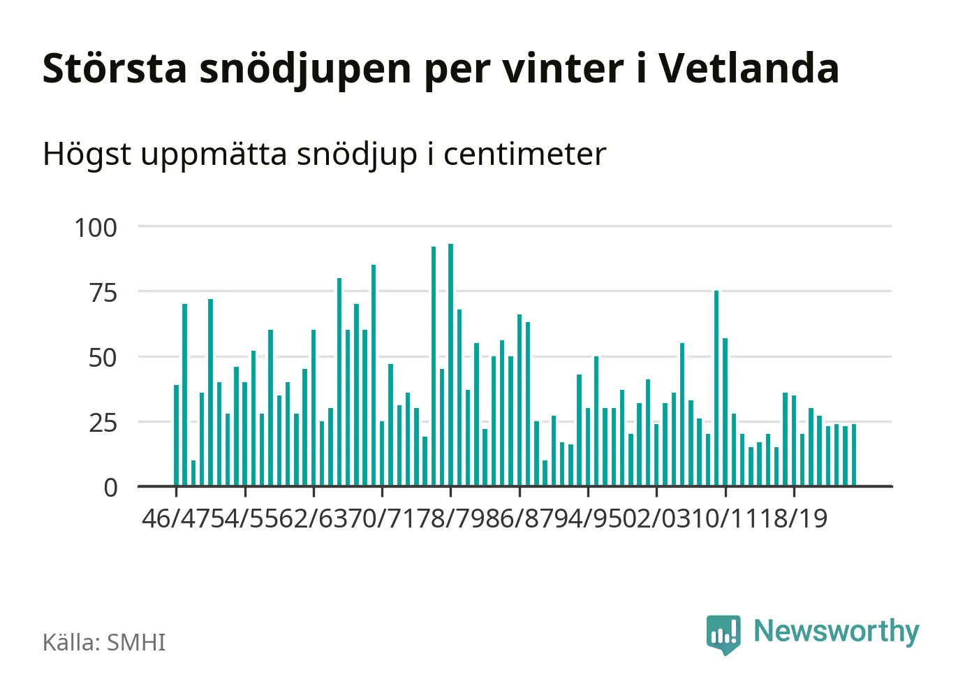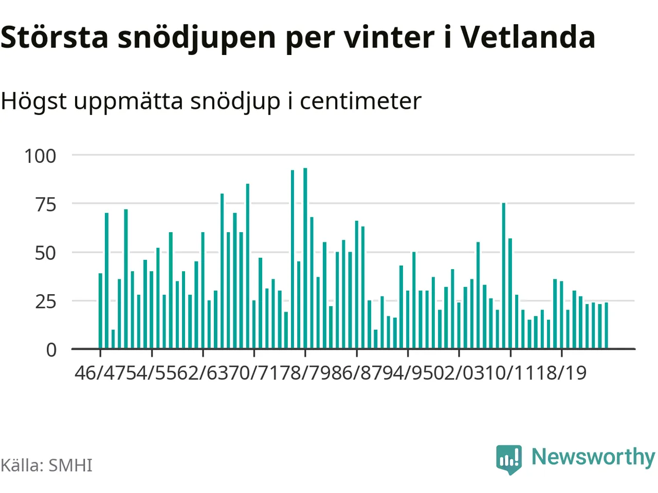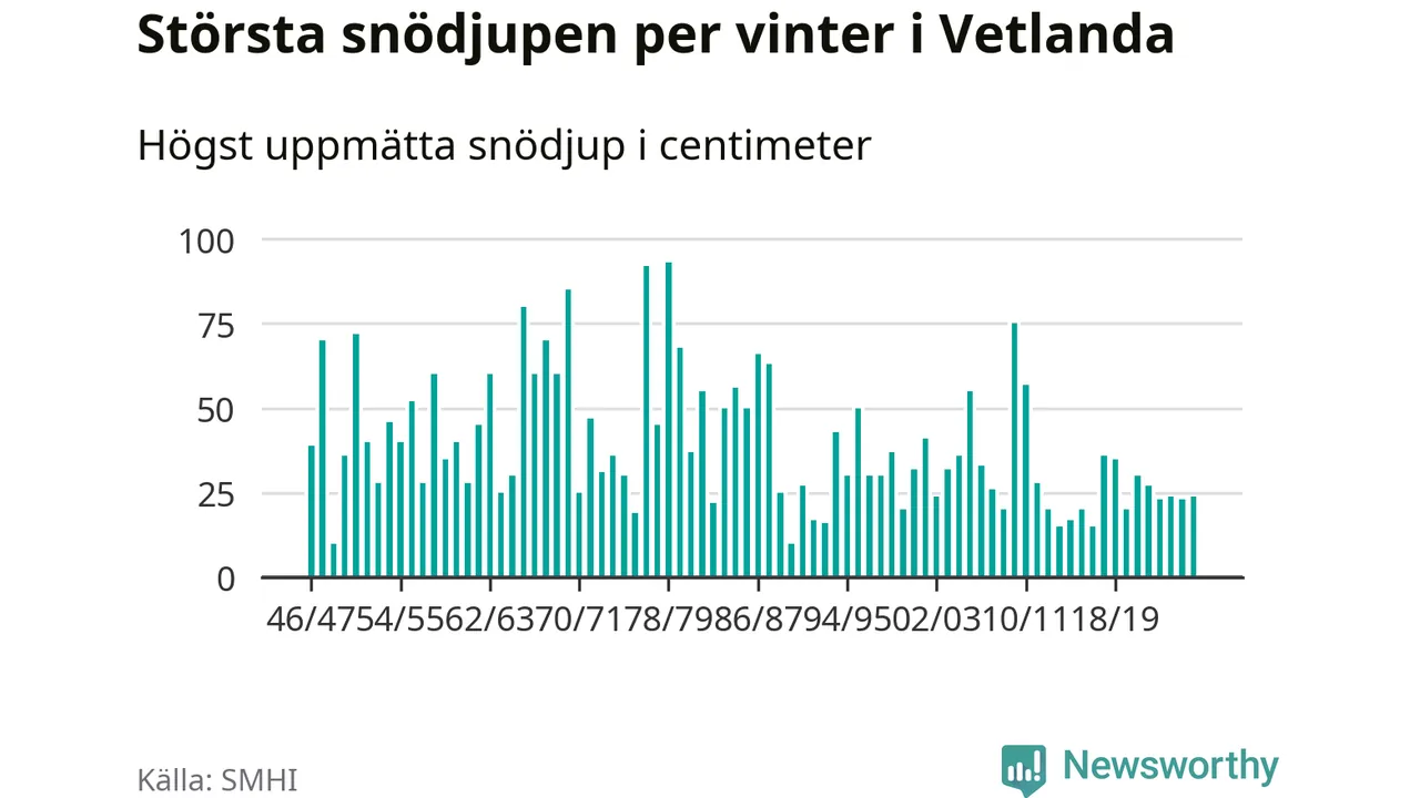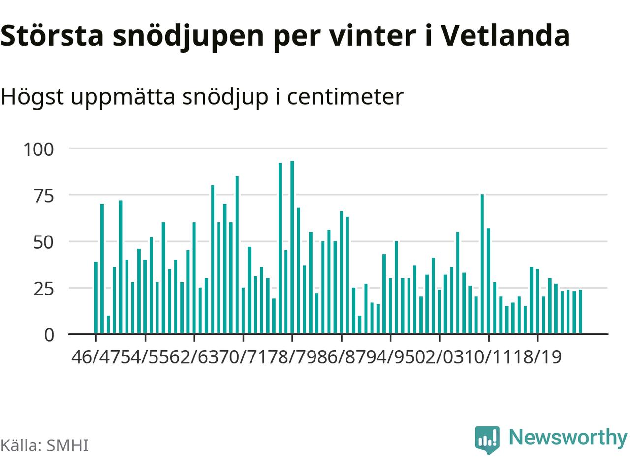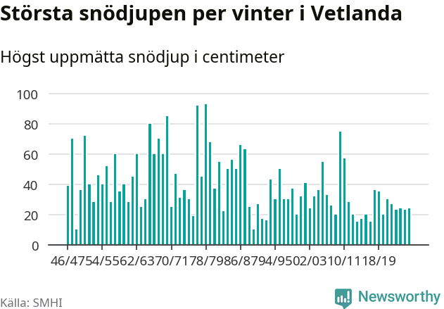 Men hur står sig det snödjupet historiskt sett? Newsworthy har tittat på det största snödjup som SMHI har uppmätt i Vetlanda kommun varje år sedan vintern 1946/47 – och hittills tar sig årets vinter inte in bland de 25 vintrarna med störst uppmätt snödjup i kommunen.