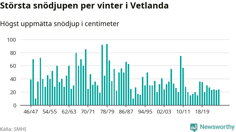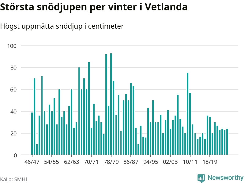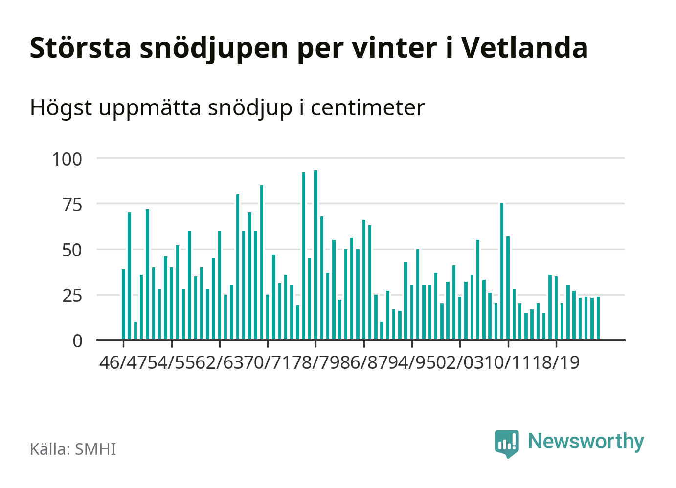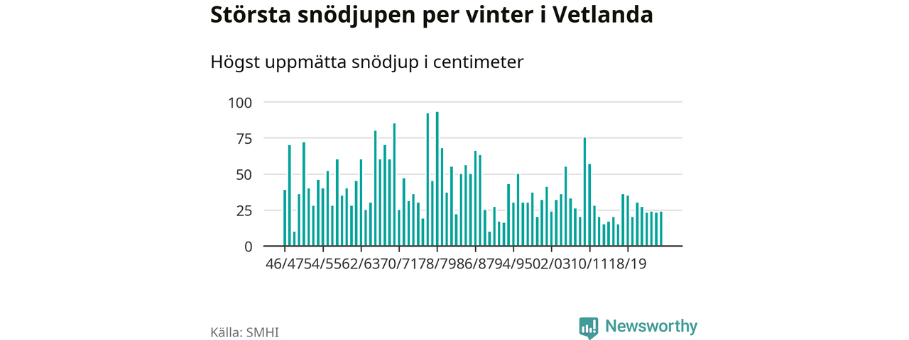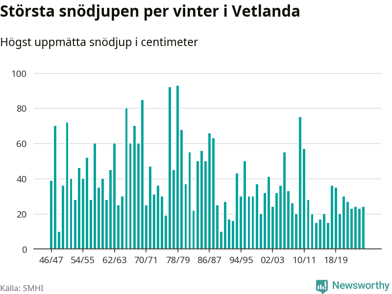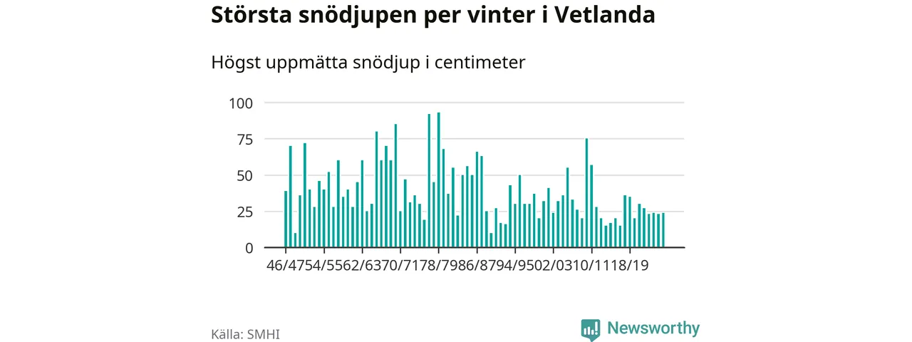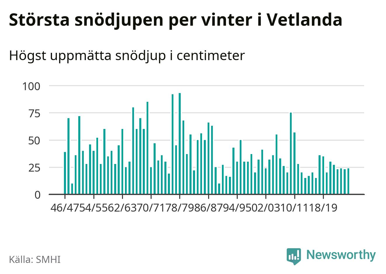 Men hur står sig det snödjupet historiskt sett? Newsworthy har tittat på det största snödjup som SMHI har uppmätt i Vetlanda kommun varje år sedan vintern 1946/47 – och hittills tar sig årets vinter inte in bland de 25 vintrarna med störst uppmätt snödjup i kommunen.