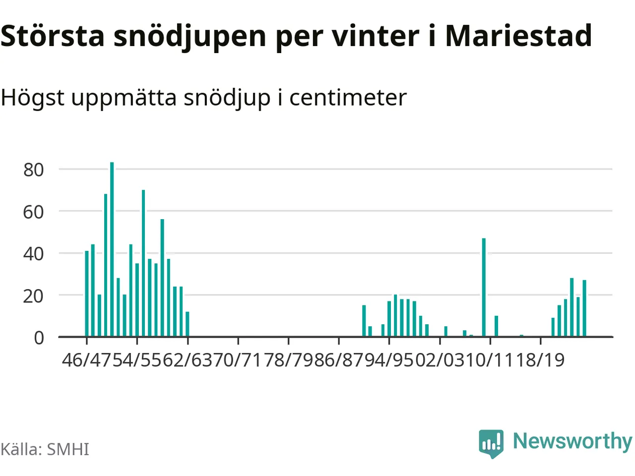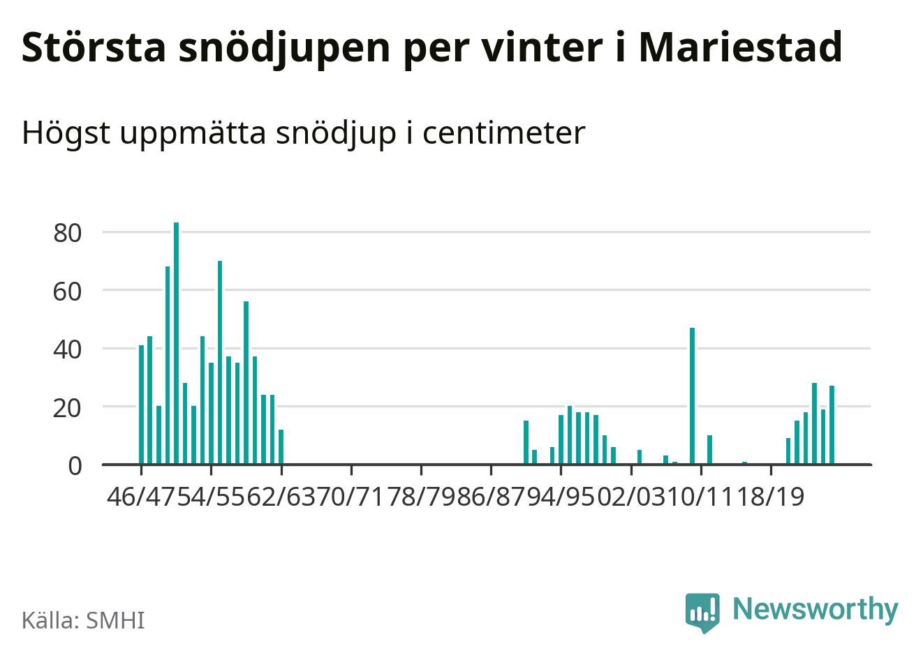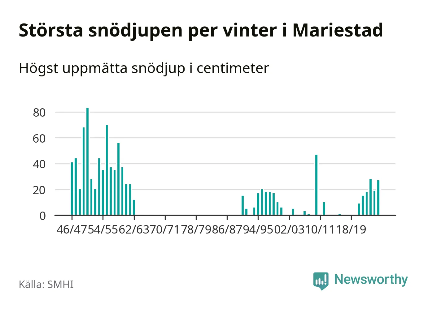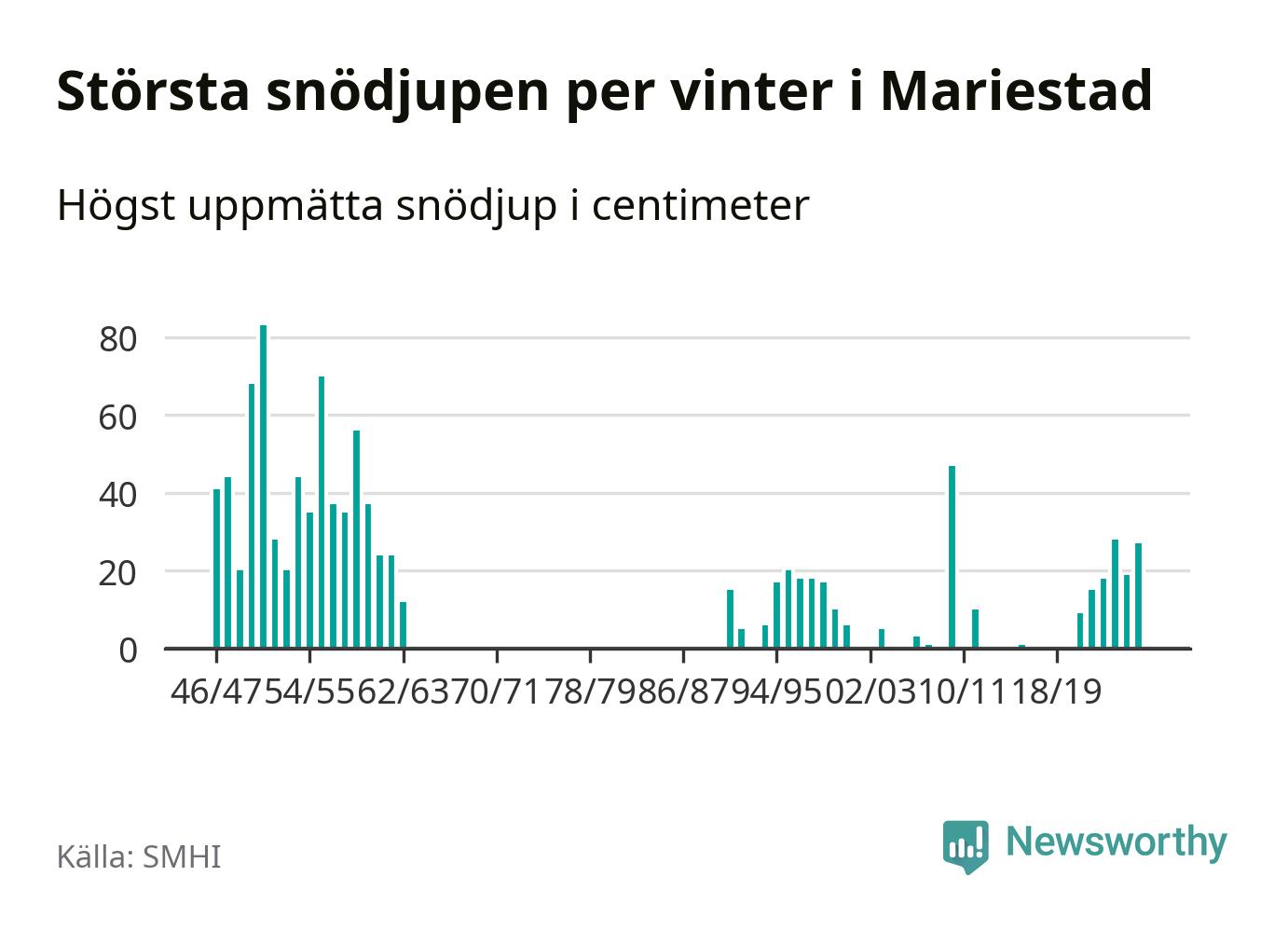 Men hur står sig det snödjupet historiskt sett? Newsworthy har tittat på det största snödjup som SMHI har uppmätt i Mariestads kommun varje år sedan vintern 1946/47. 14 vintrar har det uppmätts större snödjup. Det ska sägas att det inte finns några noteringar för åren 1964–1968, 1977–1980, 1982–1990, 1993, 2002, 2003, 2017 och 2019.