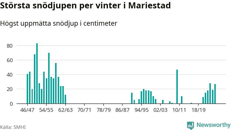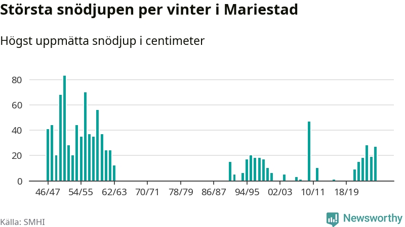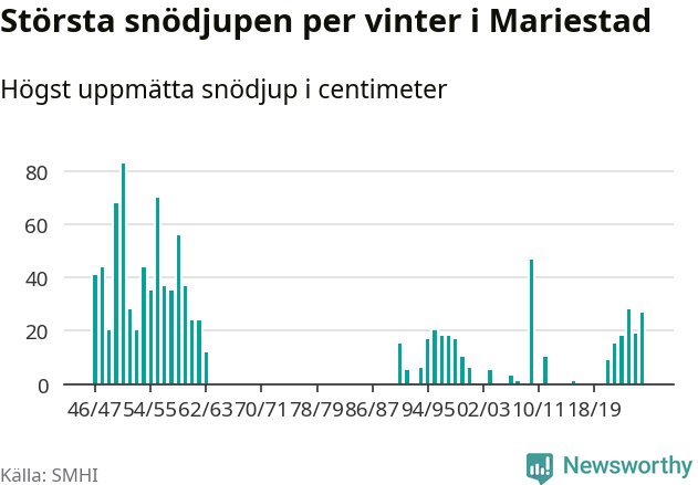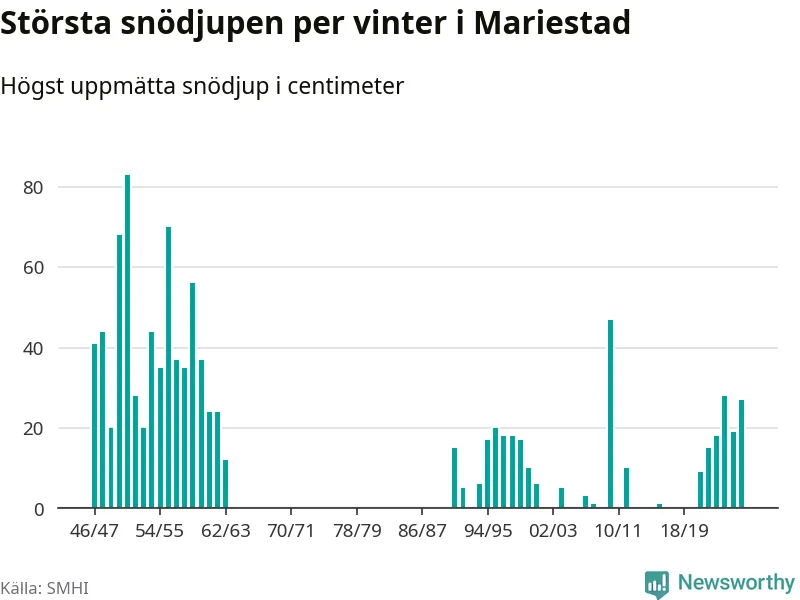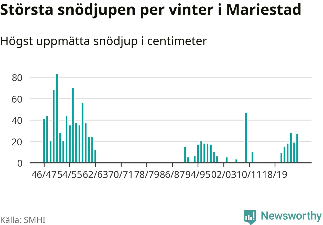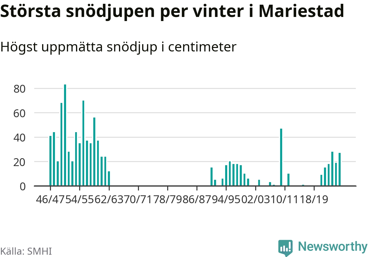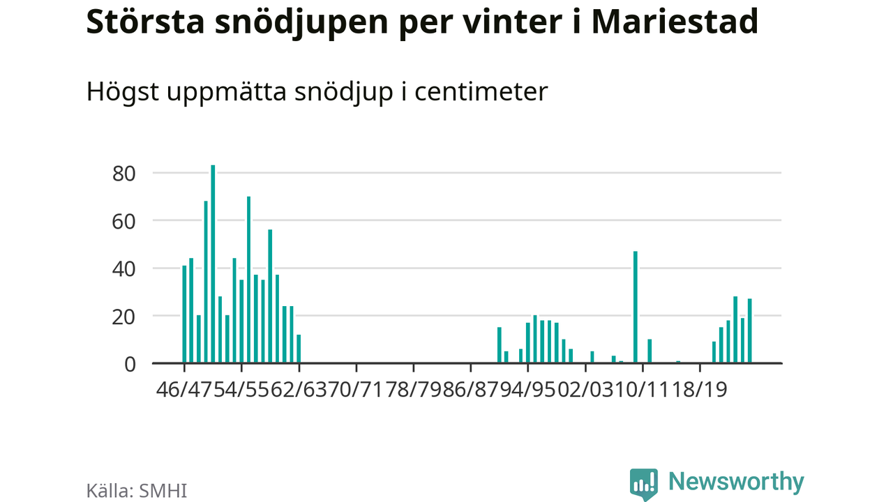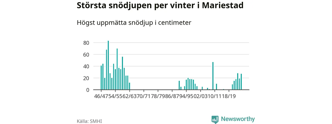 Men hur står sig det snödjupet historiskt sett? Newsworthy har tittat på det största snödjup som SMHI har uppmätt i Mariestads kommun varje år sedan vintern 1946/47. 14 vintrar har det uppmätts större snödjup. Det ska sägas att det inte finns några noteringar för åren 1964–1968, 1977–1980, 1982–1990, 1993, 2002, 2003, 2017 och 2019.
