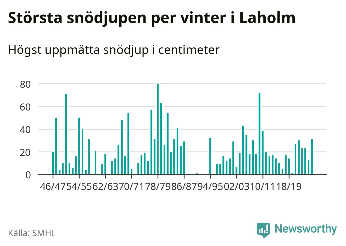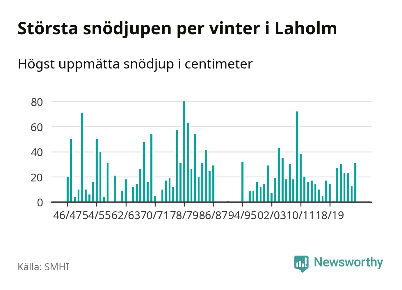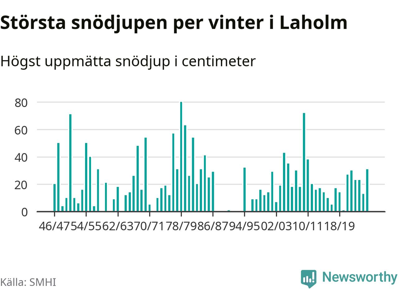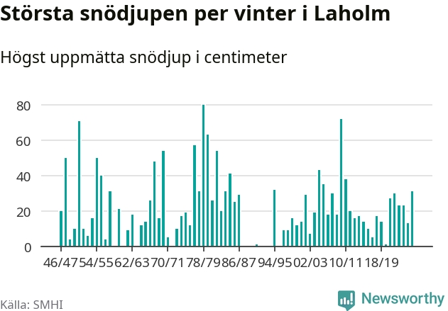 Men hur står sig det snödjupet historiskt sett? Newsworthy har tittat på det största snödjup som SMHI har uppmätt i Laholms kommun varje år sedan vintern 1946/47. 16 vintrar har det uppmätts större snödjup. Det ska sägas att det inte finns några noteringar för åren 1959, 1961, 1964, 1972, 1988–1990, 1992–1994 och 1996.
