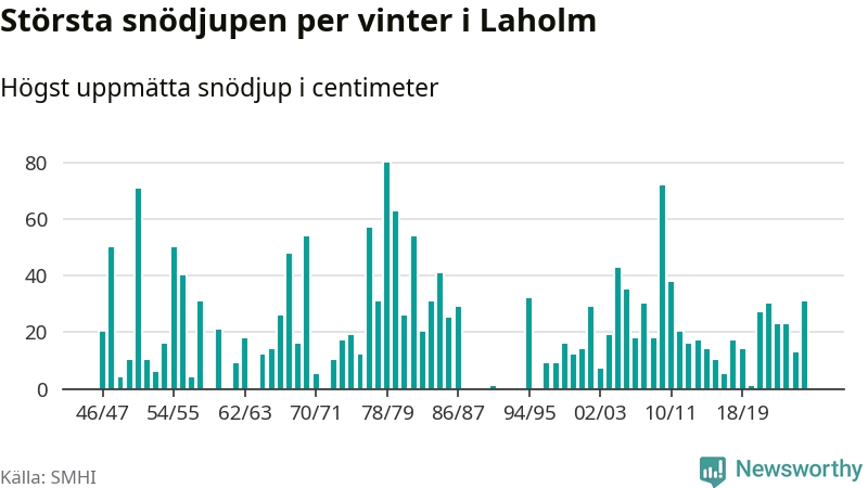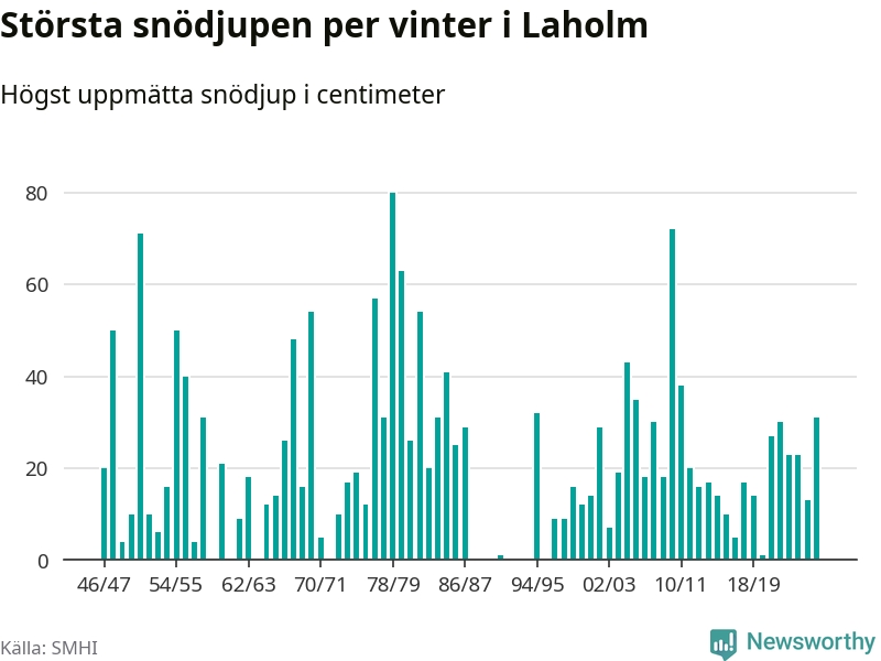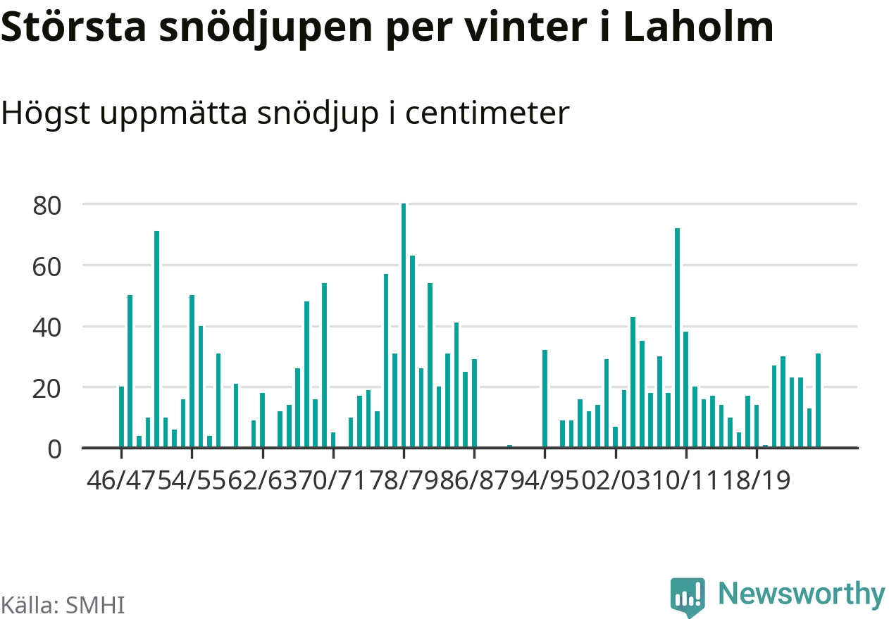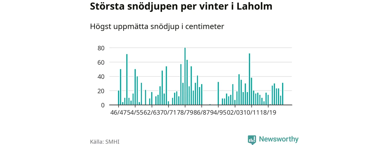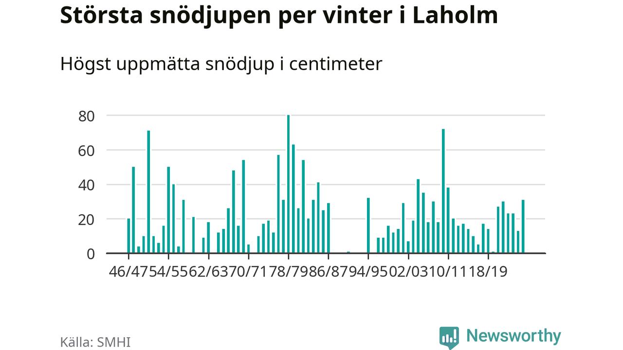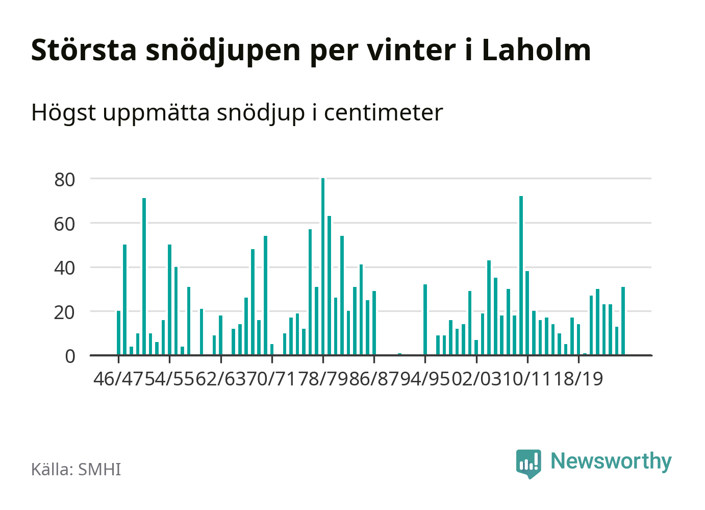 Men hur står sig det snödjupet historiskt sett? Newsworthy har tittat på det största snödjup som SMHI har uppmätt i Laholms kommun varje år sedan vintern 1946/47. 16 vintrar har det uppmätts större snödjup. Det ska sägas att det inte finns några noteringar för åren 1959, 1961, 1964, 1972, 1988–1990, 1992–1994 och 1996.