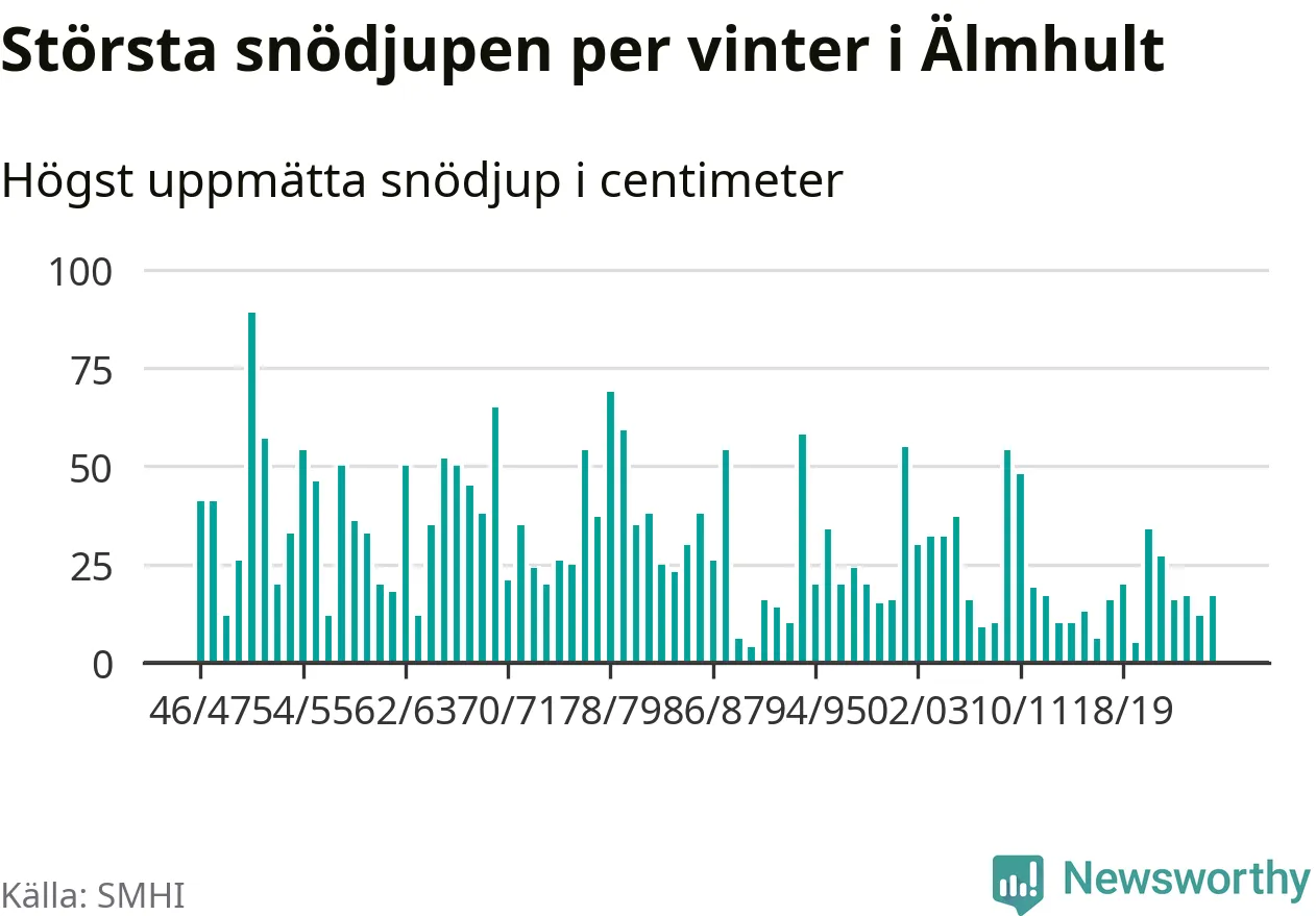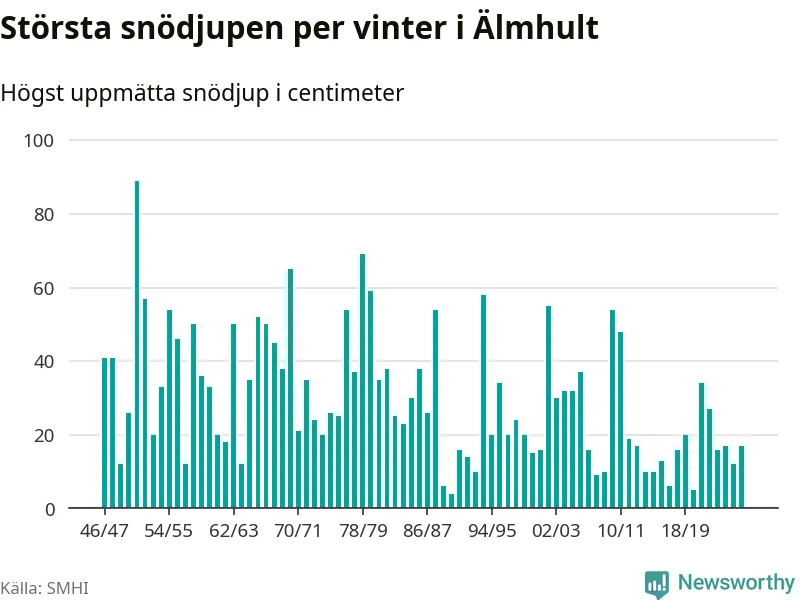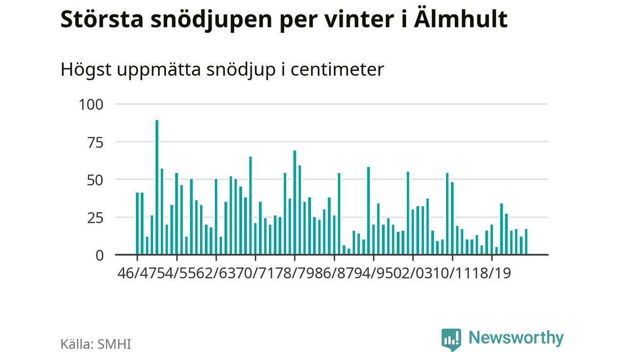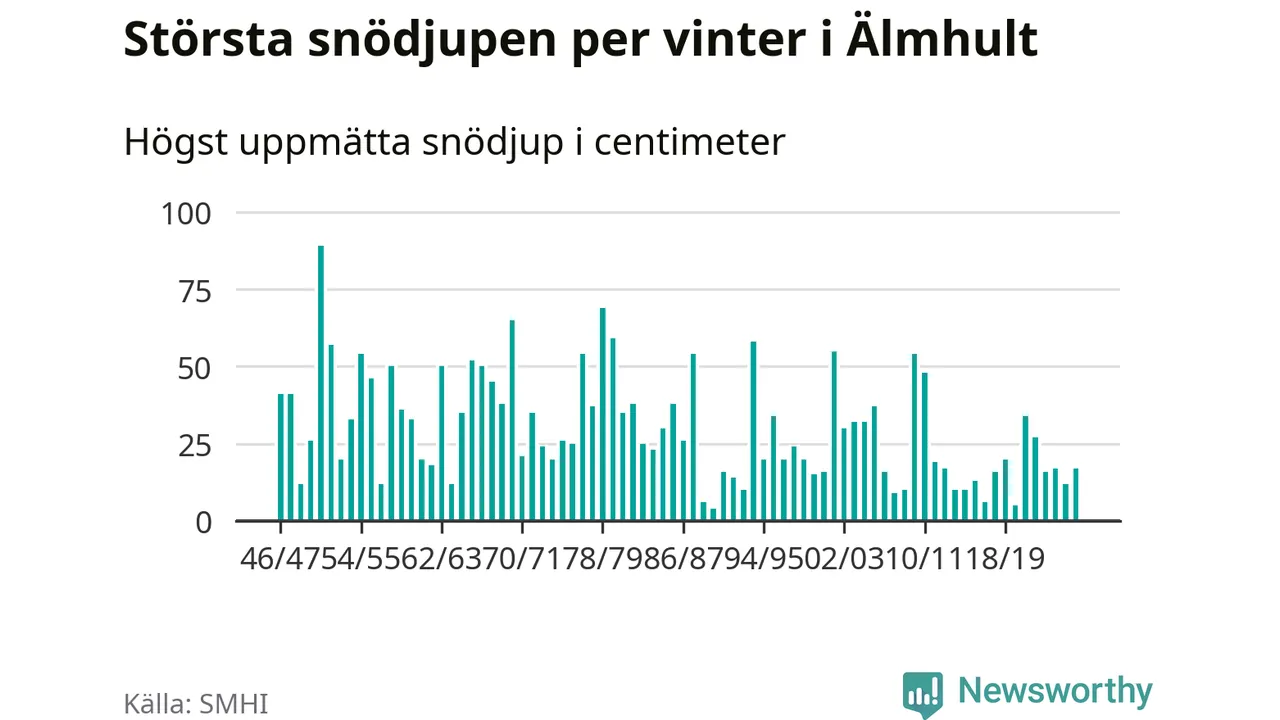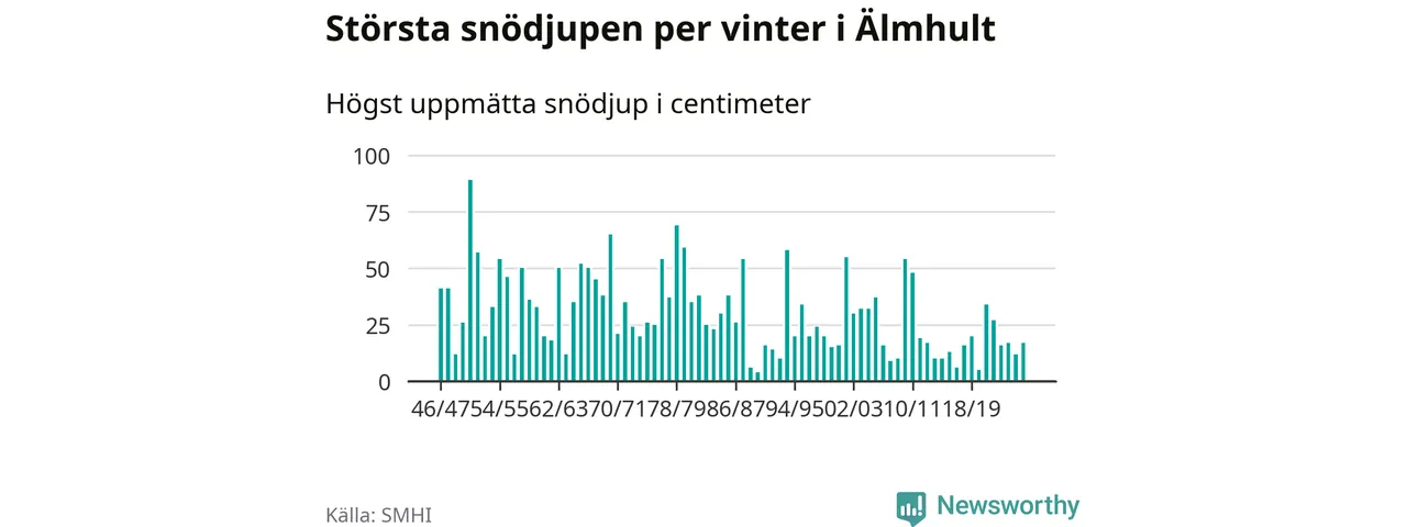 Men hur står sig det snödjupet historiskt sett? Newsworthy har tittat på det största snödjup som SMHI har uppmätt i Älmhults kommun varje år sedan vintern 1946/47 – och hittills tar sig årets vinter inte in bland de 25 vintrarna med störst uppmätt snödjup i kommunen.