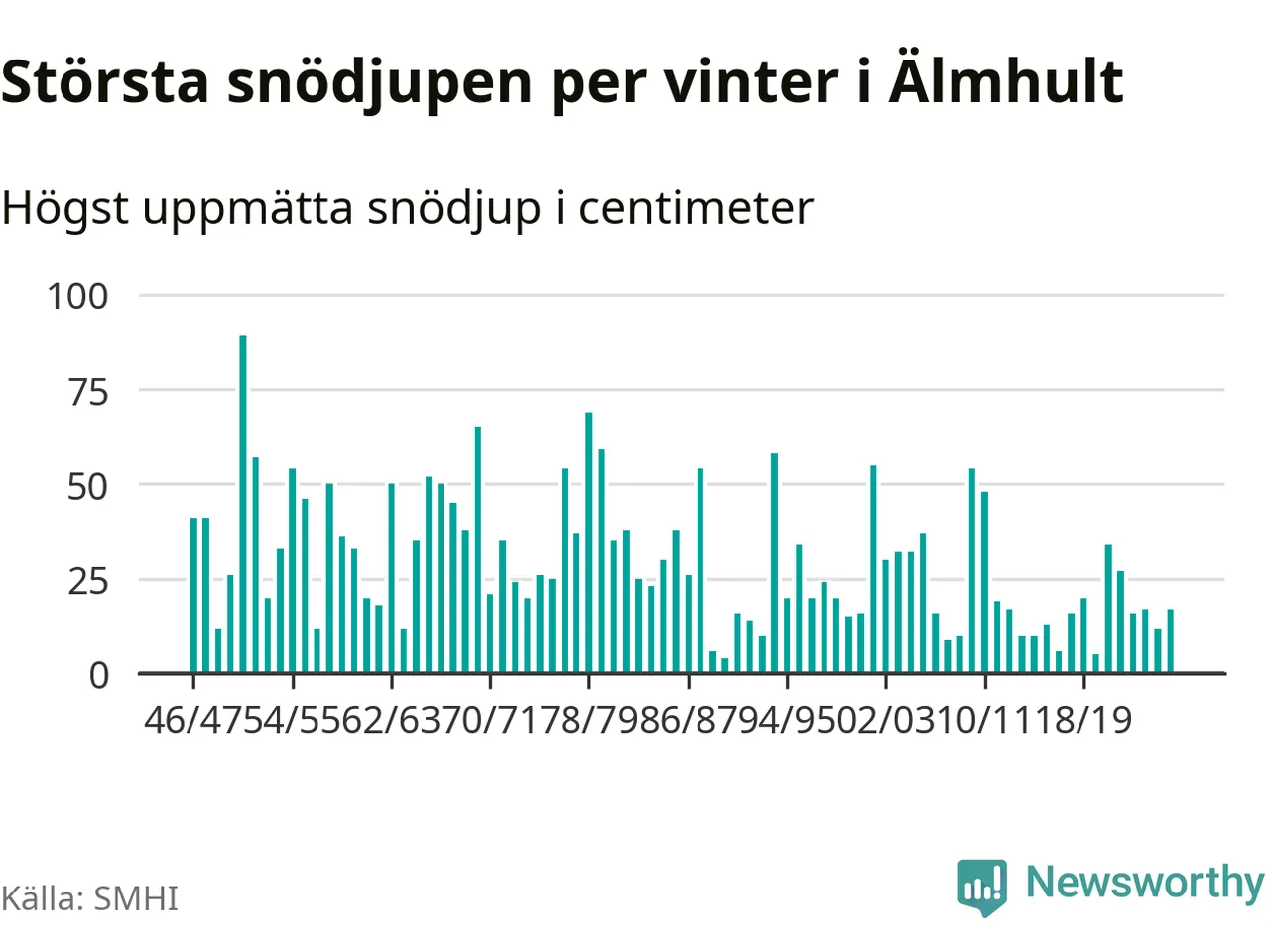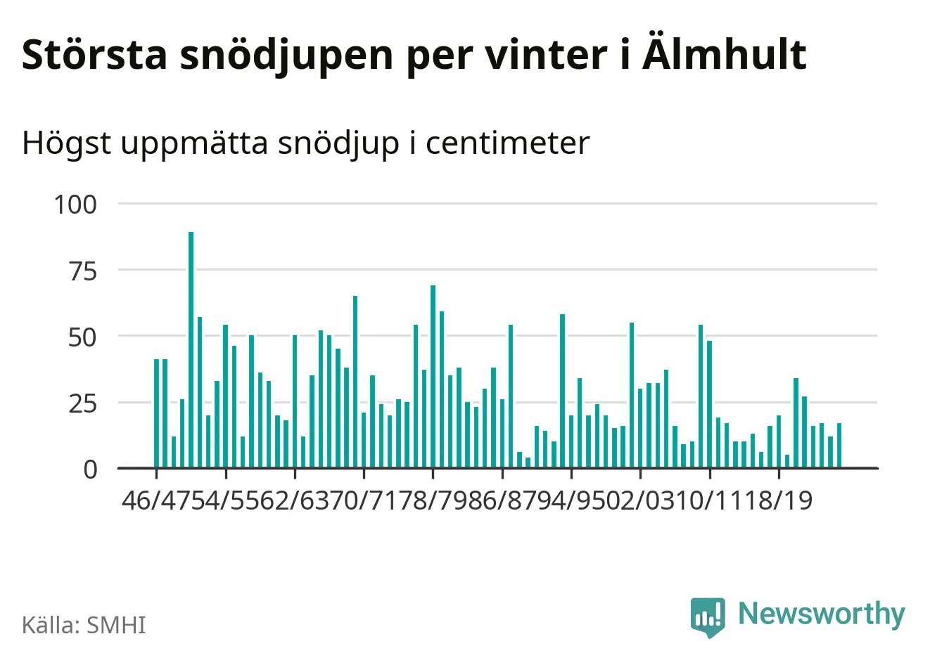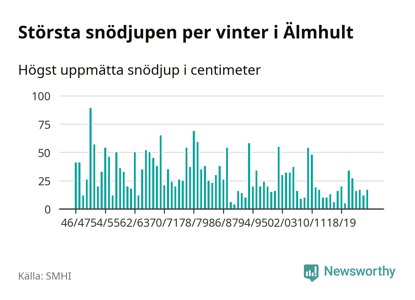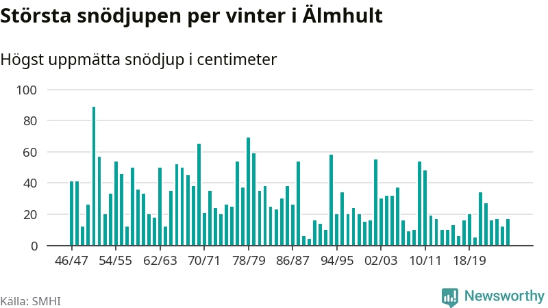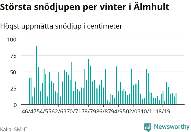 Men hur står sig det snödjupet historiskt sett? Newsworthy har tittat på det största snödjup som SMHI har uppmätt i Älmhults kommun varje år sedan vintern 1946/47 – och hittills tar sig årets vinter inte in bland de 25 vintrarna med störst uppmätt snödjup i kommunen.