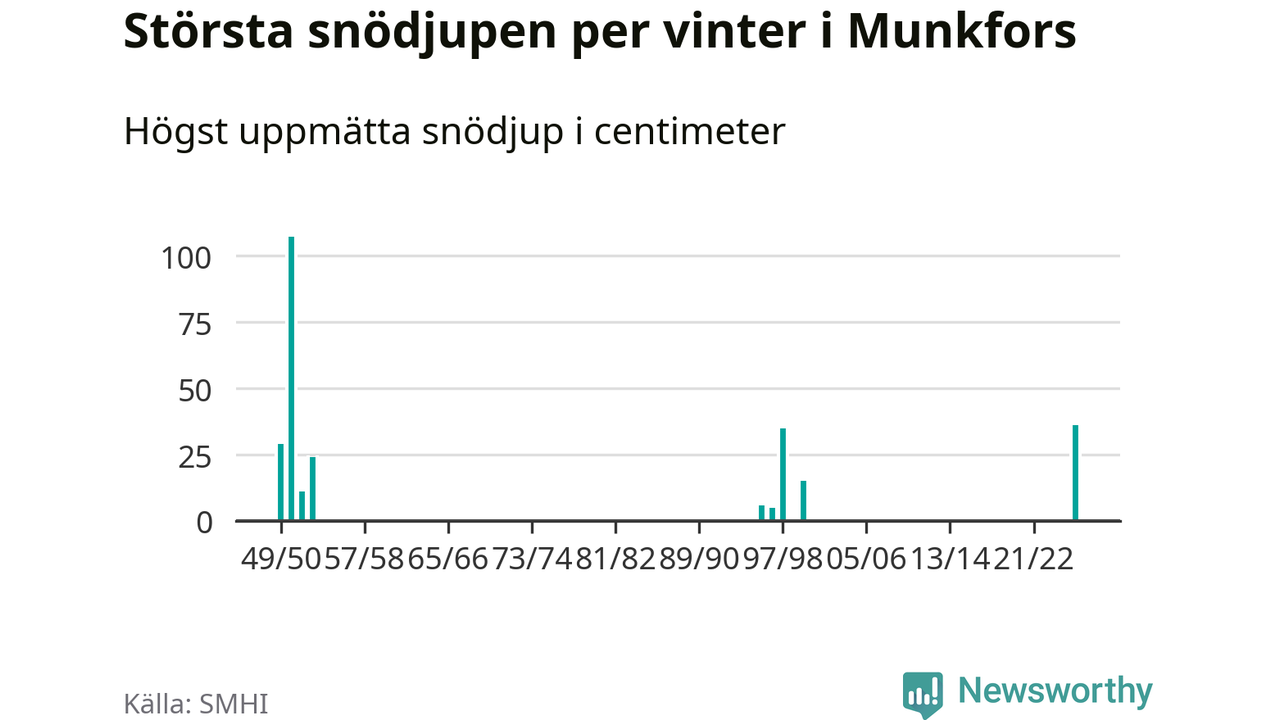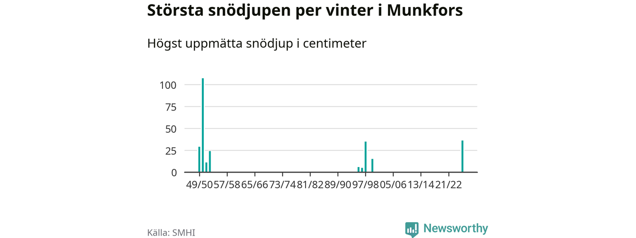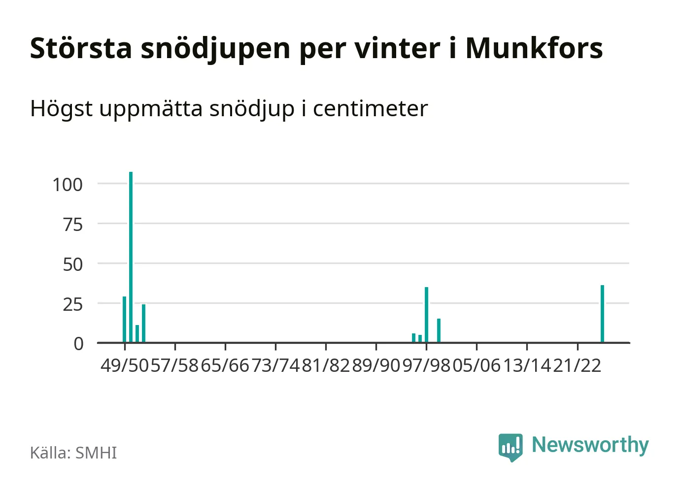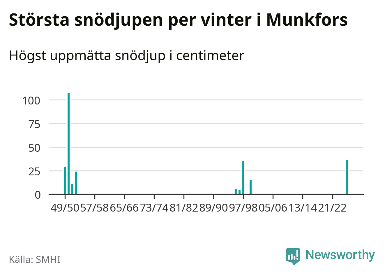 Men hur står sig det snödjupet historiskt sett? Newsworthy har tittat på det största snödjup som SMHI har uppmätt i Munkfors kommun varje år sedan vintern 1949/50 – och hittills är årets vinter den med näst största uppmätta snödjup i kommunen. Det ska sägas att det fattas uppgifter för de flesta av de här vintrarna, och för de senaste vintrarna har vi bara uppgift för en.