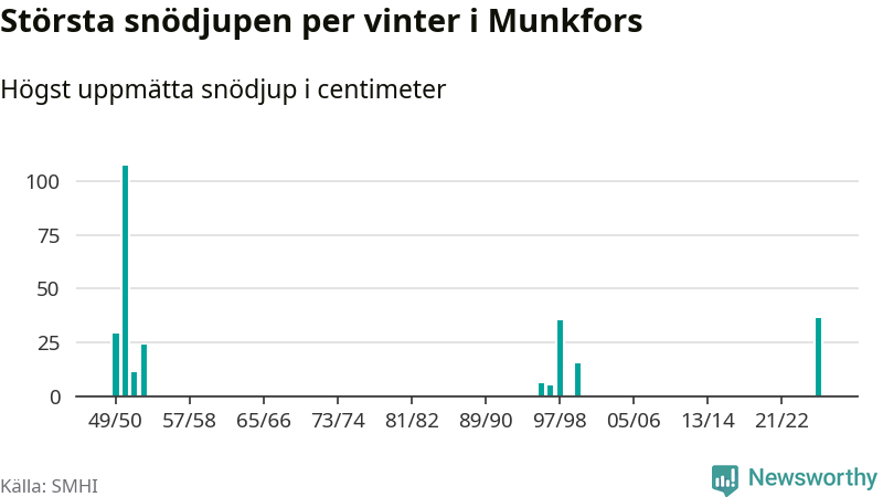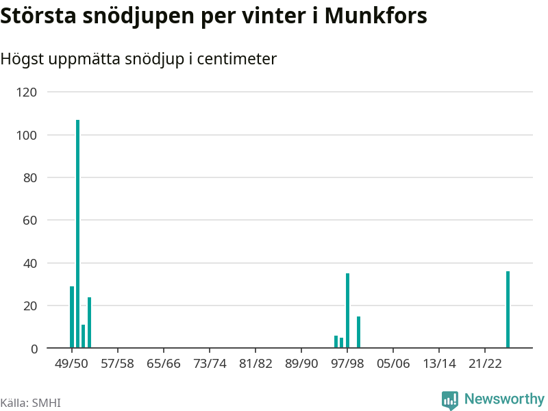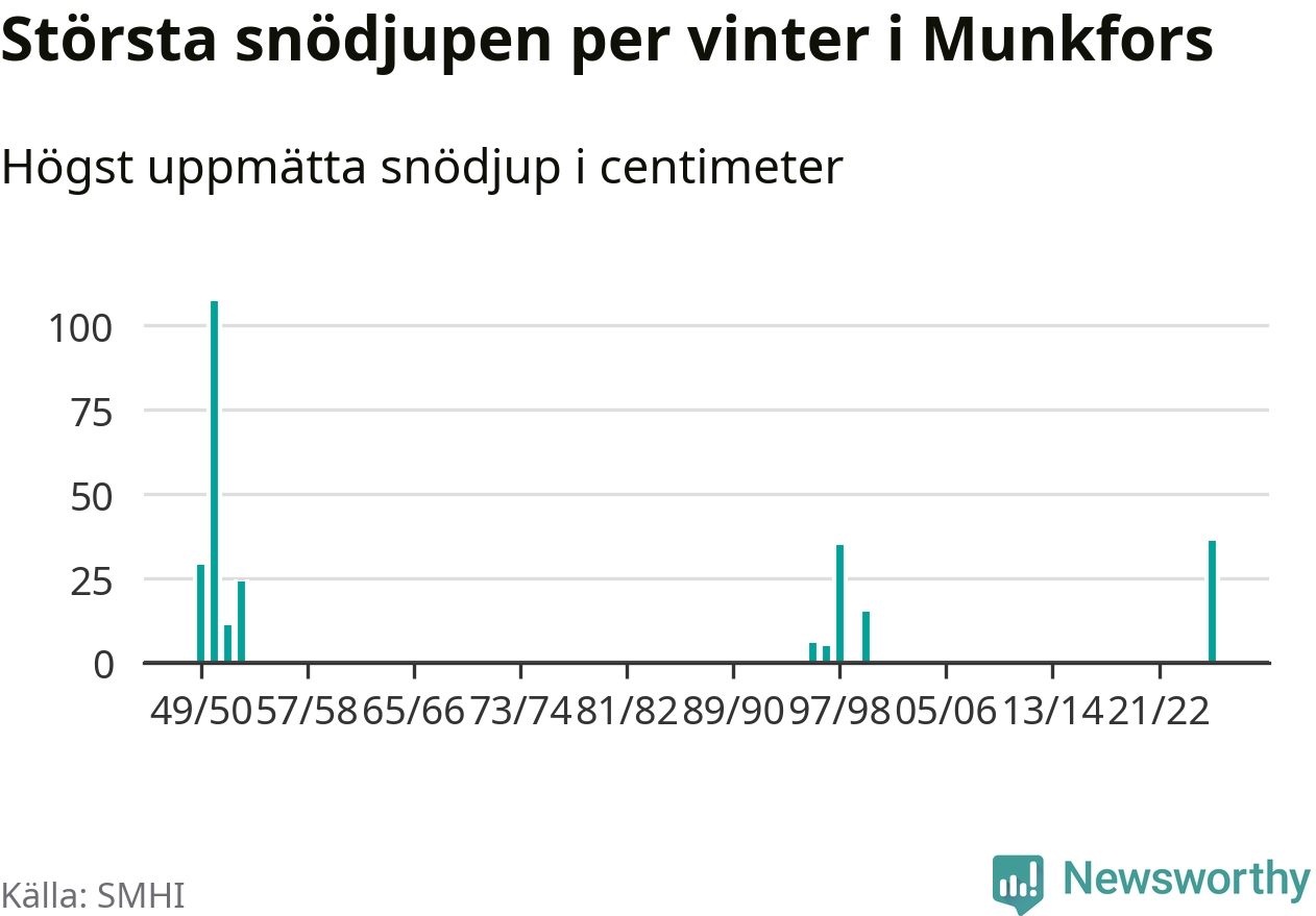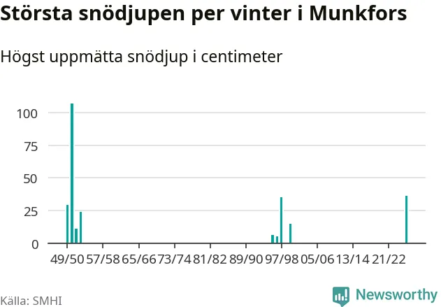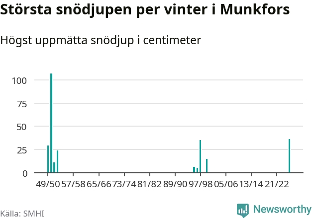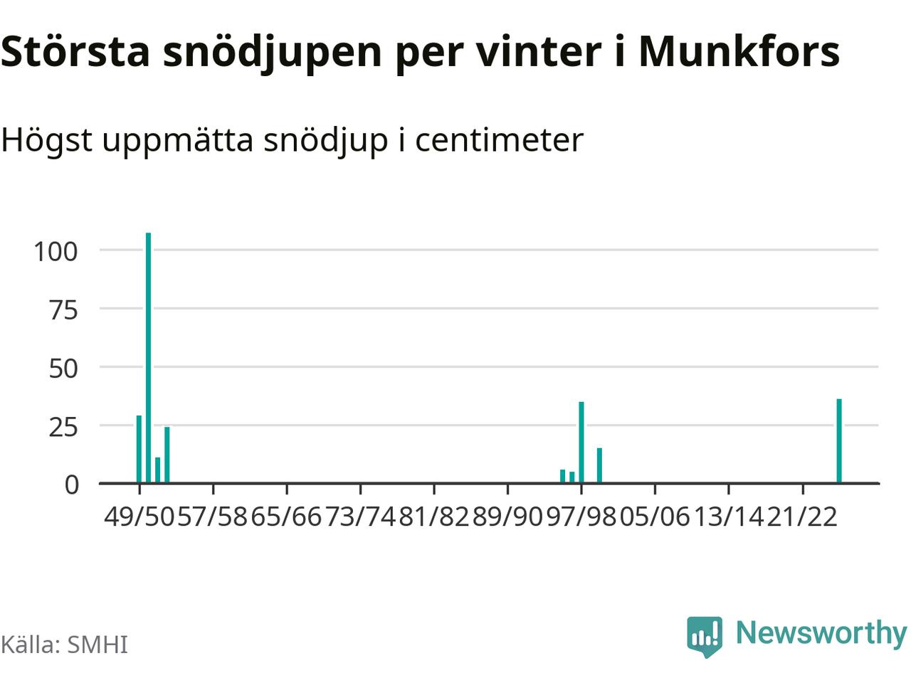 Men hur står sig det snödjupet historiskt sett? Newsworthy har tittat på det största snödjup som SMHI har uppmätt i Munkfors kommun varje år sedan vintern 1949/50 – och hittills är årets vinter den med näst största uppmätta snödjup i kommunen. Det ska sägas att det fattas uppgifter för de flesta av de här vintrarna, och för de senaste vintrarna har vi bara uppgift för en.