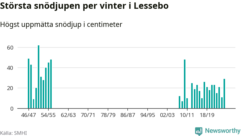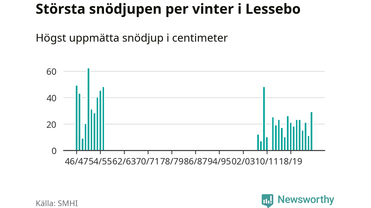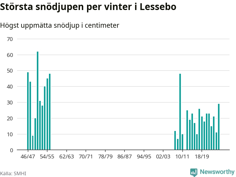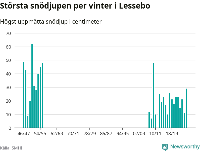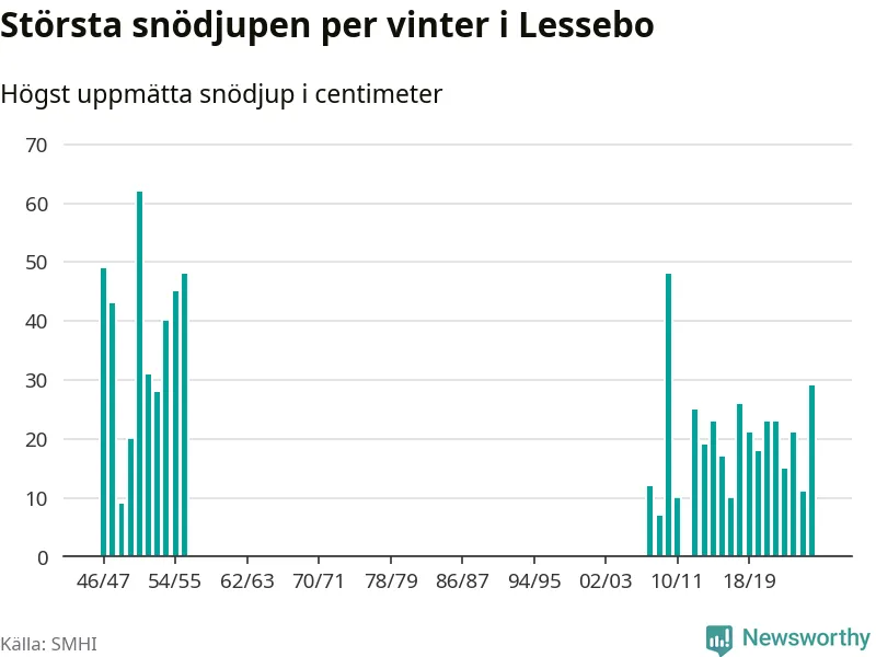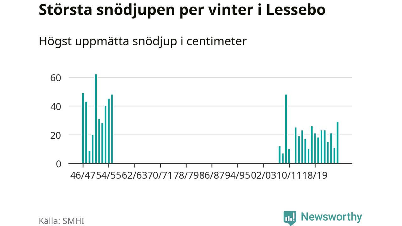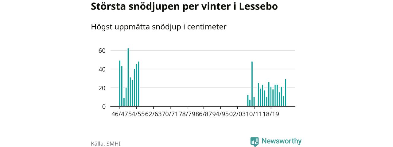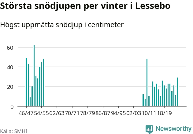 Men hur står sig det snödjupet historiskt sett? Newsworthy har tittat på det största snödjup som SMHI har uppmätt i Lessebo kommun varje år sedan vintern 1946/47. Åtta vintrar har det uppmätts större snödjup. Det ska sägas att det fattas uppgifter för de flesta av de här vintrarna