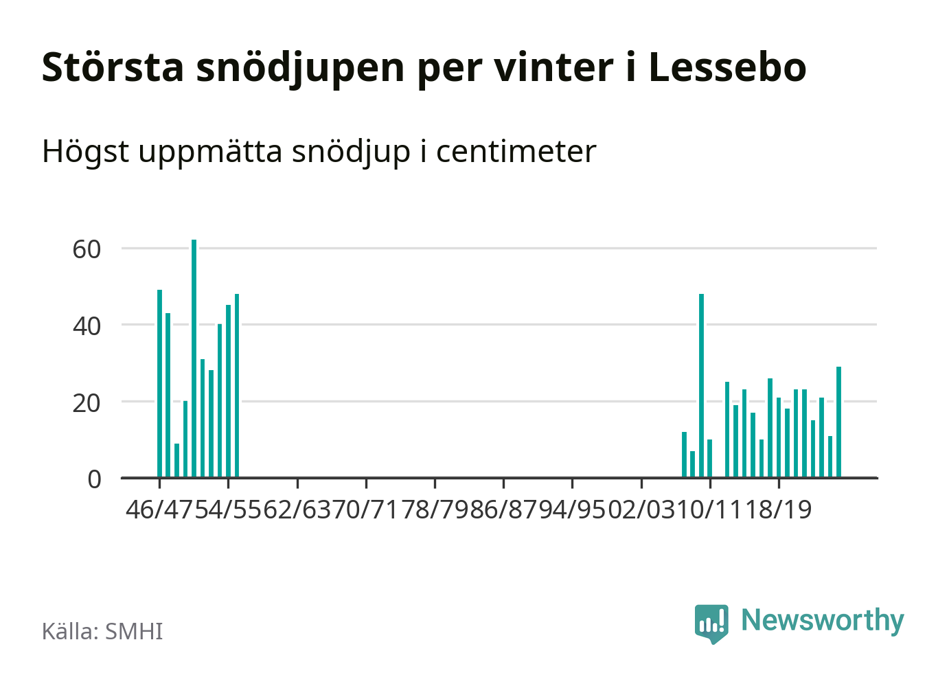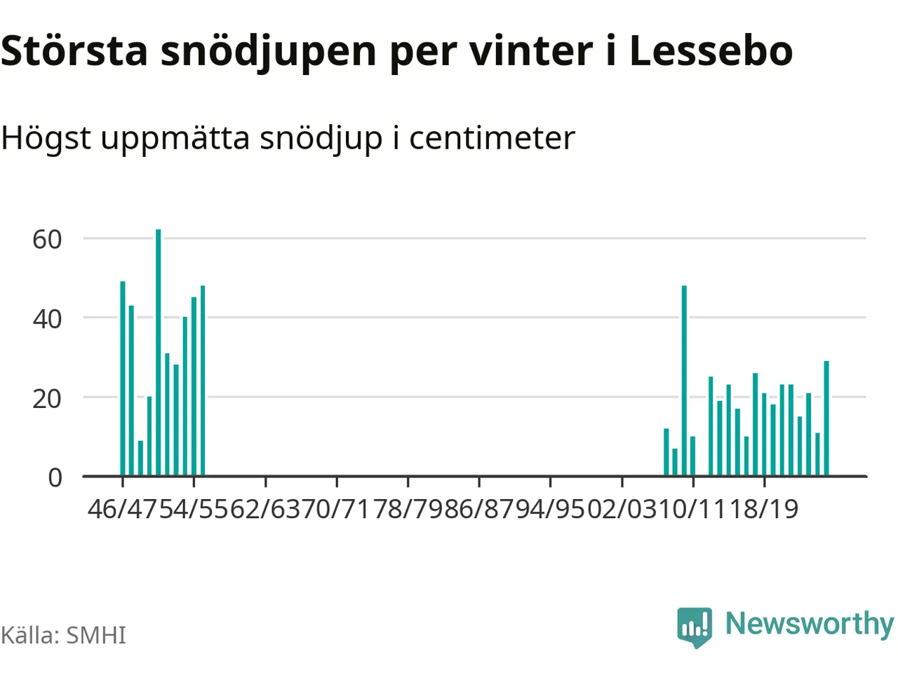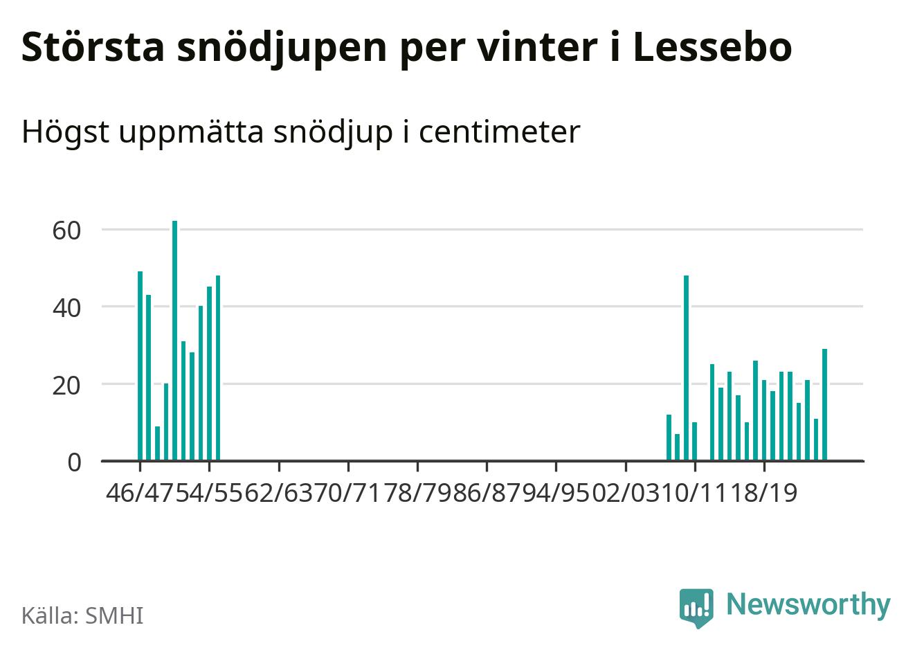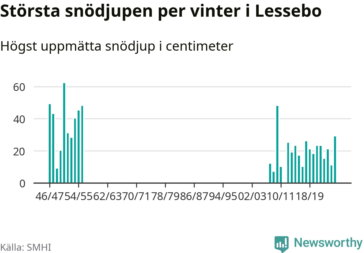 Men hur står sig det snödjupet historiskt sett? Newsworthy har tittat på det största snödjup som SMHI har uppmätt i Lessebo kommun varje år sedan vintern 1946/47. Åtta vintrar har det uppmätts större snödjup. Det ska sägas att det fattas uppgifter för de flesta av de här vintrarna