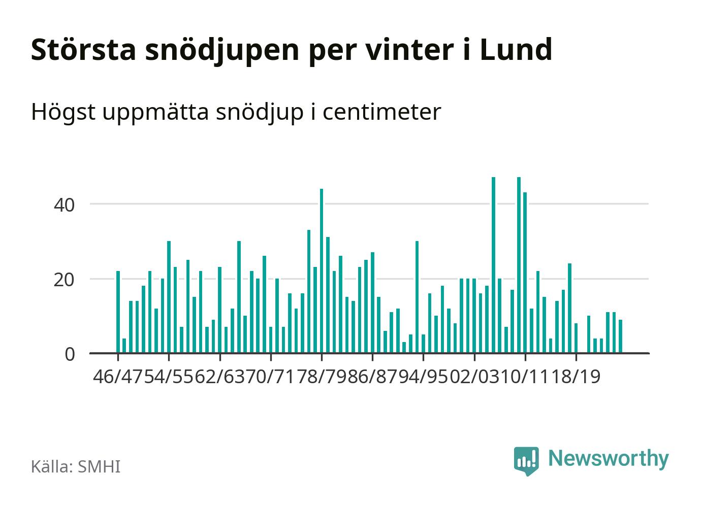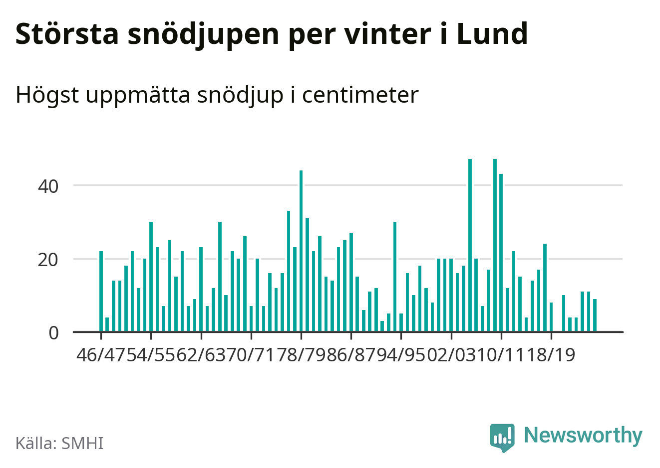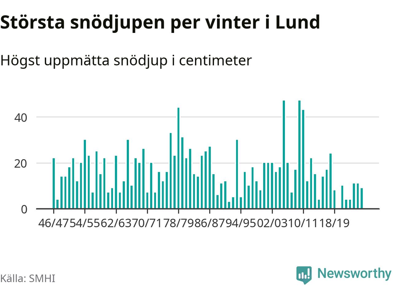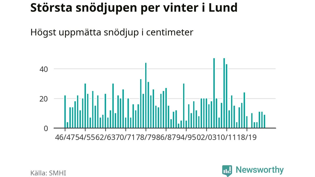 Men hur står sig det snödjupet historiskt sett? Newsworthy har tittat på det största snödjup som SMHI har uppmätt i Lunds kommun varje år sedan vintern 1946/47 – och hittills tar sig årets vinter inte in bland de 25 vintrarna med störst uppmätt snödjup i kommunen.