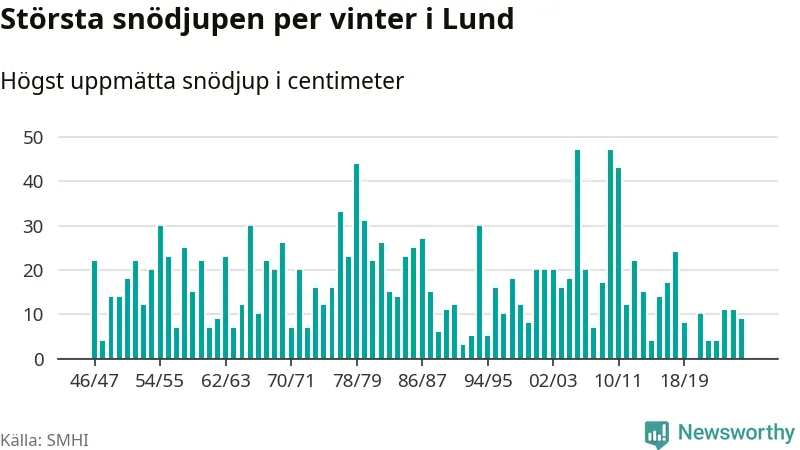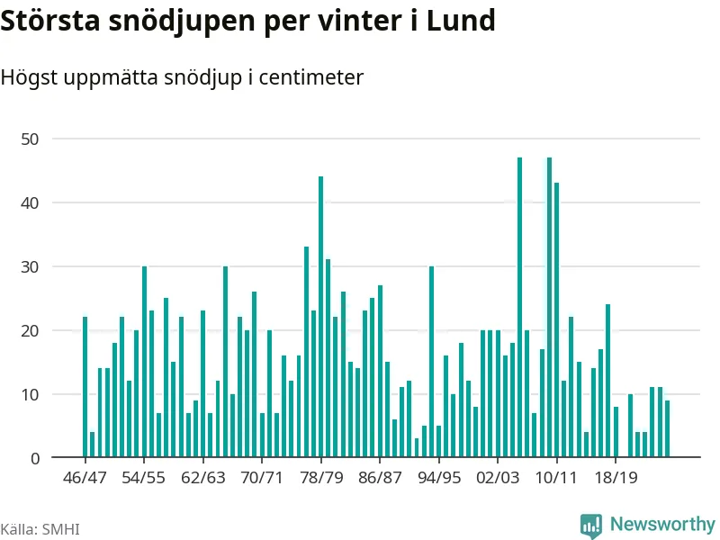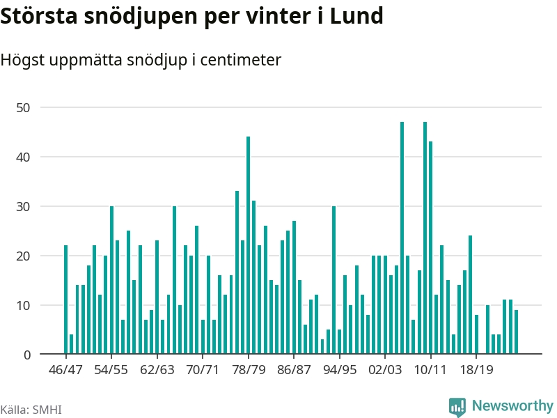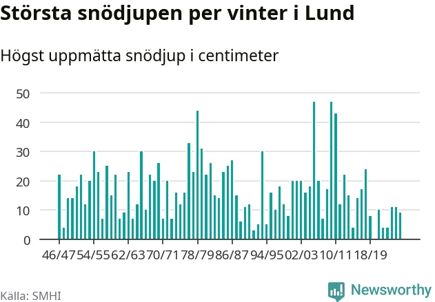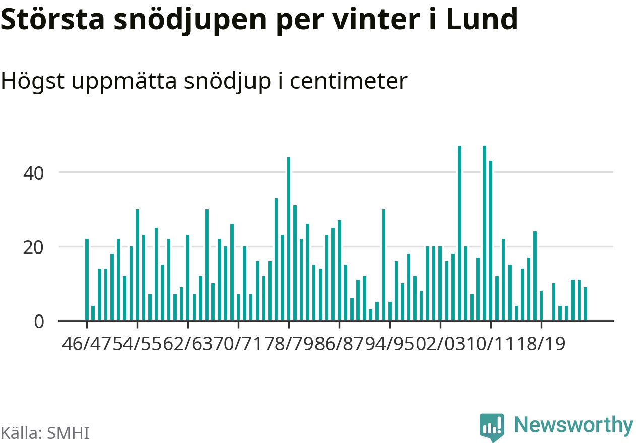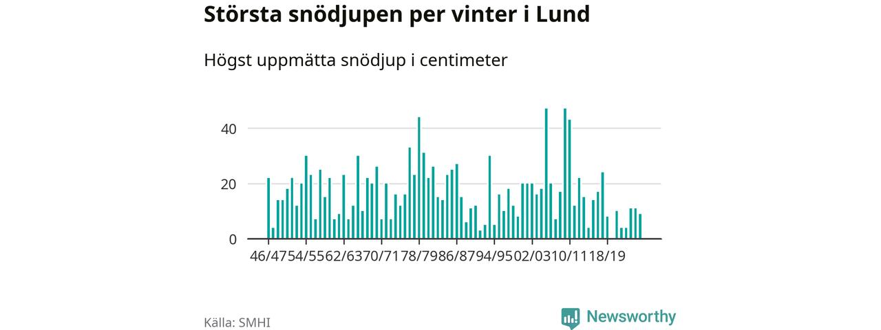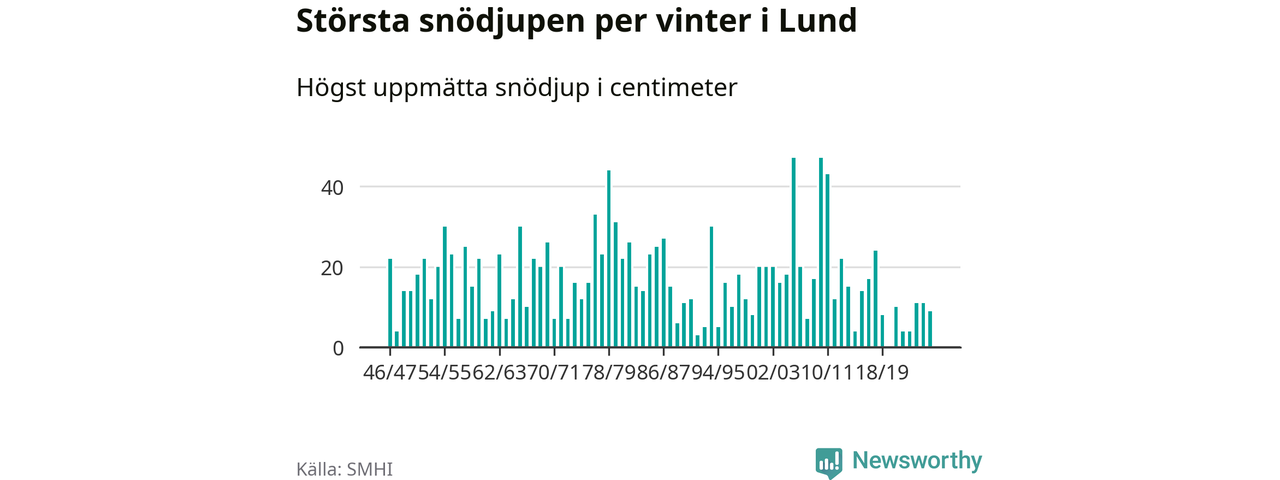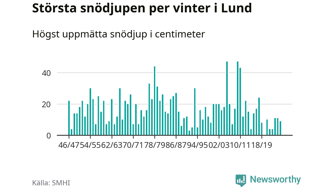 Men hur står sig det snödjupet historiskt sett? Newsworthy har tittat på det största snödjup som SMHI har uppmätt i Lunds kommun varje år sedan vintern 1946/47 – och hittills tar sig årets vinter inte in bland de 25 vintrarna med störst uppmätt snödjup i kommunen.