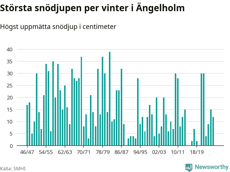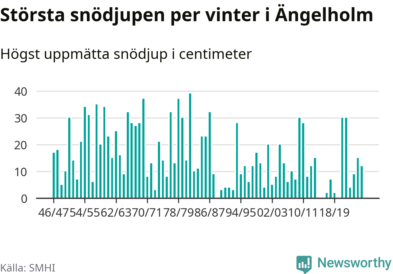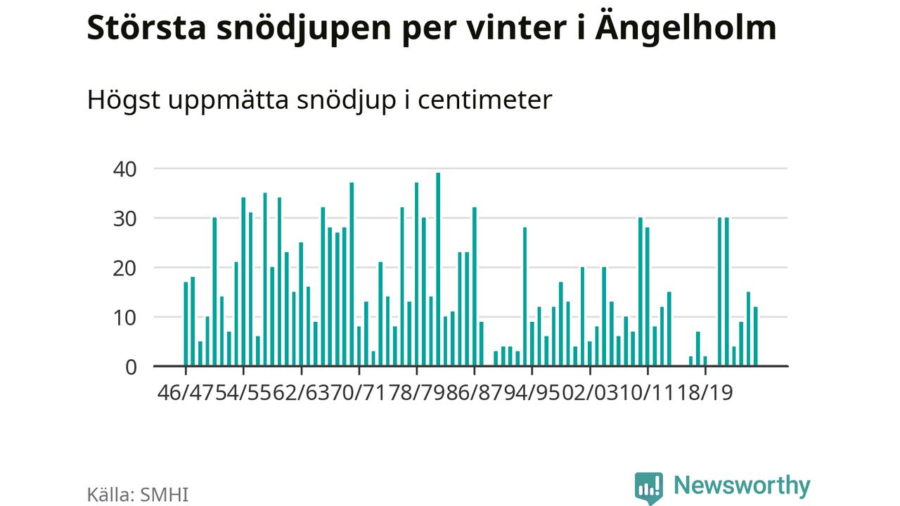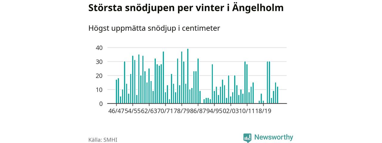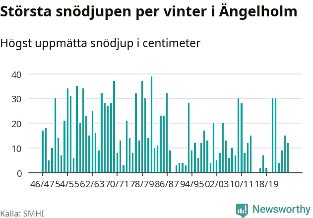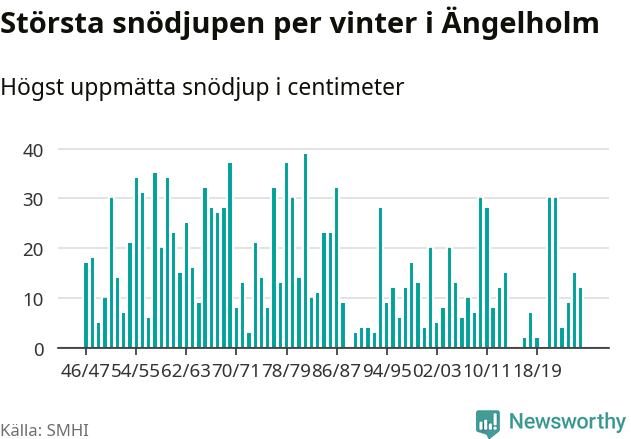 Men hur står sig det snödjupet historiskt sett? Newsworthy har tittat på det största snödjup som SMHI har uppmätt i Ängelholms kommun varje år sedan vintern 1946/47 – och hittills tar sig årets vinter inte in bland de 25 vintrarna med störst uppmätt snödjup i kommunen. Det ska sägas att det inte finns någon notering för 2016.