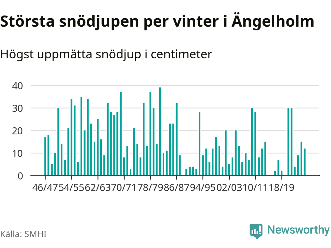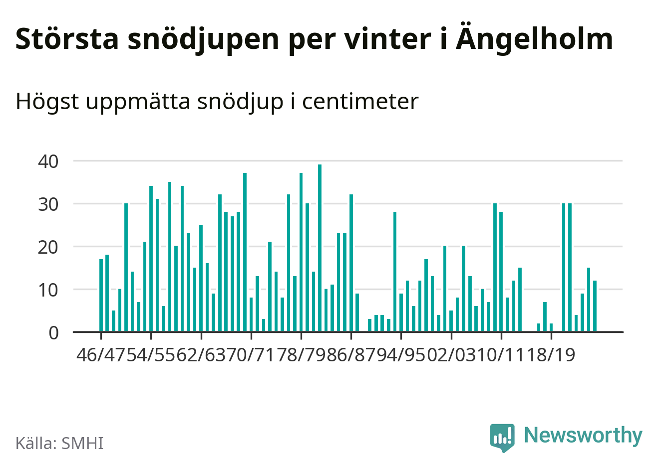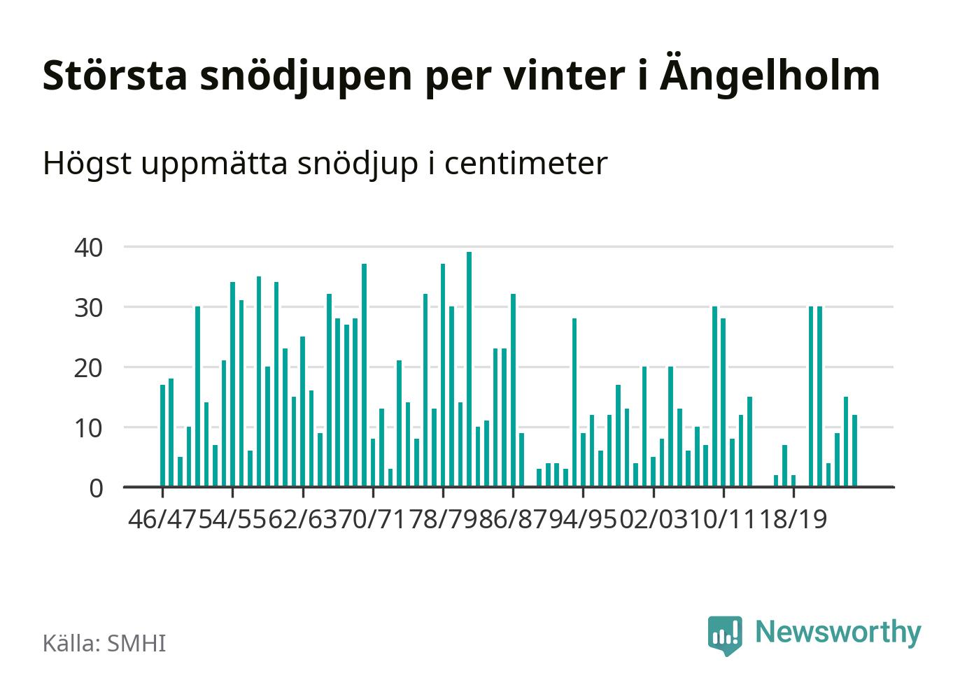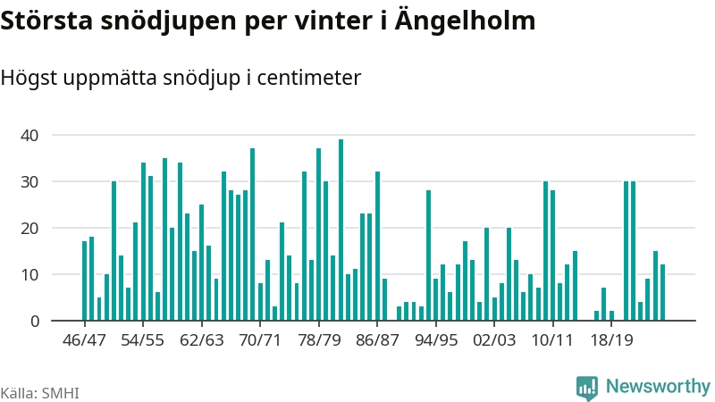 Men hur står sig det snödjupet historiskt sett? Newsworthy har tittat på det största snödjup som SMHI har uppmätt i Ängelholms kommun varje år sedan vintern 1946/47 – och hittills tar sig årets vinter inte in bland de 25 vintrarna med störst uppmätt snödjup i kommunen. Det ska sägas att det inte finns någon notering för 2016.
