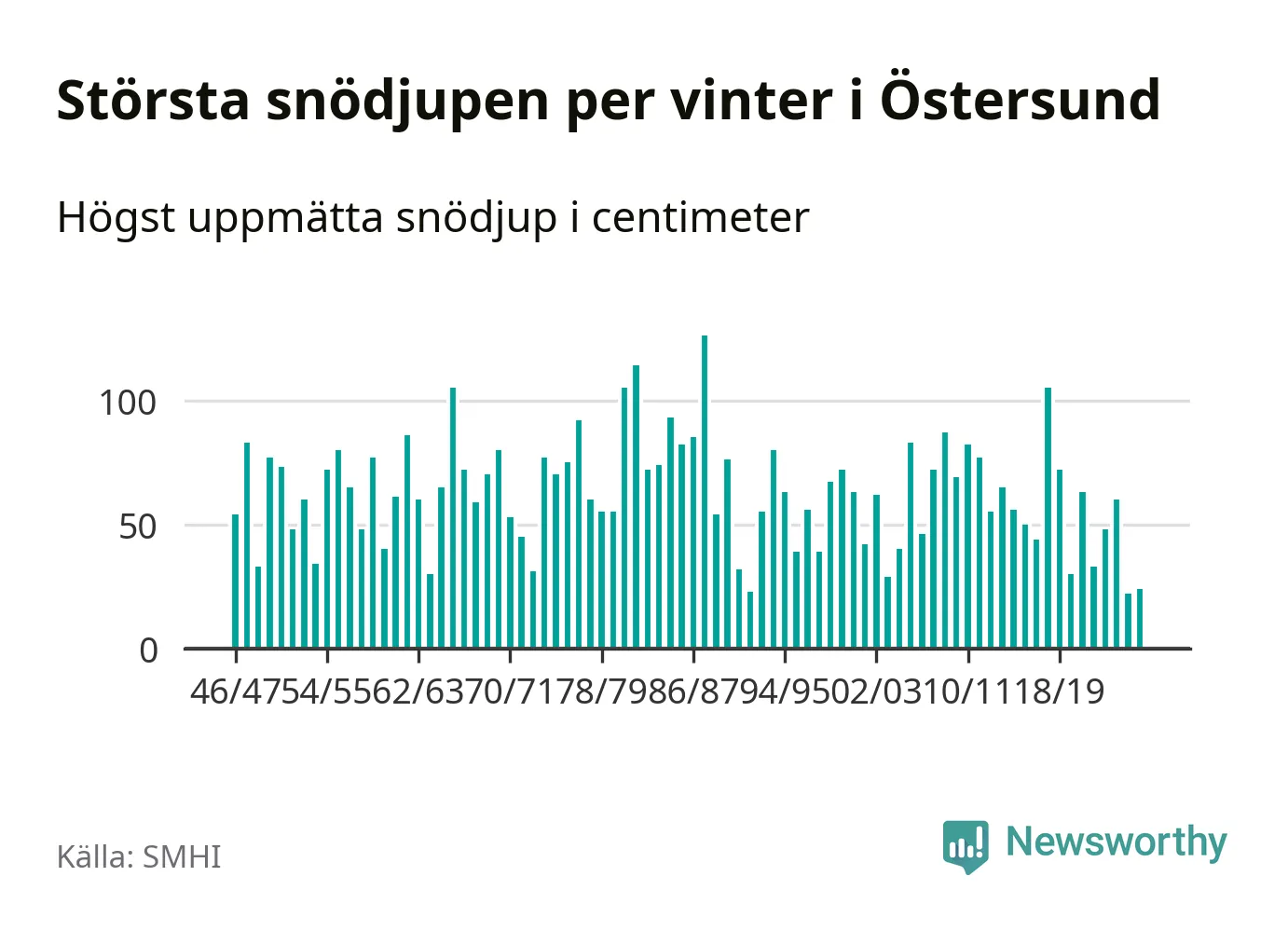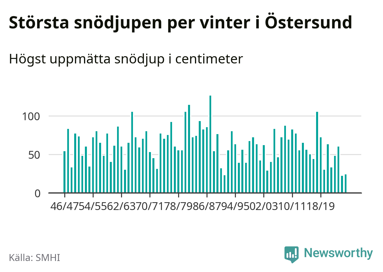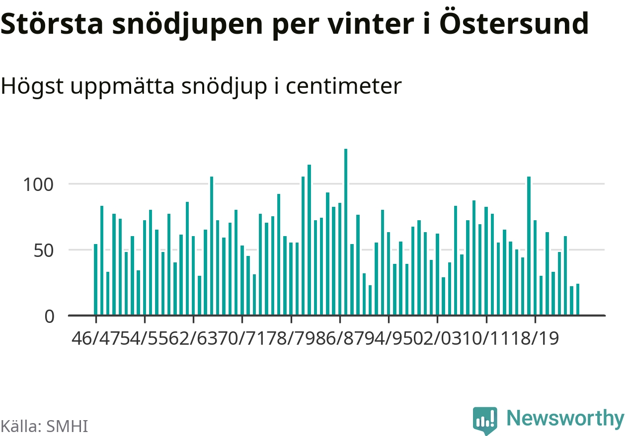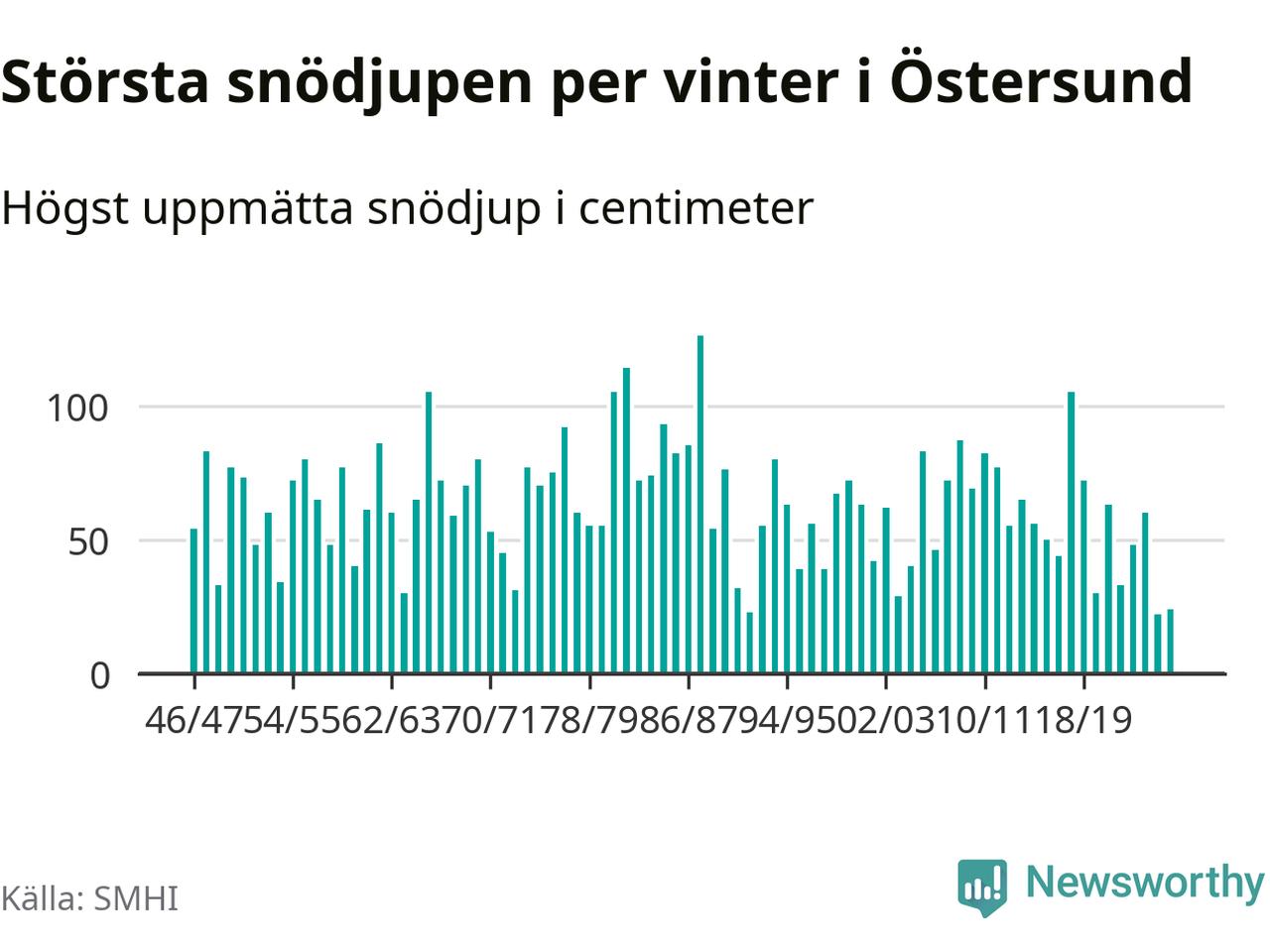 Men hur står sig det snödjupet historiskt sett? Newsworthy har tittat på det största snödjup som SMHI har uppmätt i Östersunds kommun varje år sedan vintern 1946/47 – och hittills tar sig årets vinter inte in bland de 25 vintrarna med störst uppmätt snödjup i kommunen.