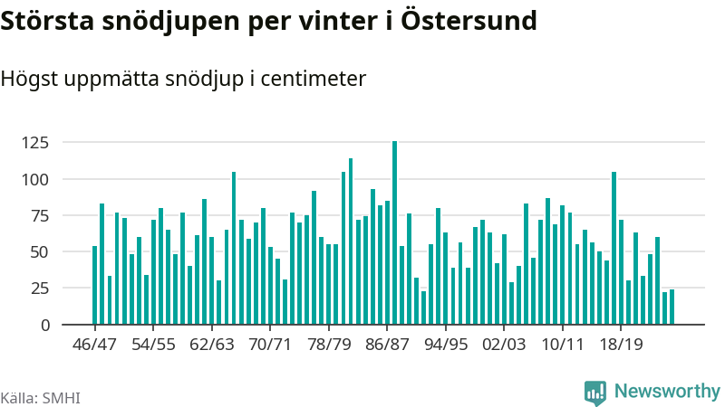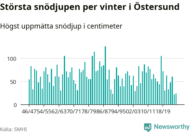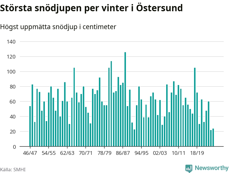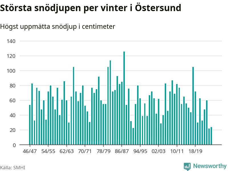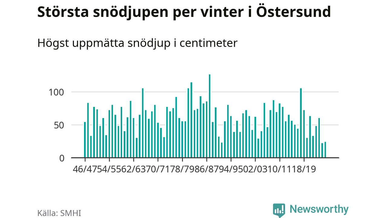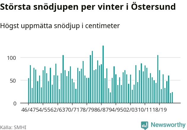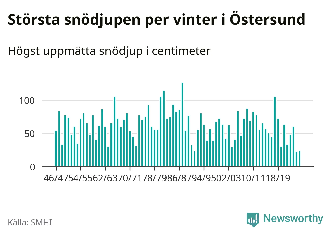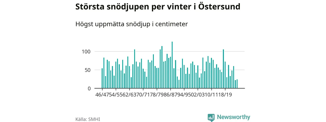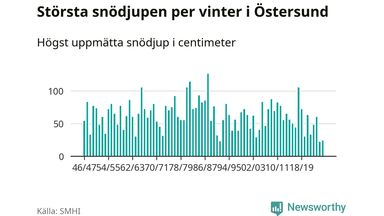 Men hur står sig det snödjupet historiskt sett? Newsworthy har tittat på det största snödjup som SMHI har uppmätt i Östersunds kommun varje år sedan vintern 1946/47 – och hittills tar sig årets vinter inte in bland de 25 vintrarna med störst uppmätt snödjup i kommunen.
