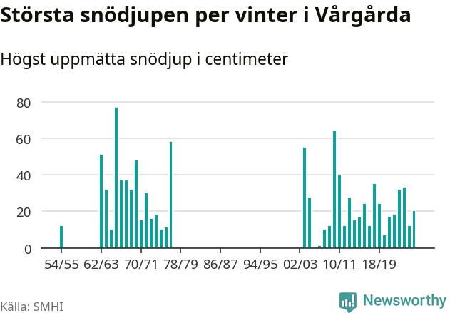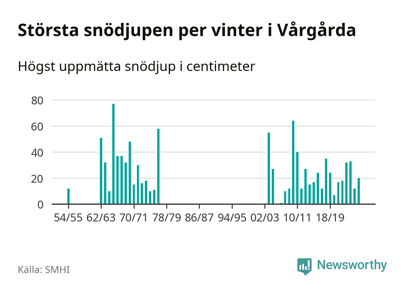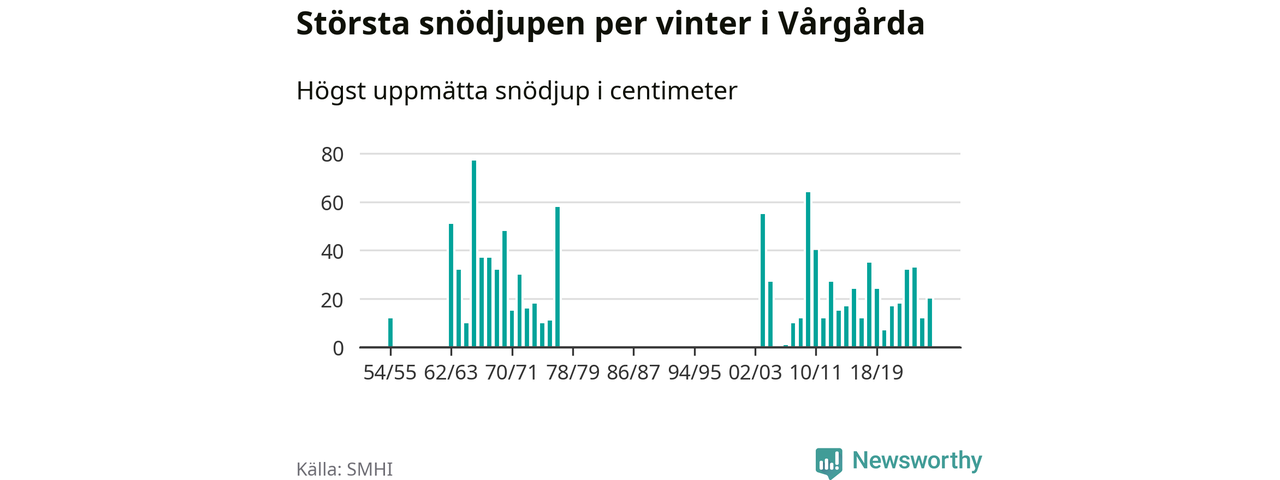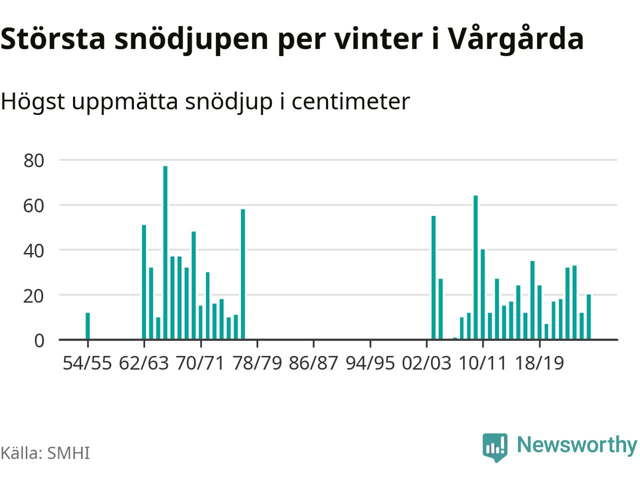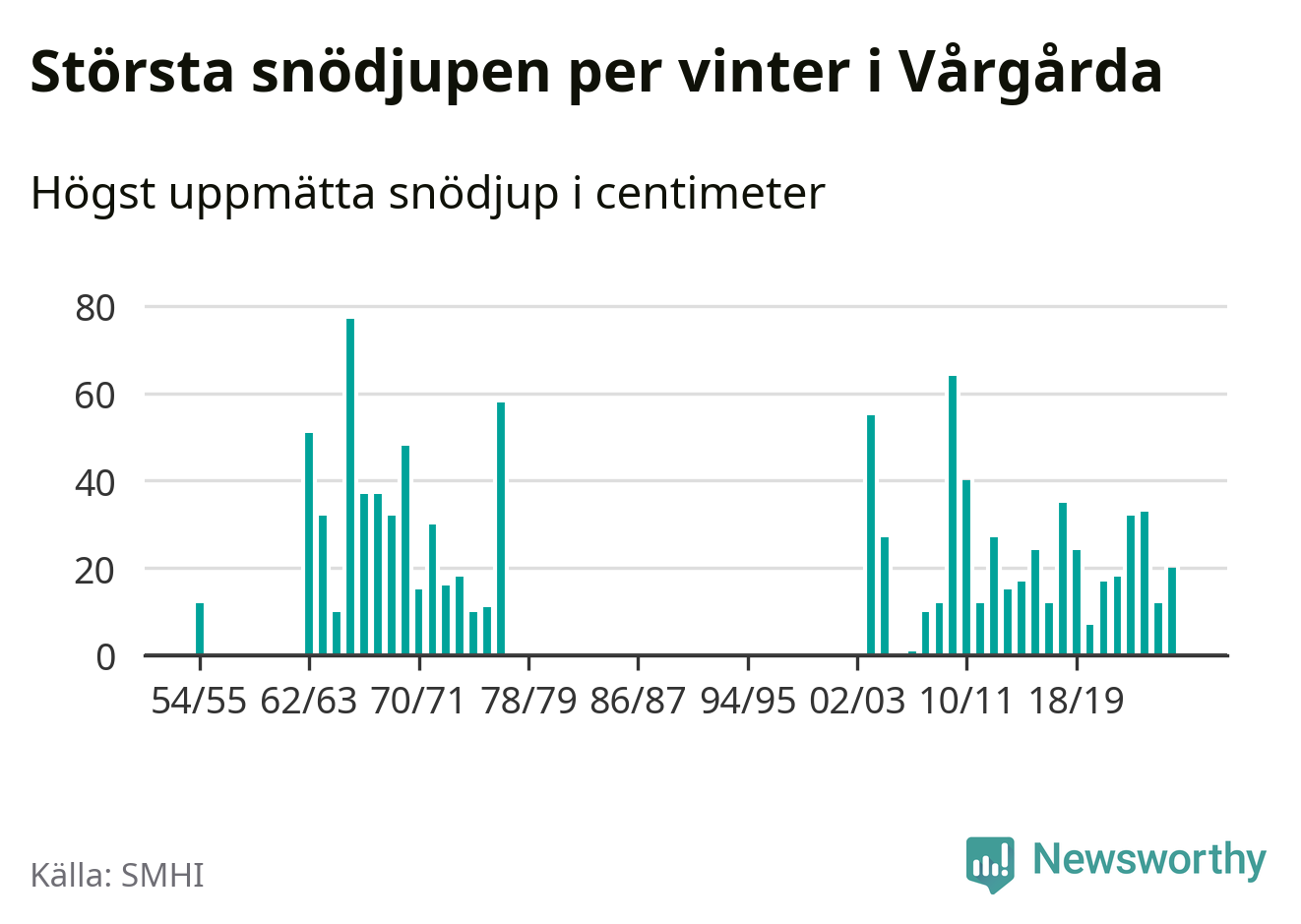 Men hur står sig det snödjupet historiskt sett? Newsworthy har tittat på det största snödjup som SMHI har uppmätt i Vårgårda kommun varje år sedan vintern 1954/55. 19 vintrar har det uppmätts större snödjup. Det ska sägas att det inte finns några noteringar för åren 1956–1962, 1978–2003 och 2006.