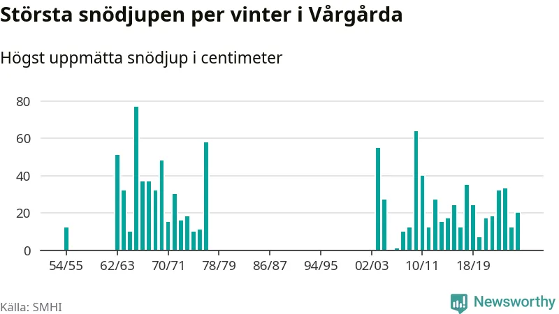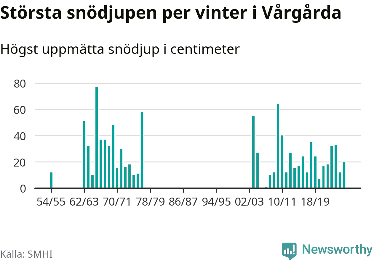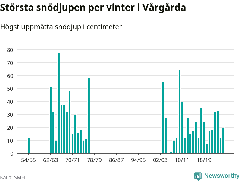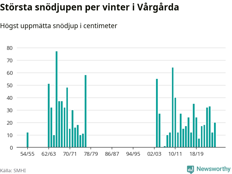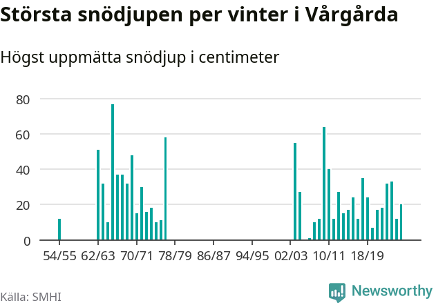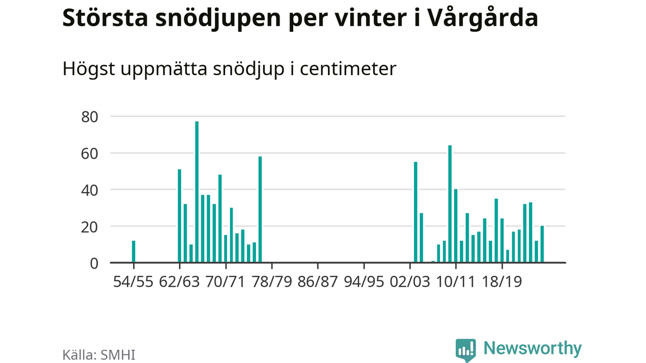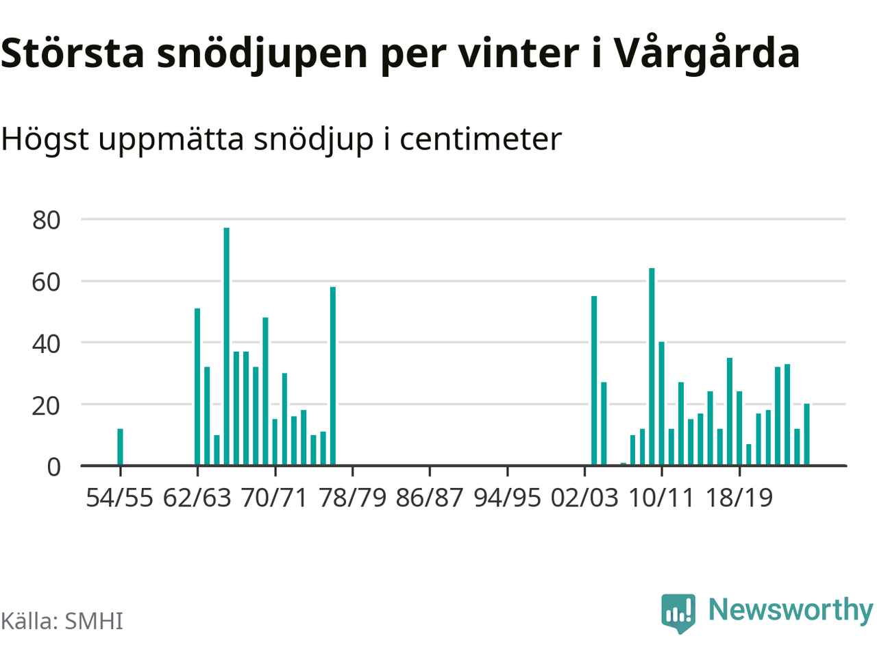 Men hur står sig det snödjupet historiskt sett? Newsworthy har tittat på det största snödjup som SMHI har uppmätt i Vårgårda kommun varje år sedan vintern 1954/55. 19 vintrar har det uppmätts större snödjup. Det ska sägas att det inte finns några noteringar för åren 1956–1962, 1978–2003 och 2006.