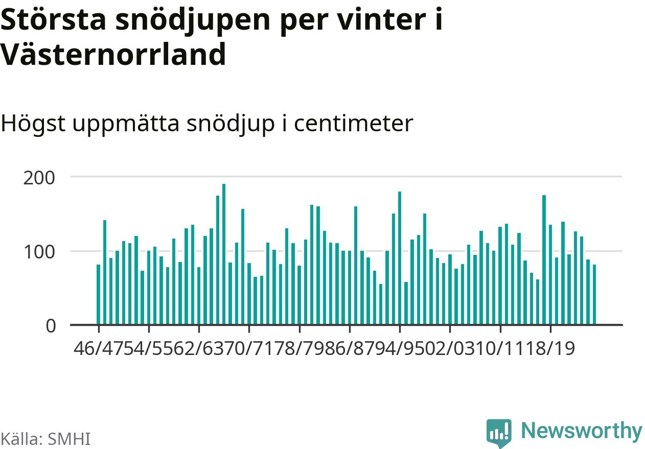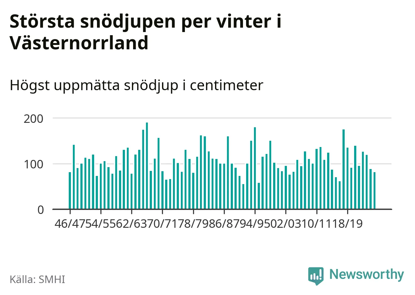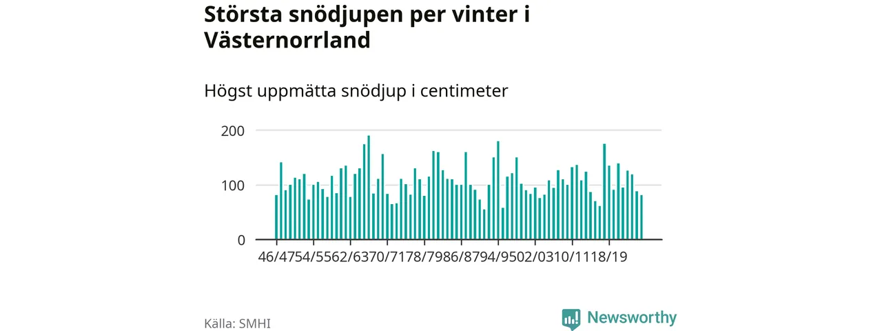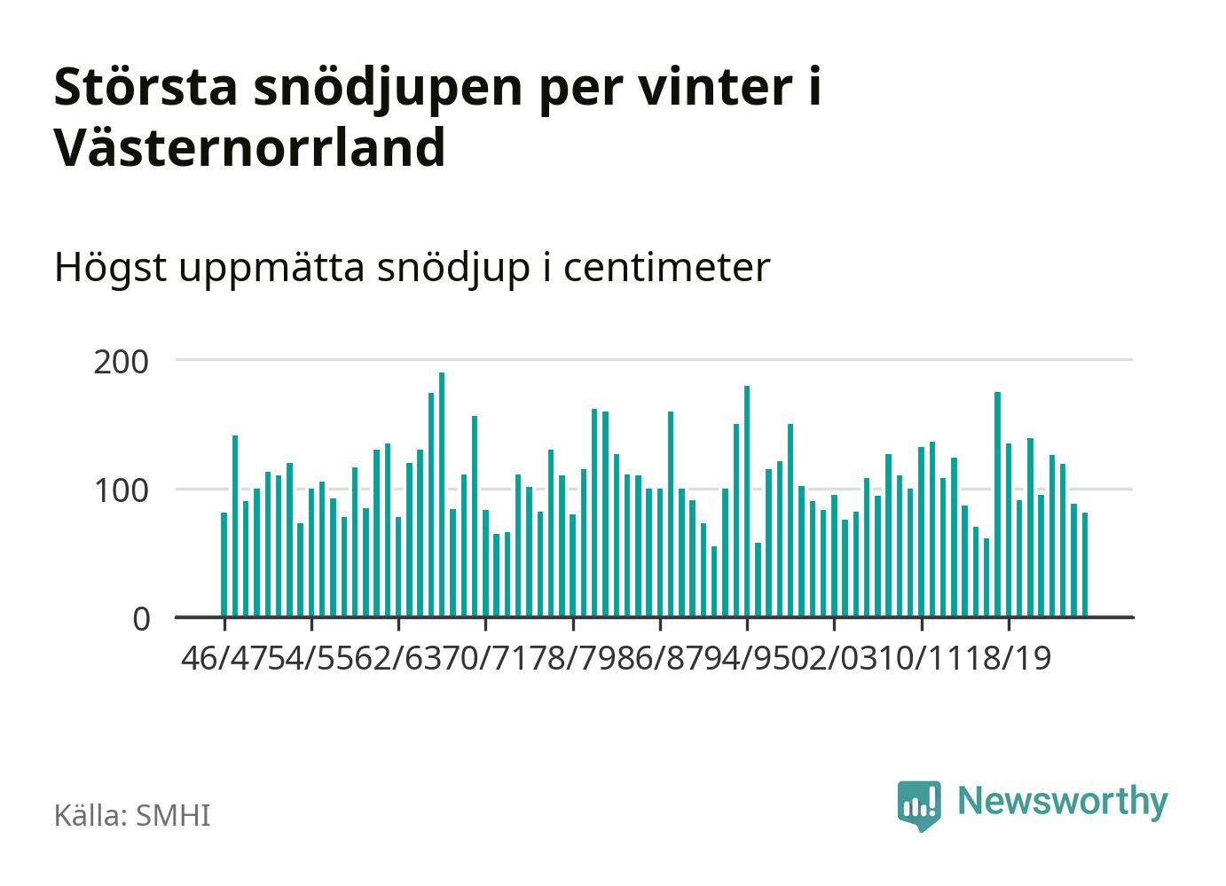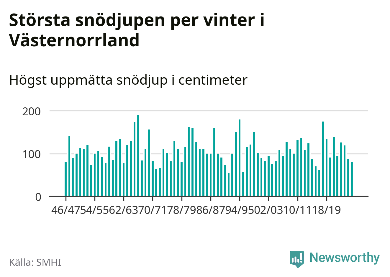 Men hur står sig det snödjupet historiskt sett? Newsworthy har tittat på det största snödjup som SMHI har uppmätt i Västernorrlands län varje år sedan vintern 1946/47 – och hittills tar sig årets vinter inte in bland de 25 vintrarna med störst uppmätt snödjup i länet.