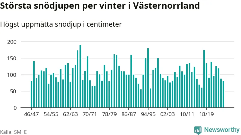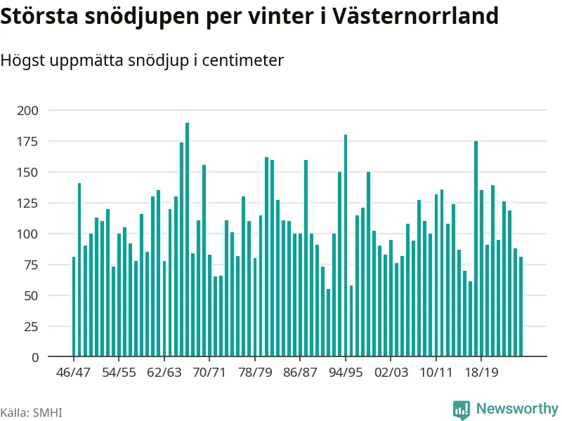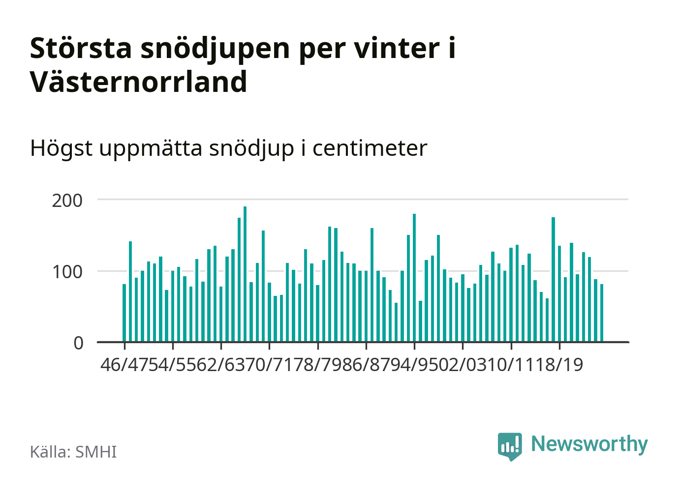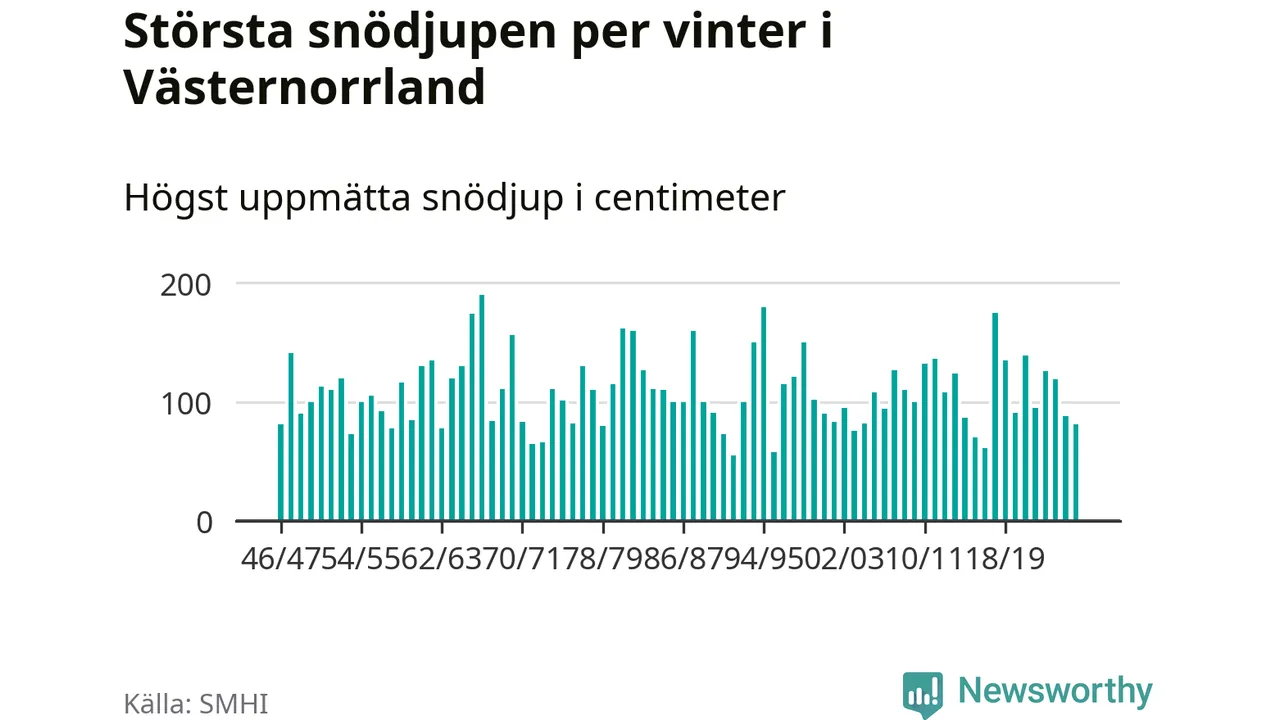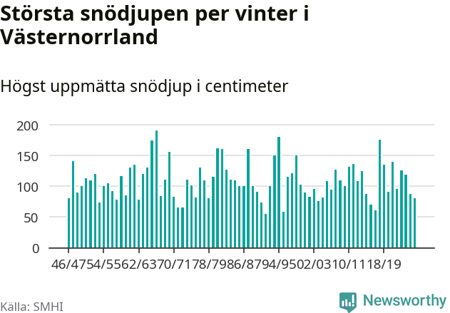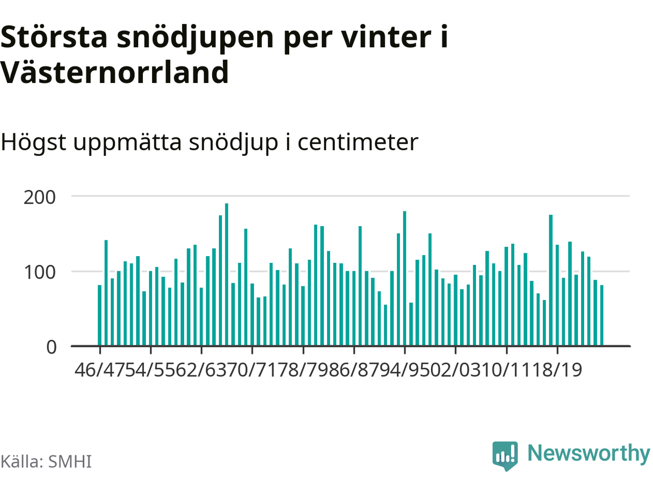 Men hur står sig det snödjupet historiskt sett? Newsworthy har tittat på det största snödjup som SMHI har uppmätt i Västernorrlands län varje år sedan vintern 1946/47 – och hittills tar sig årets vinter inte in bland de 25 vintrarna med störst uppmätt snödjup i länet.