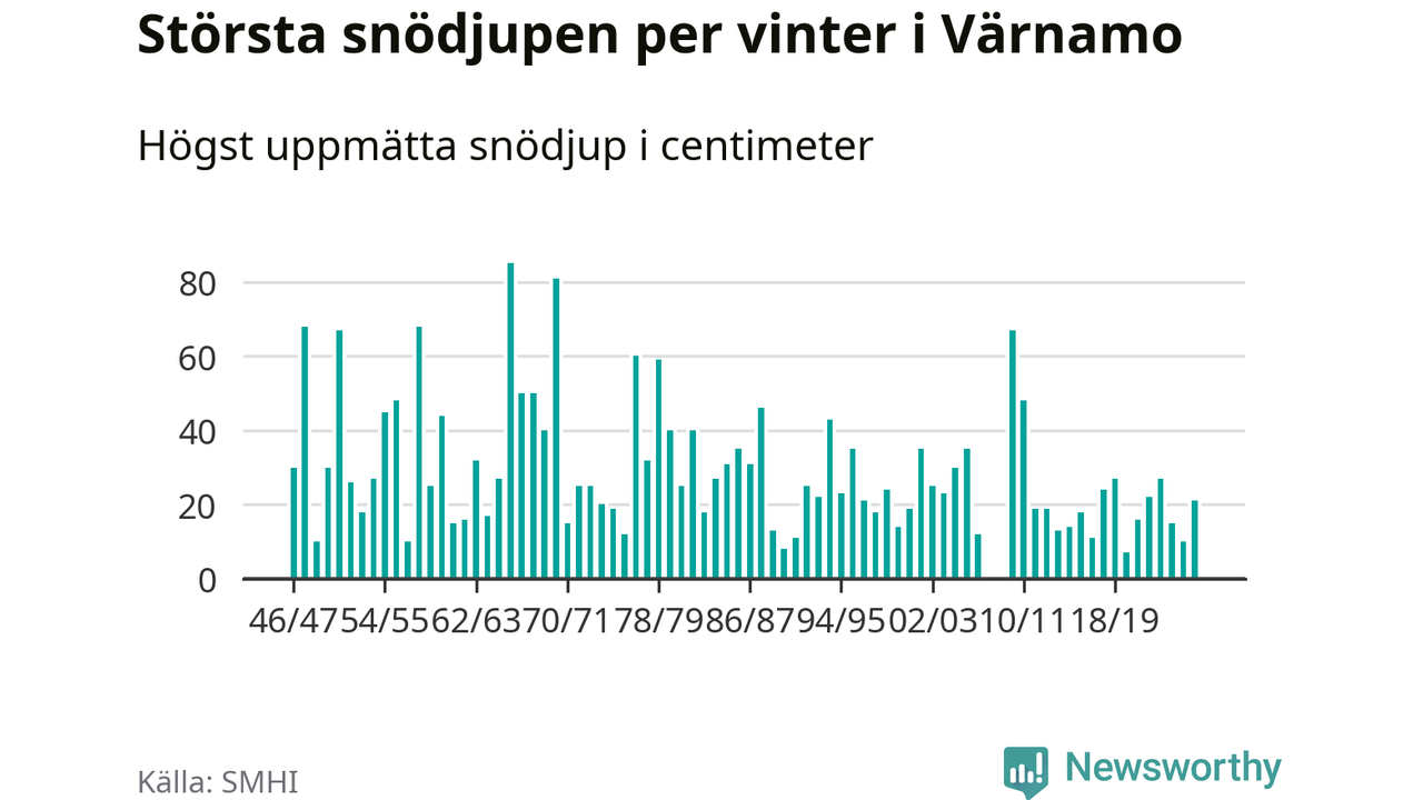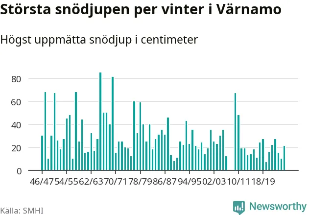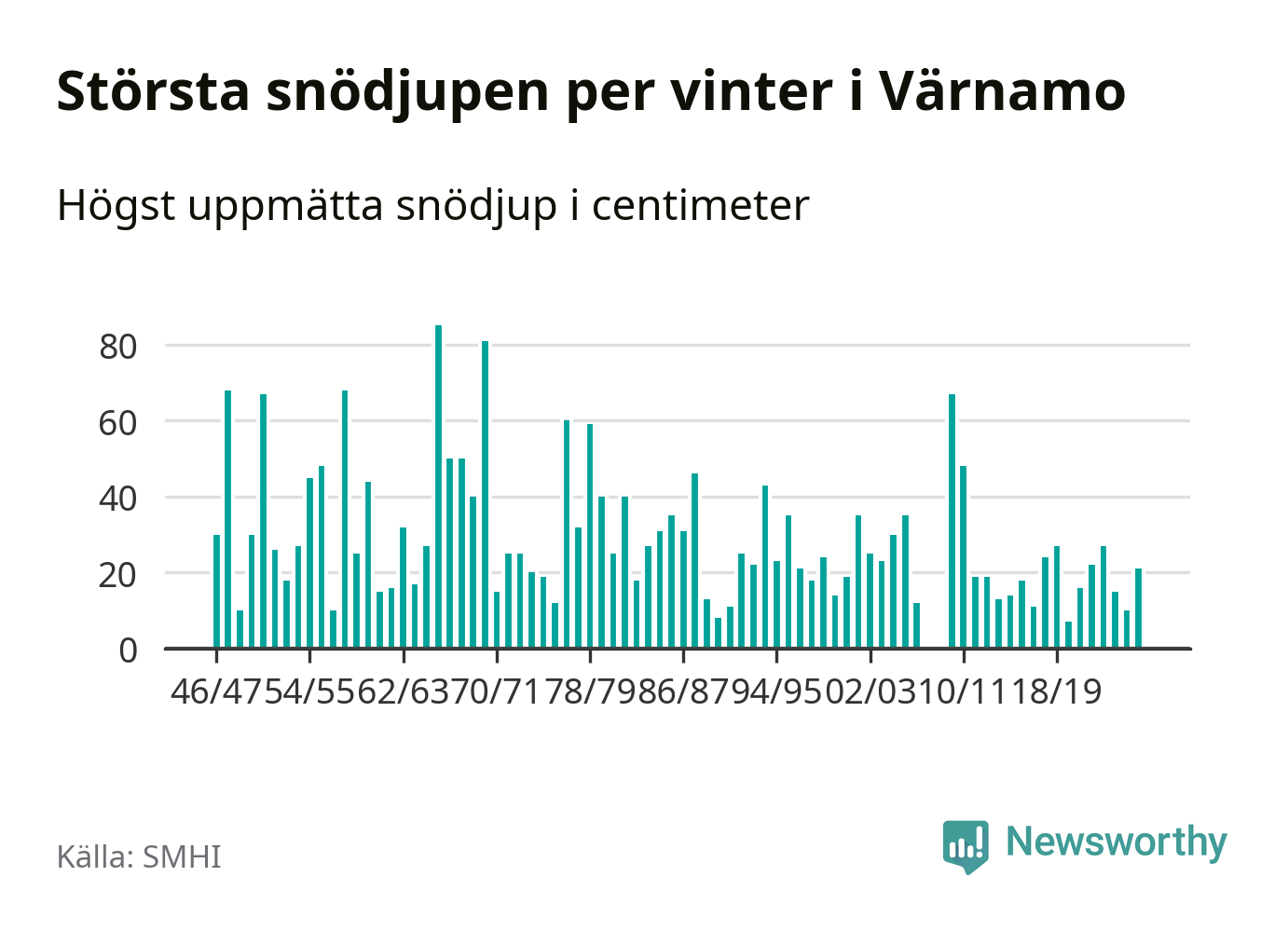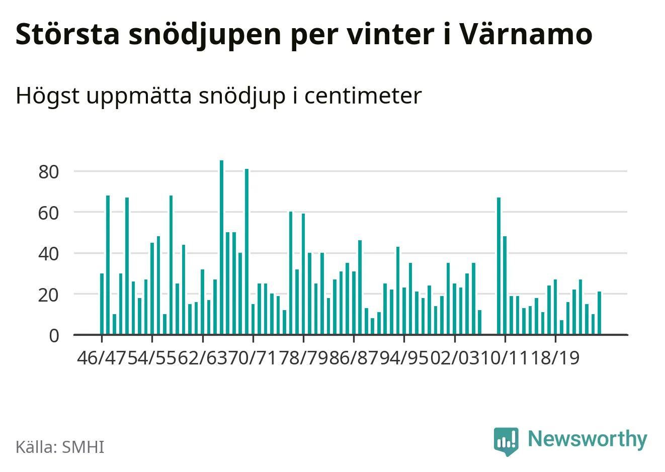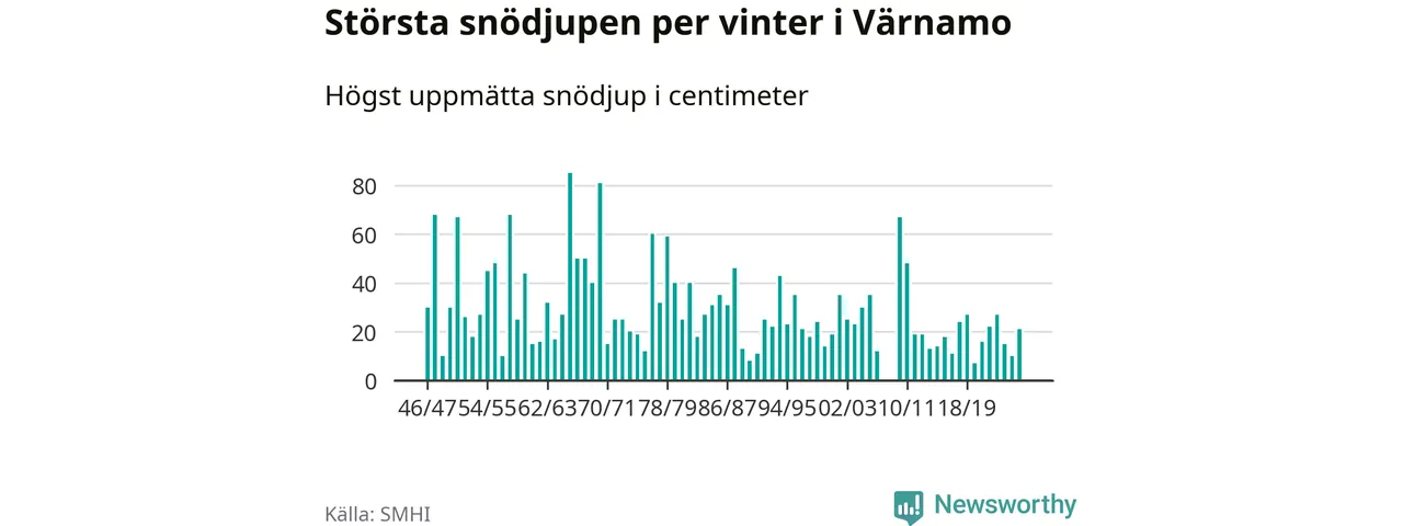 Men hur står sig det snödjupet historiskt sett? Newsworthy har tittat på det största snödjup som SMHI har uppmätt i Värnamo kommun varje år sedan vintern 1946/47 – och hittills tar sig årets vinter inte in bland de 25 vintrarna med störst uppmätt snödjup i kommunen.